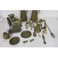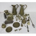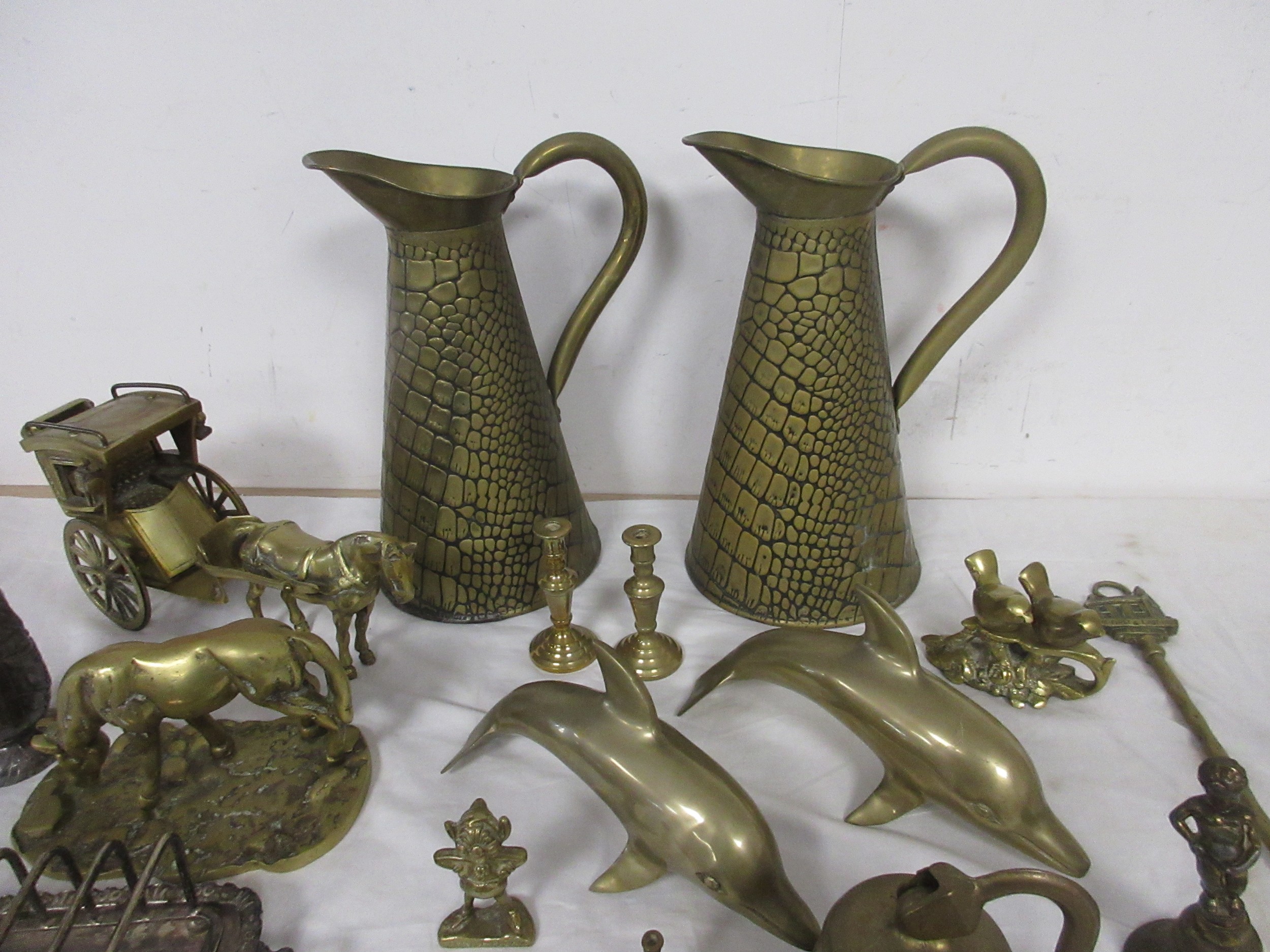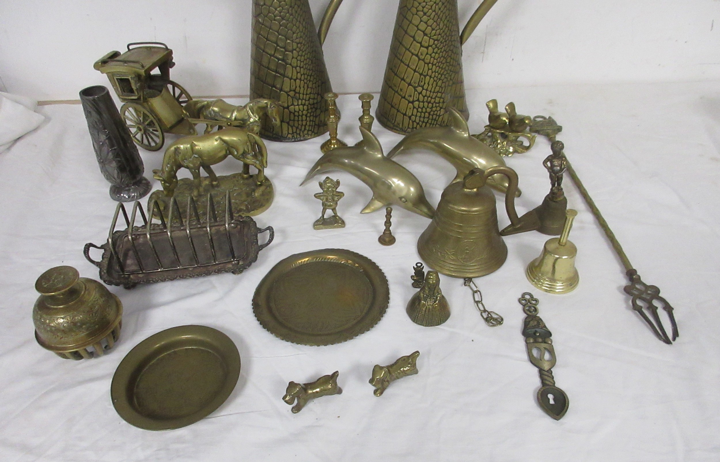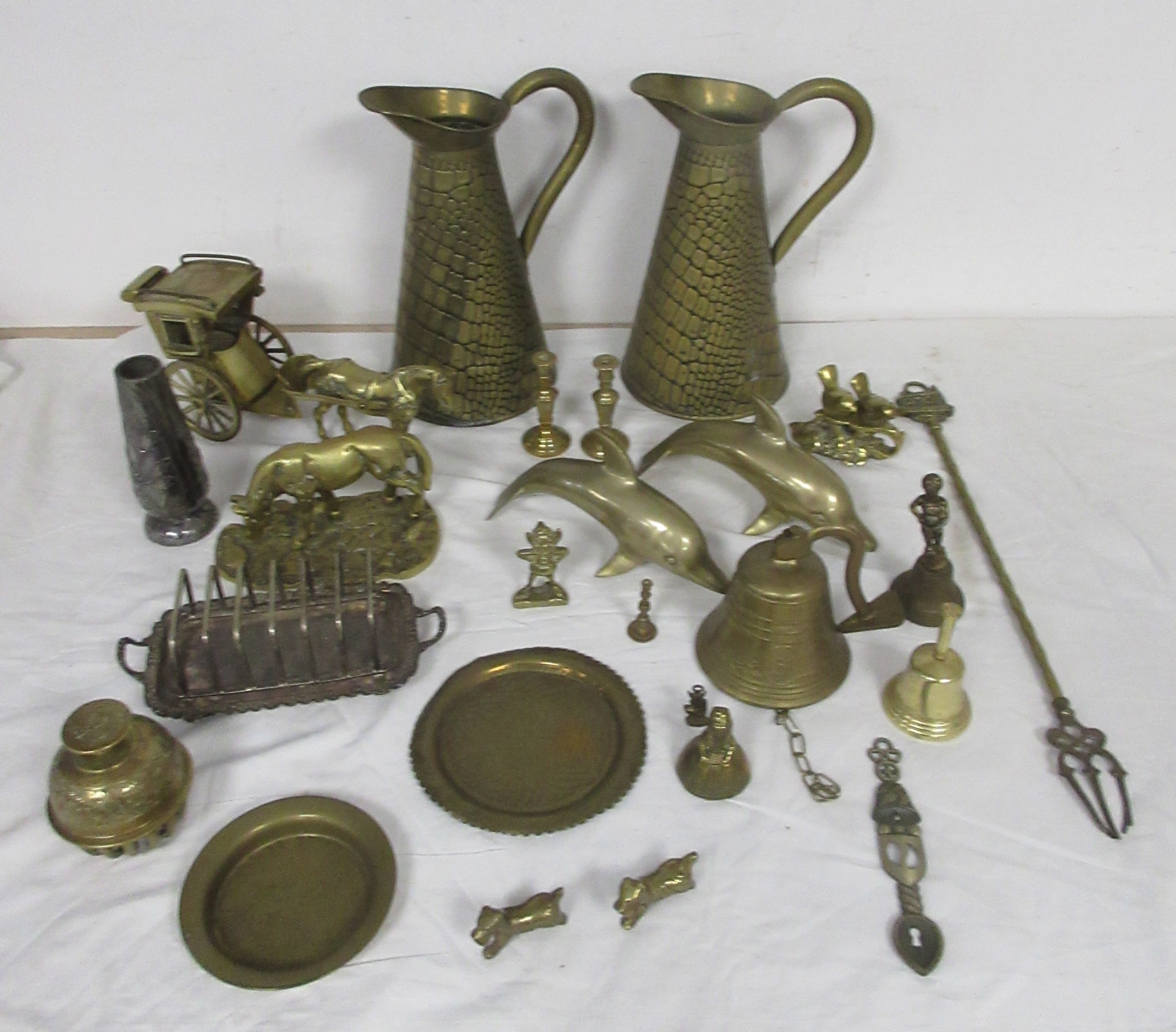 Assorted brass and metal ware, including brass jugs, bells, dolphins, horse and carriage, toasting fork, dog figures, etc