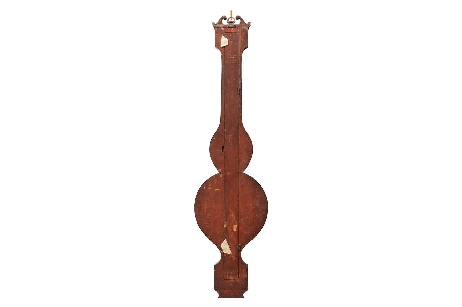 A late George III mahogany banjo barometer, Deacon of Barton in the Beans, with ebony and boxwood stringing, the swan-neck pediment with ivory finial and roundels over a hygrometer, thermometer, convex mirror, silvered dial and spirit level signed 'Deacon Barton', 102 cm high. Ivory exemption certificate No. BQ6J6BPY From the estate of the late William John Thornton (1937-2025), of Groby, Leicestershire. Known as 'John' to his friends and family, he became interested in steam engines from an early age, and then traction engines and aircraft, before building an extensive knowledge and collection of clocks, notably early Lantern clocks and longcases. He was a very keen member of the Antiquarian Horological Society, and gave several lectures to their members at Keble College, Oxford. John was also a member of the Furniture Society in Groby village, and the Groby allotment Society, being chairman of the latter for over 30 years.