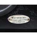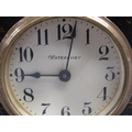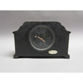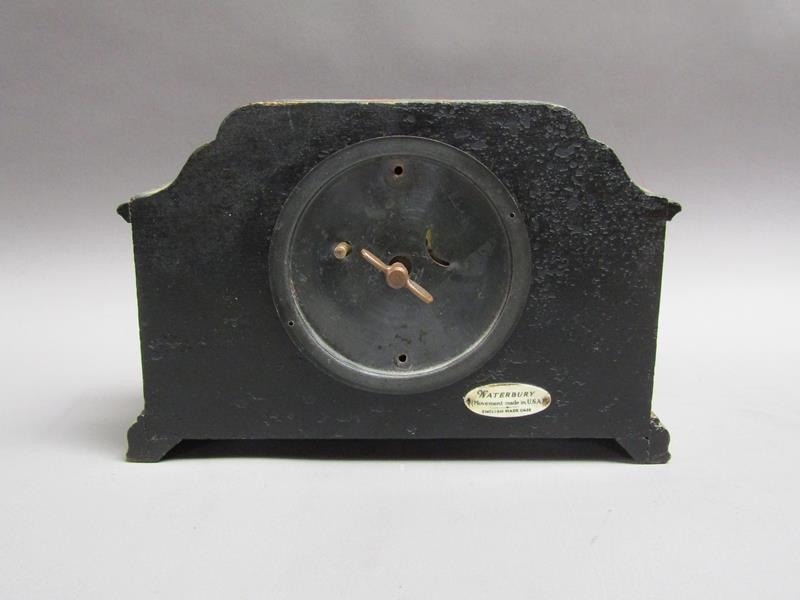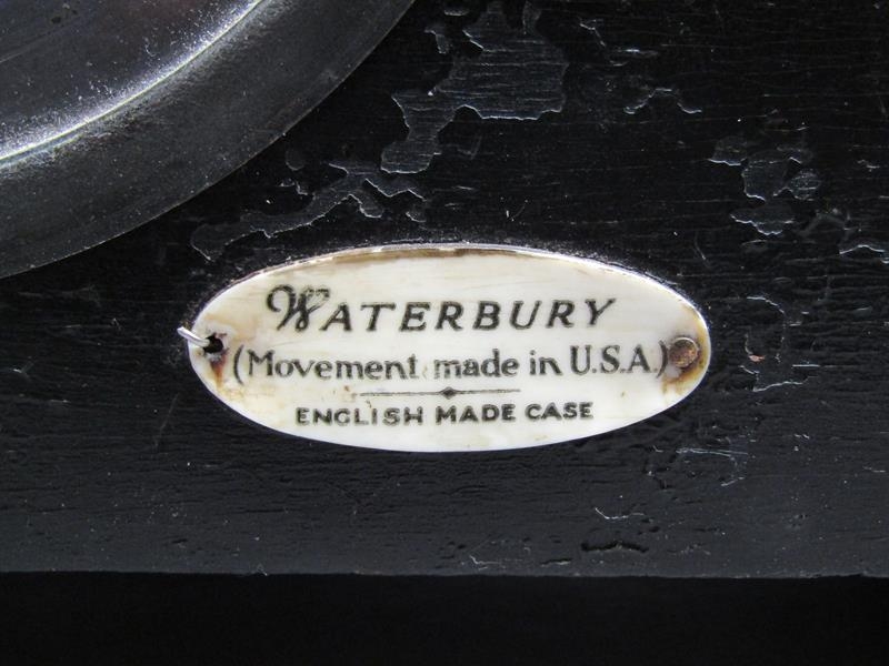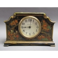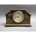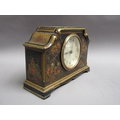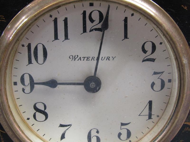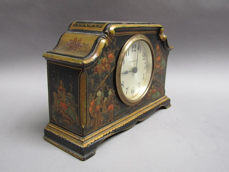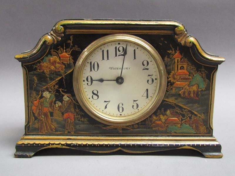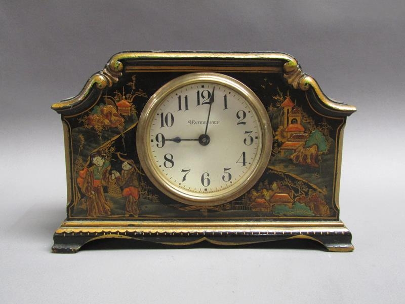 An early 20c American mantel clock by Waterbury in English chinoiserie lacquered case, the single train movement having a lever escapement and open main spring. The silvered 9cm diam. dial has arabic numerals and the case is of black lacquer with gilt and red designs and stands 16cm tall overall.