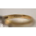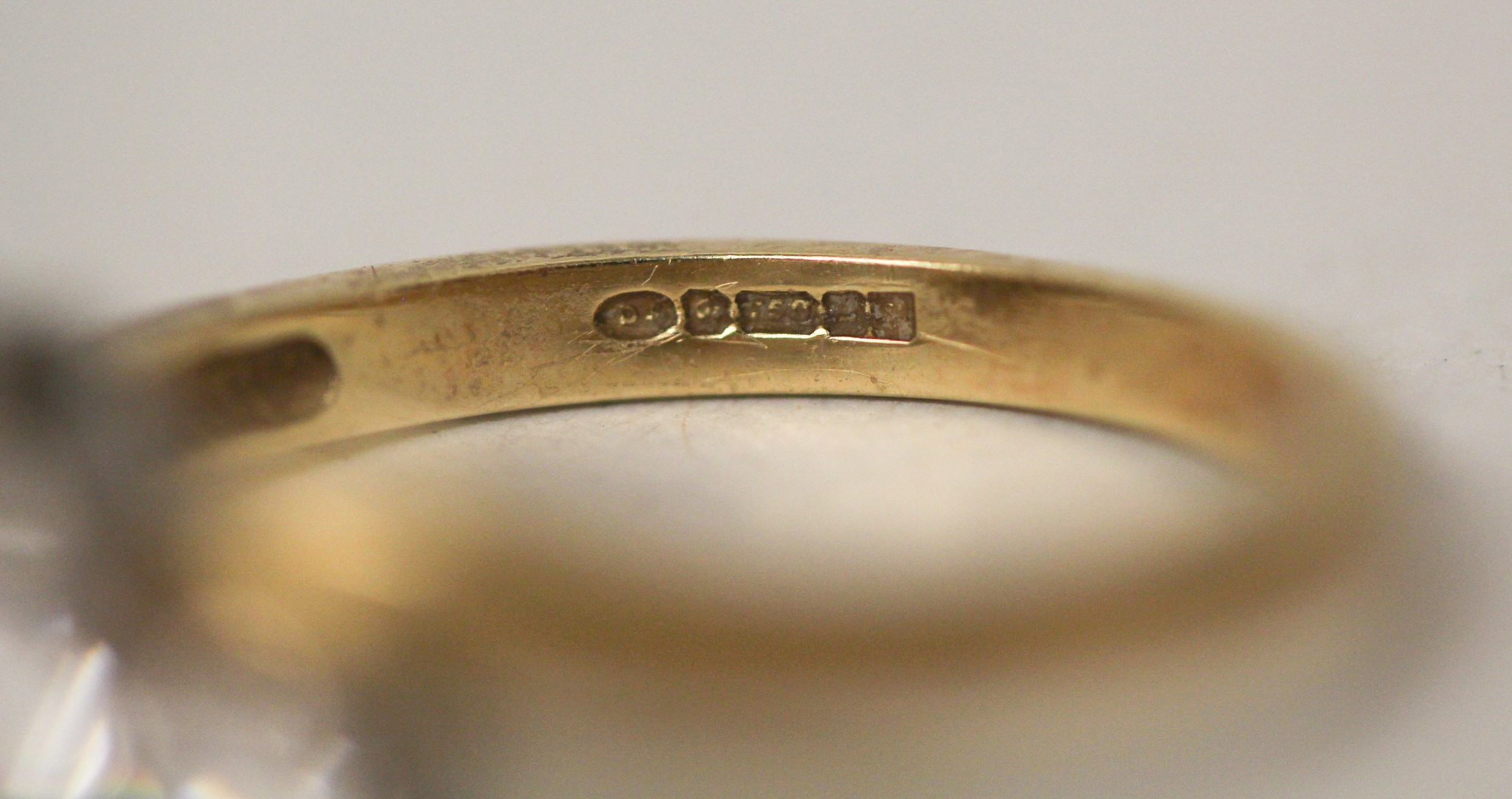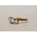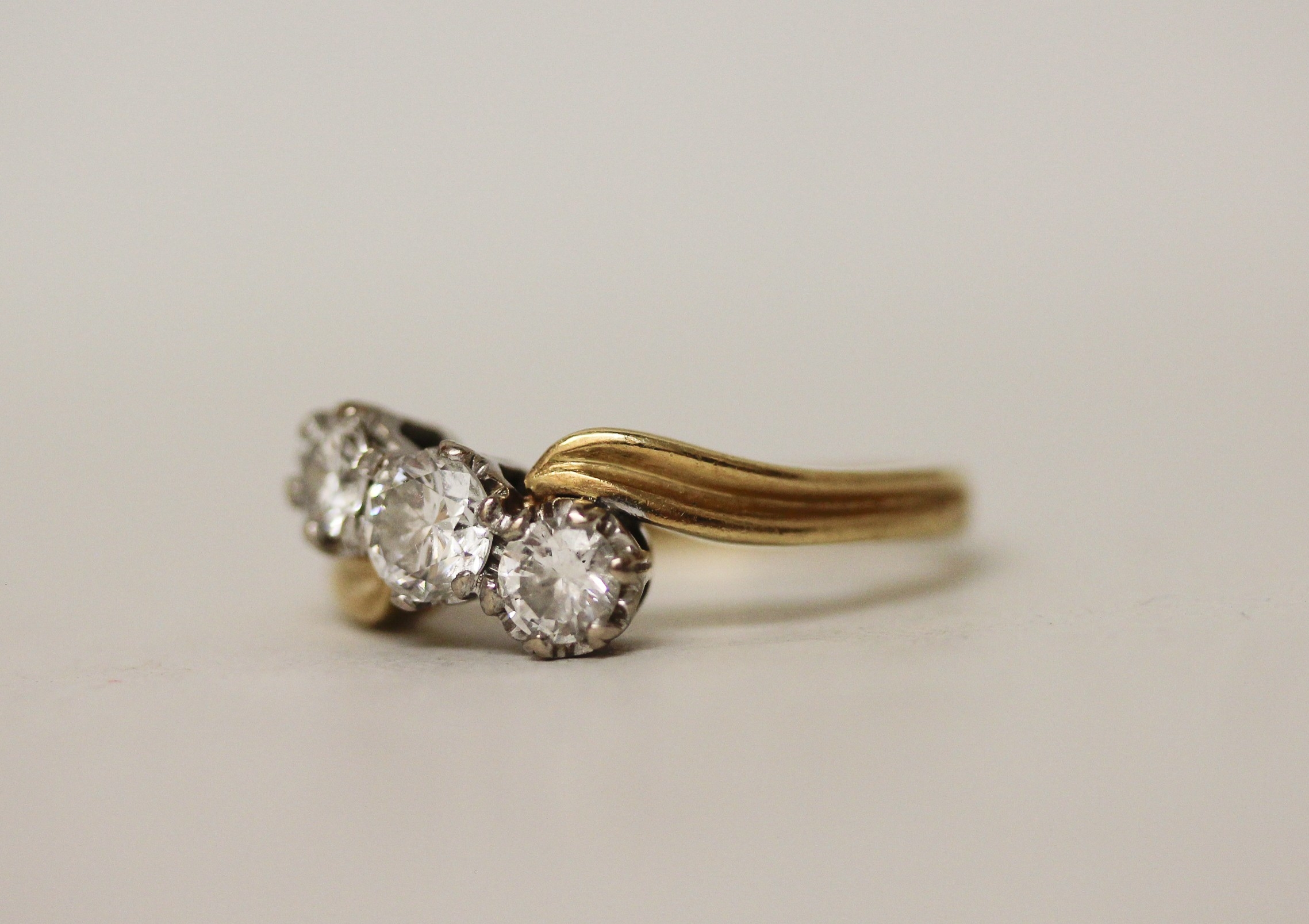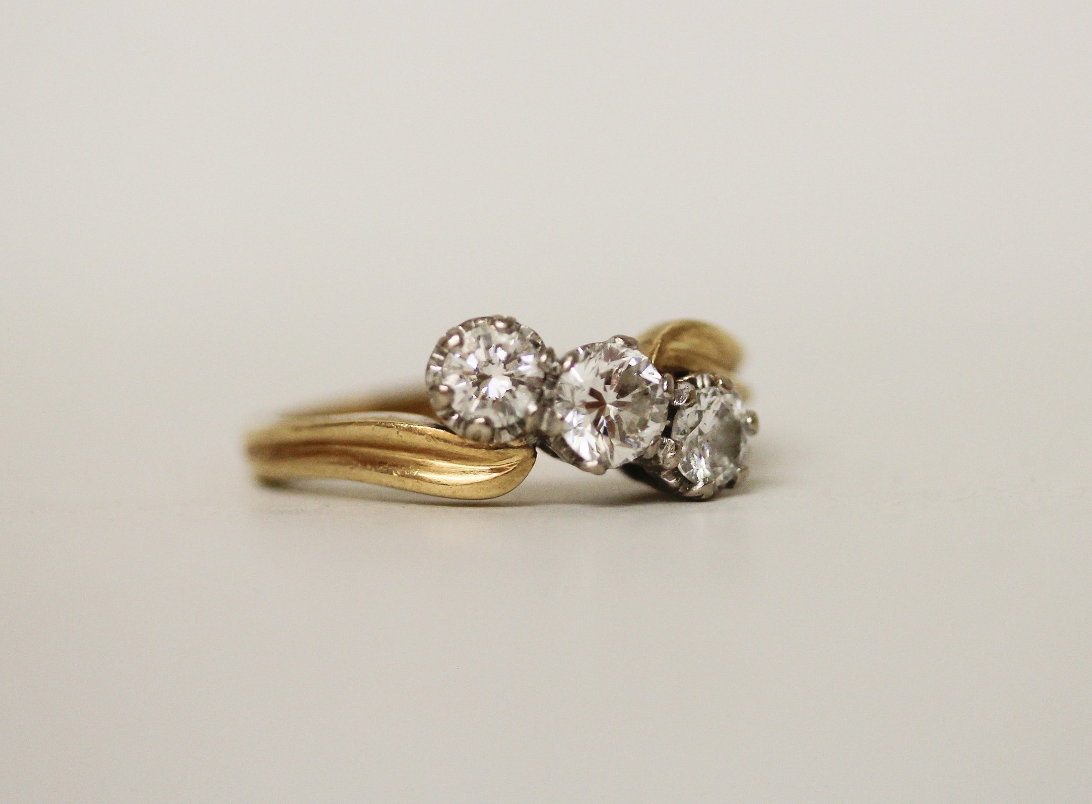 A three stone diamond ring, the three brilliant cut diamonds claw set in a offset cross over twist design, on hallmarked 18ct yellow gold band. Ring size Q, gross weight 5.8g