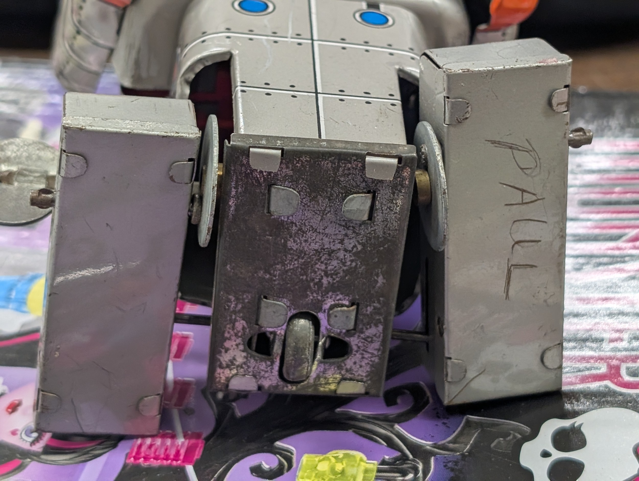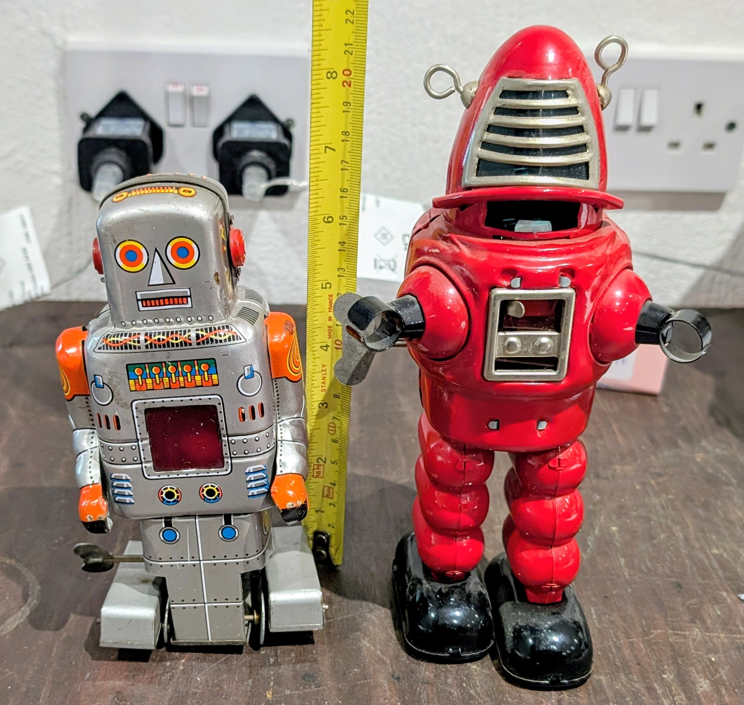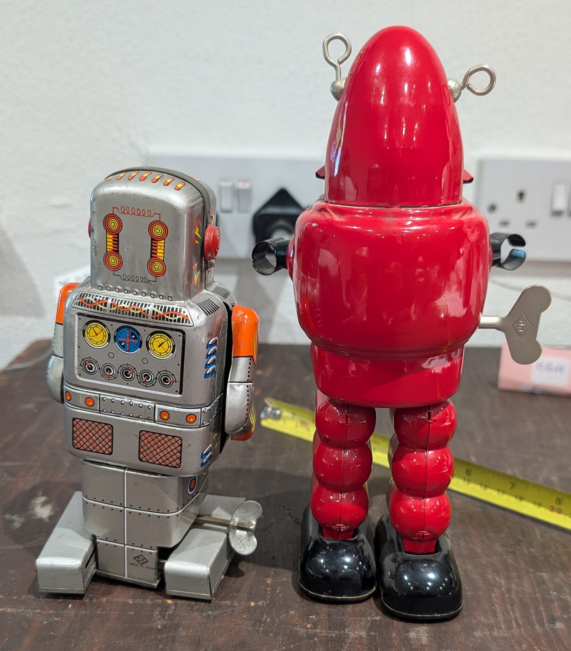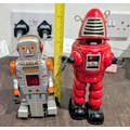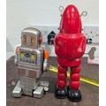 A Pair of 9" & 7" Japanese Tin-Plate Wind-Up Robots: An HH 'Planet Robot' and an S.Y. 'Sparky Robot', Mid-20th Century - Red one appears "over wound"