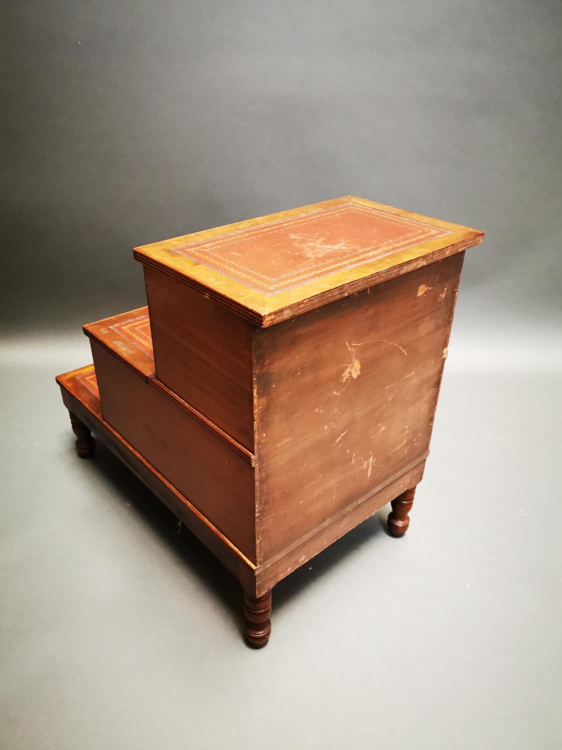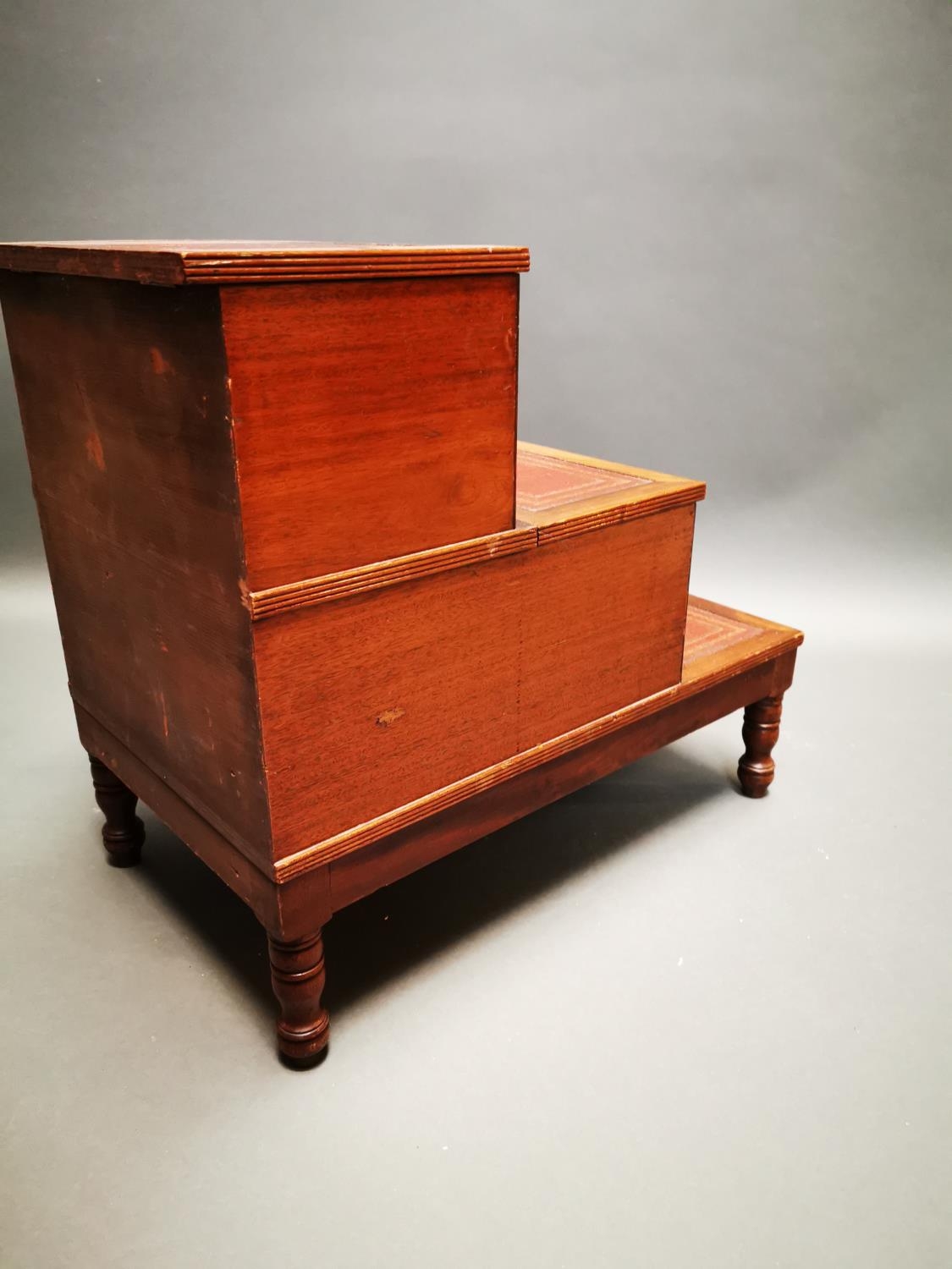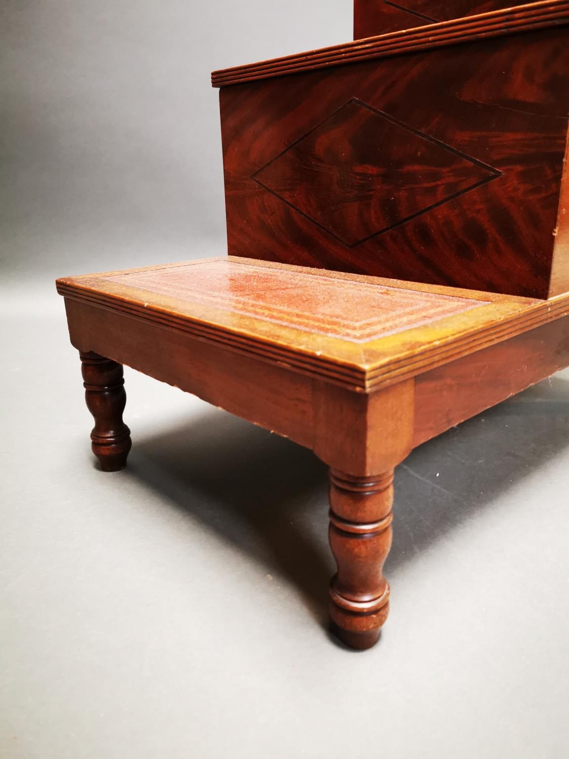 Victorian mahogany library steps with inset leather panels on turned legs {62 cm H x 42 cm W x 68 cm D}.