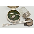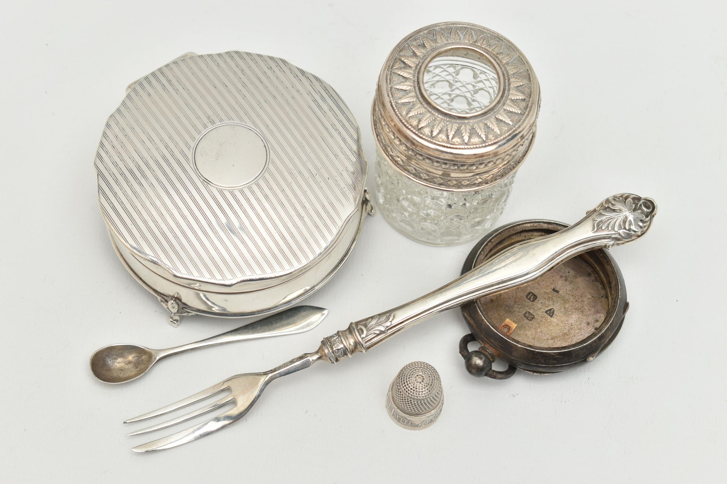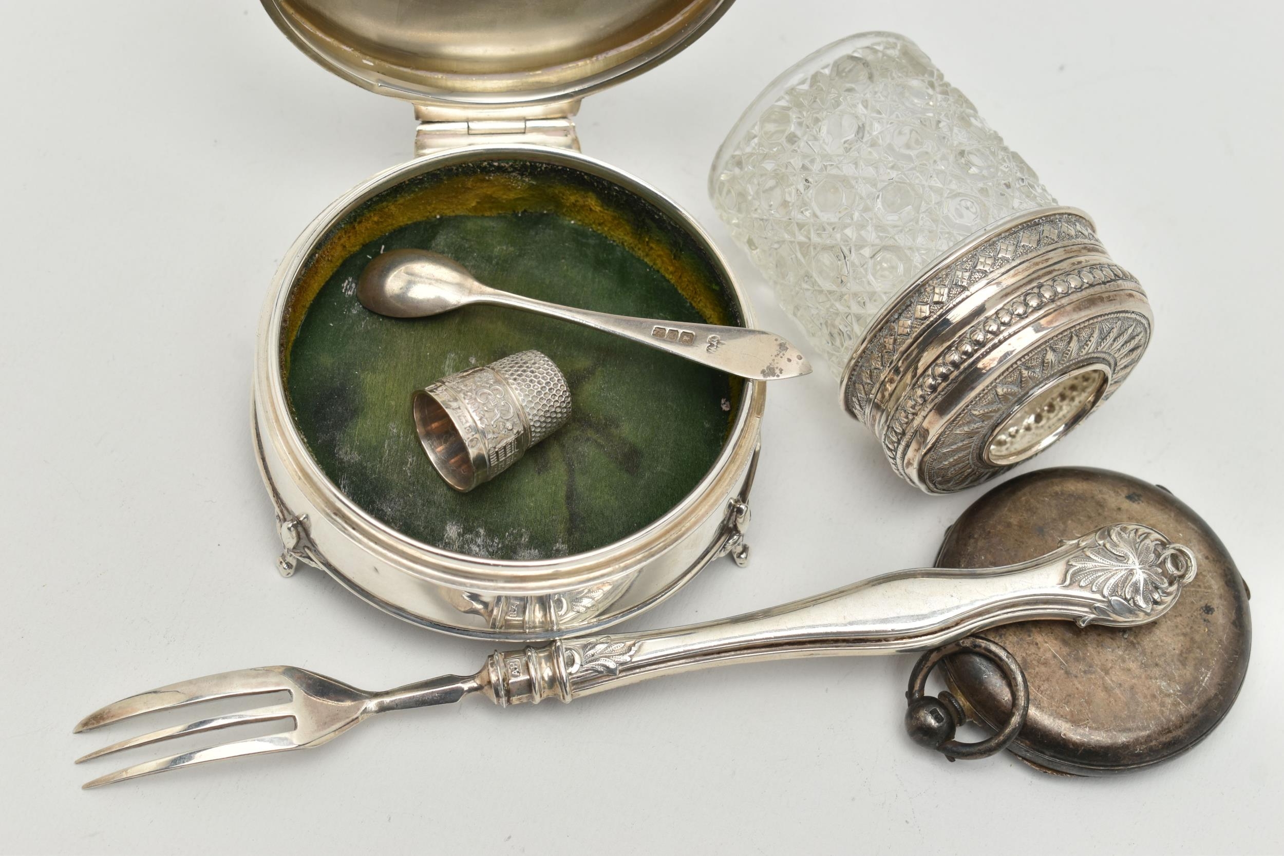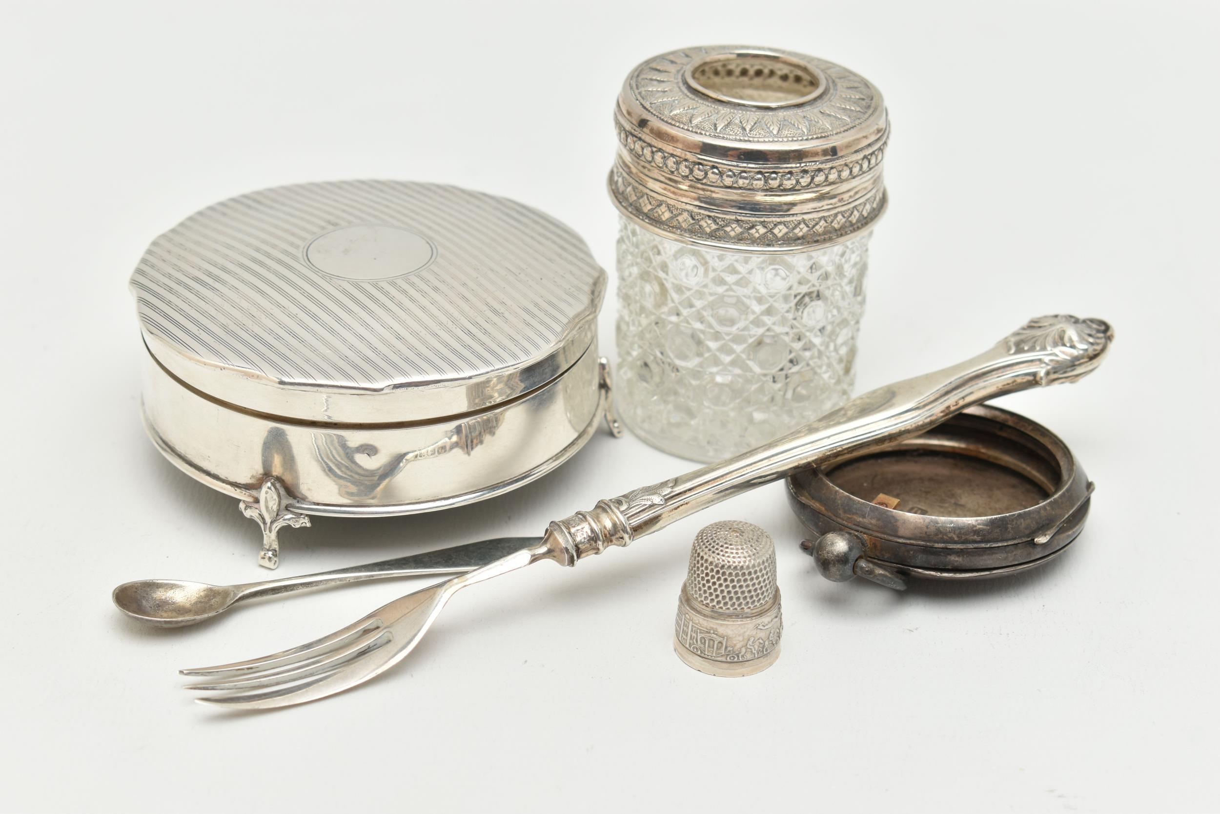 ASSORTED SILVER ITEMS, to include a circular, engine turned pattern trinket box, with vacant cartouche, raised on three scroll feet, hallmarked Birmingham, markers mark rubbed, approximate gross weight 158.6 grams, a silver open face pocket watch case, hallmarked Chester, approximate gross weight 55.7 grams, a Georgian silver pickle fork, salt spoon, thimble and a glass toilet jar with white metal cover (condition report: general light wear, pocket watch case is heavily tarnished)