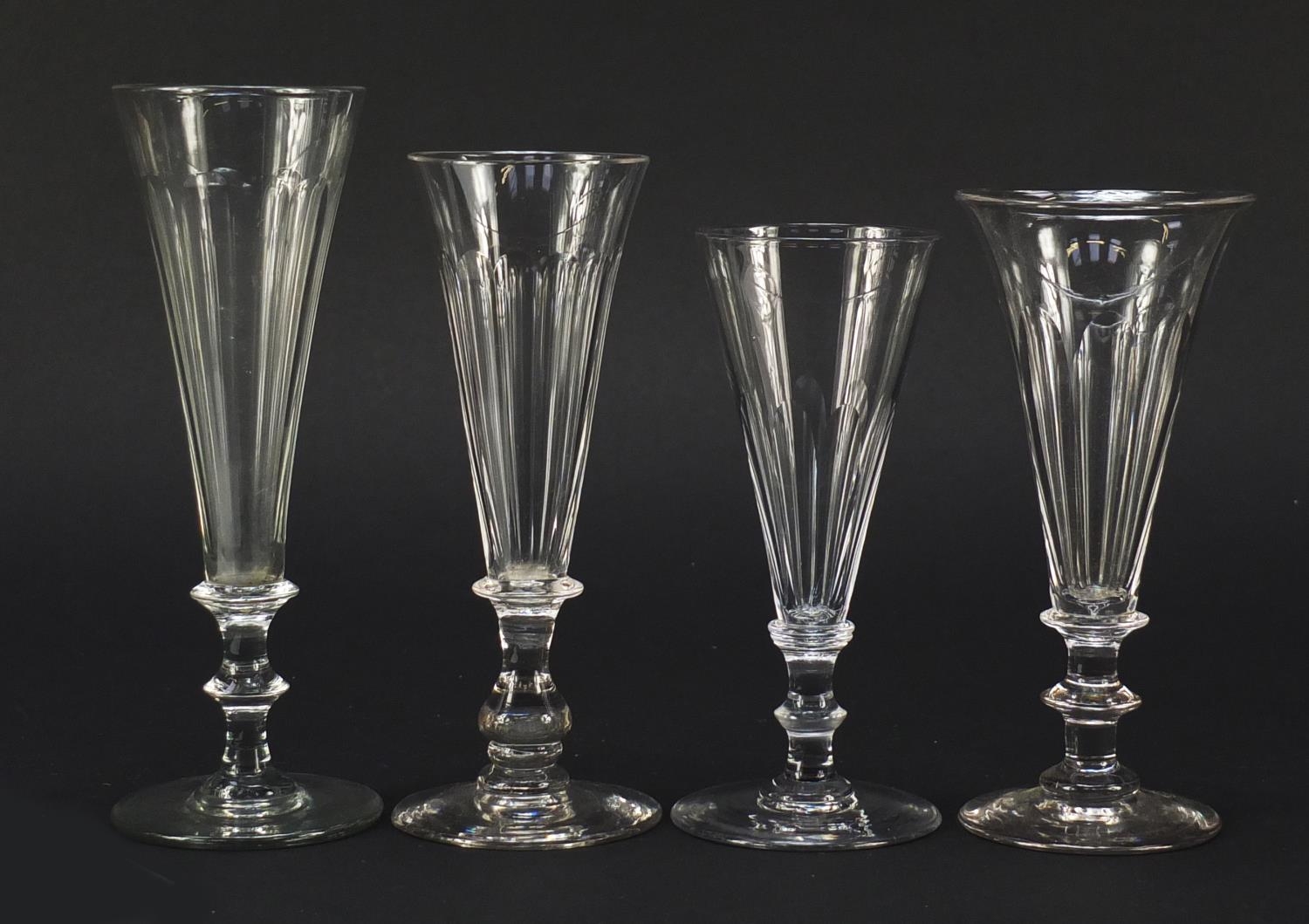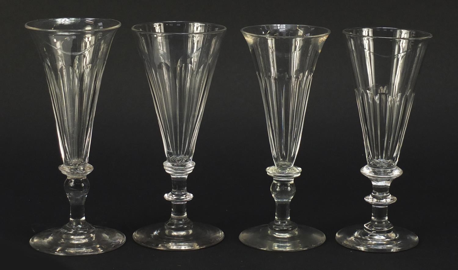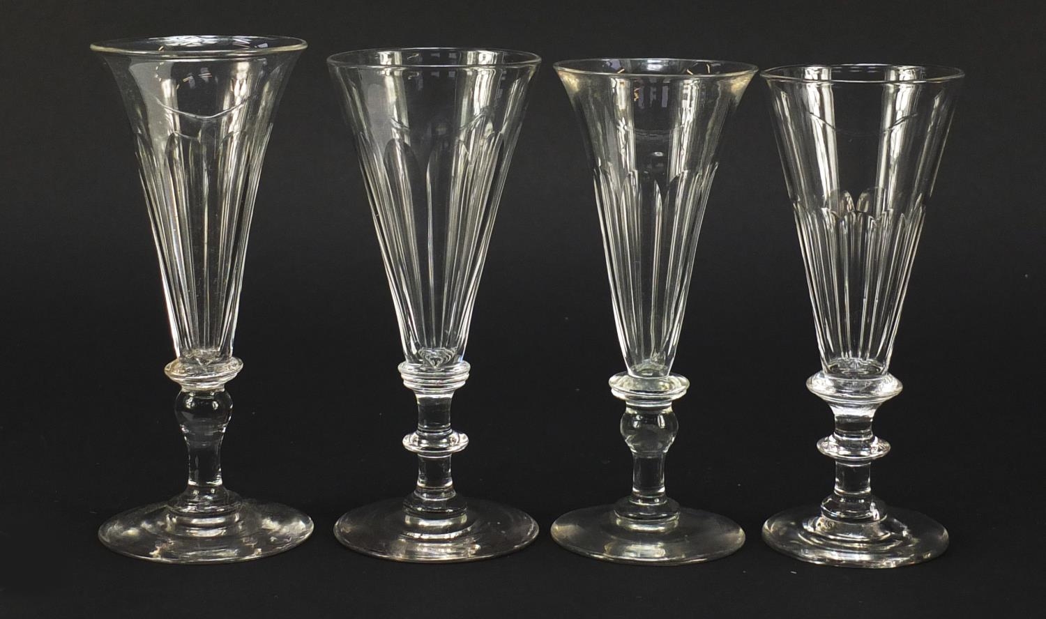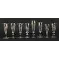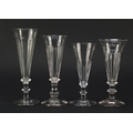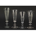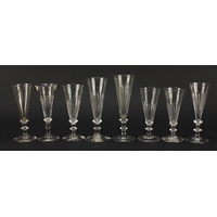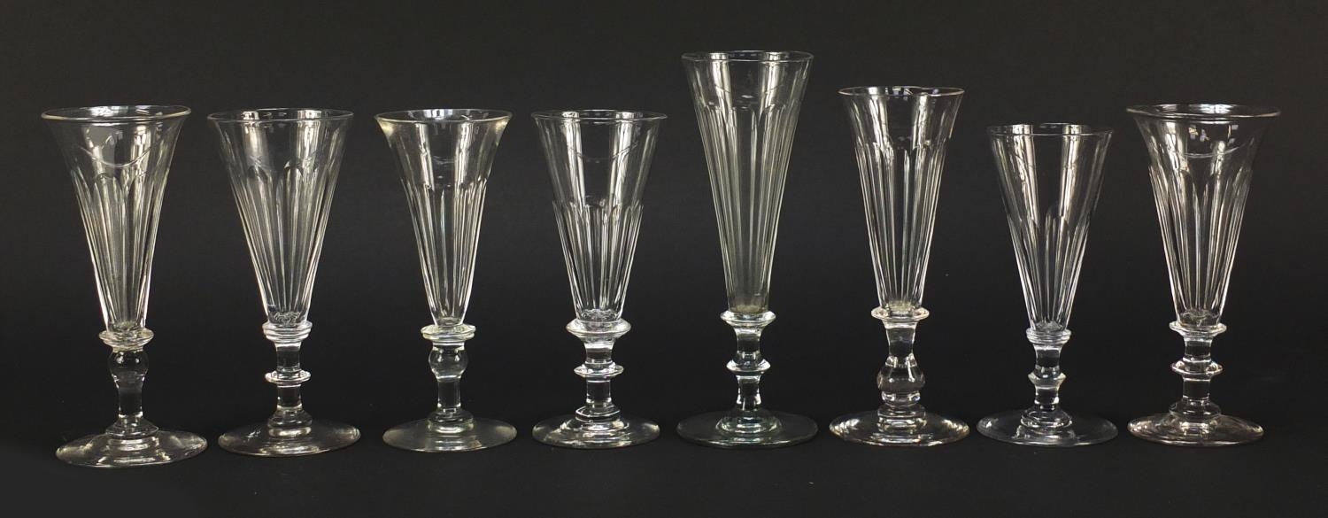 Eight 18th/19th century Champagne flutes with blade collars and knopped stems, the largest 15.5cm high