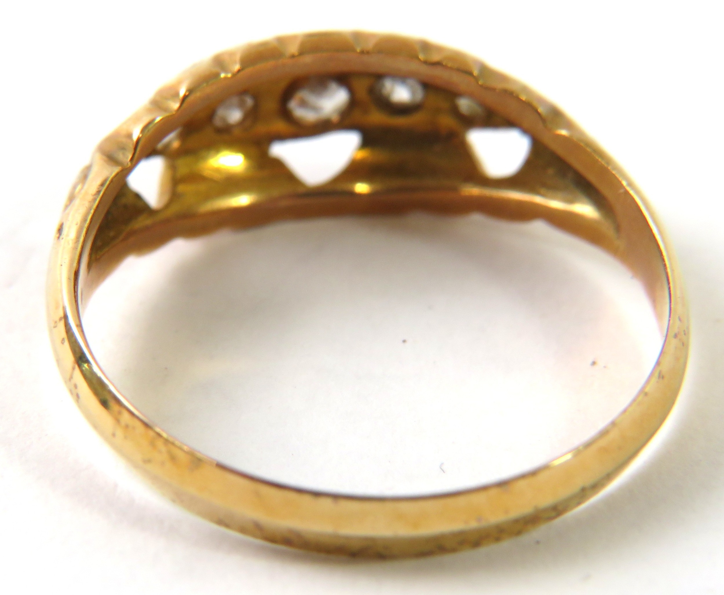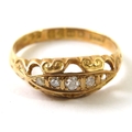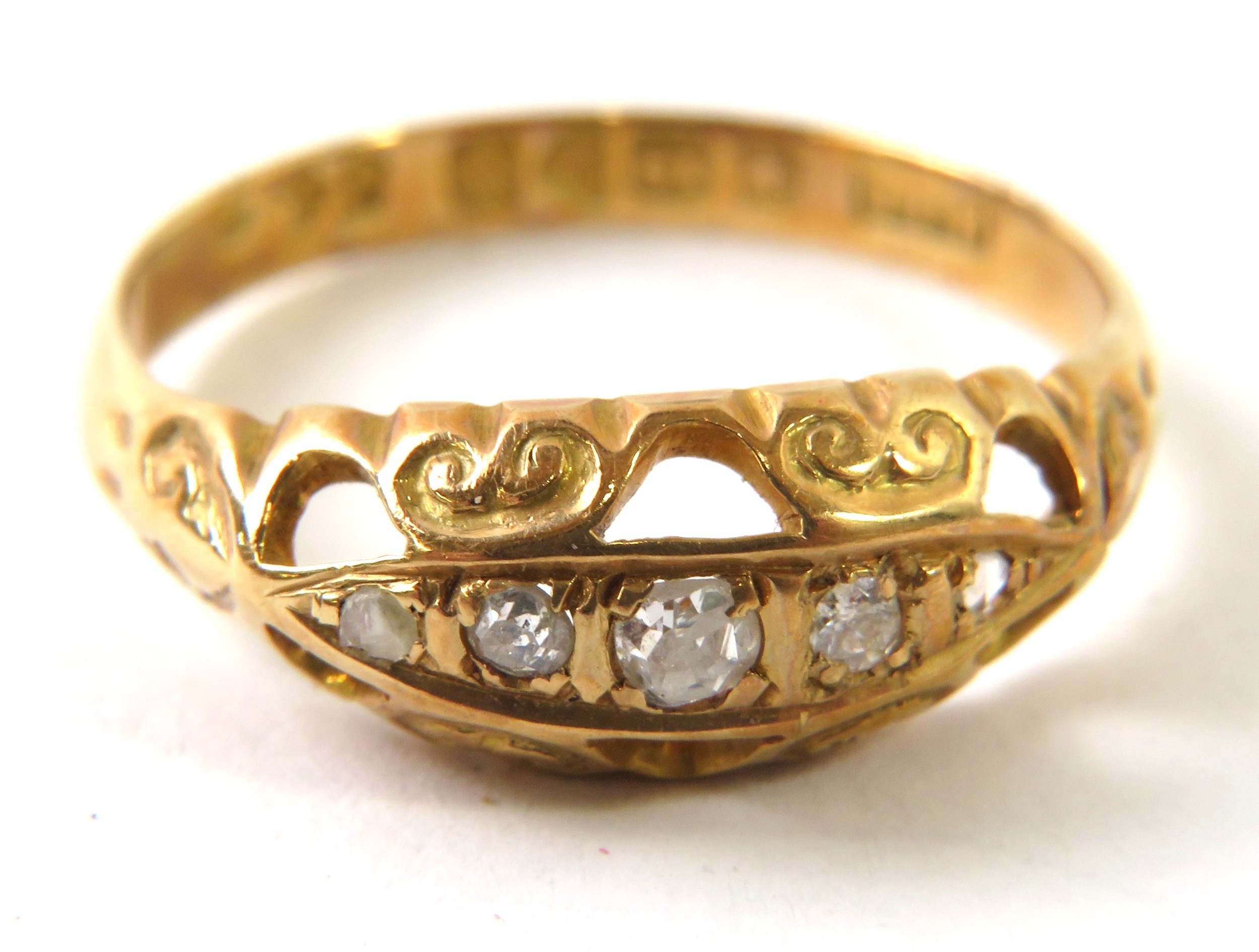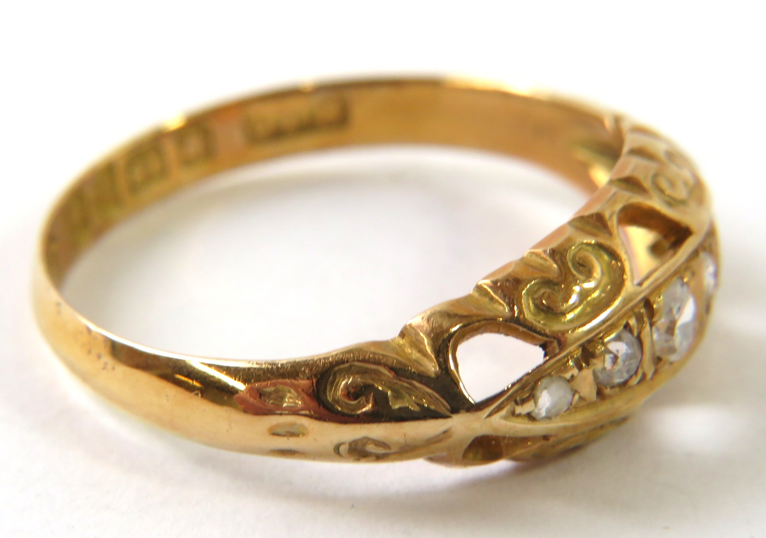 An antique 18ct gold and diamond ring, the carved head set with 5 graduated old cut or rose chip diamonds, 2.8g approx. Condition report: hallmarked for Chester 1919, ring size P 1/2