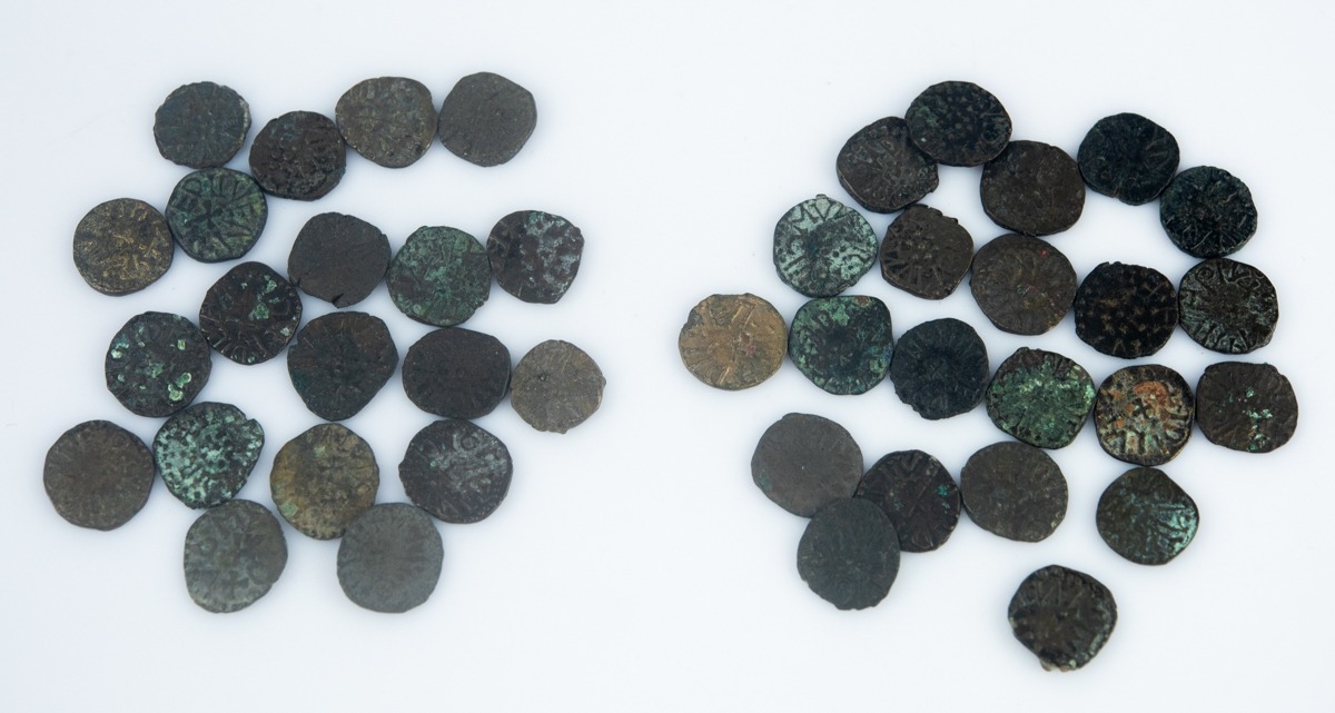APPROXIMATELY FORTY-TWO ARCHBISHOP WIGMUND ANGLO-SAXON STYLE COPPER ALLOY COINS circa CE 837-867; together with the TWO SMALL MANILLA ENVELOPES FOR A.H. BALDWIN & SONS LTD COINS AND MEDALS, 11 Adelphi Terrace London WC2N 8BJ, with black ink hand written note of contents, viz, moneyer, class A, etc., (42)
