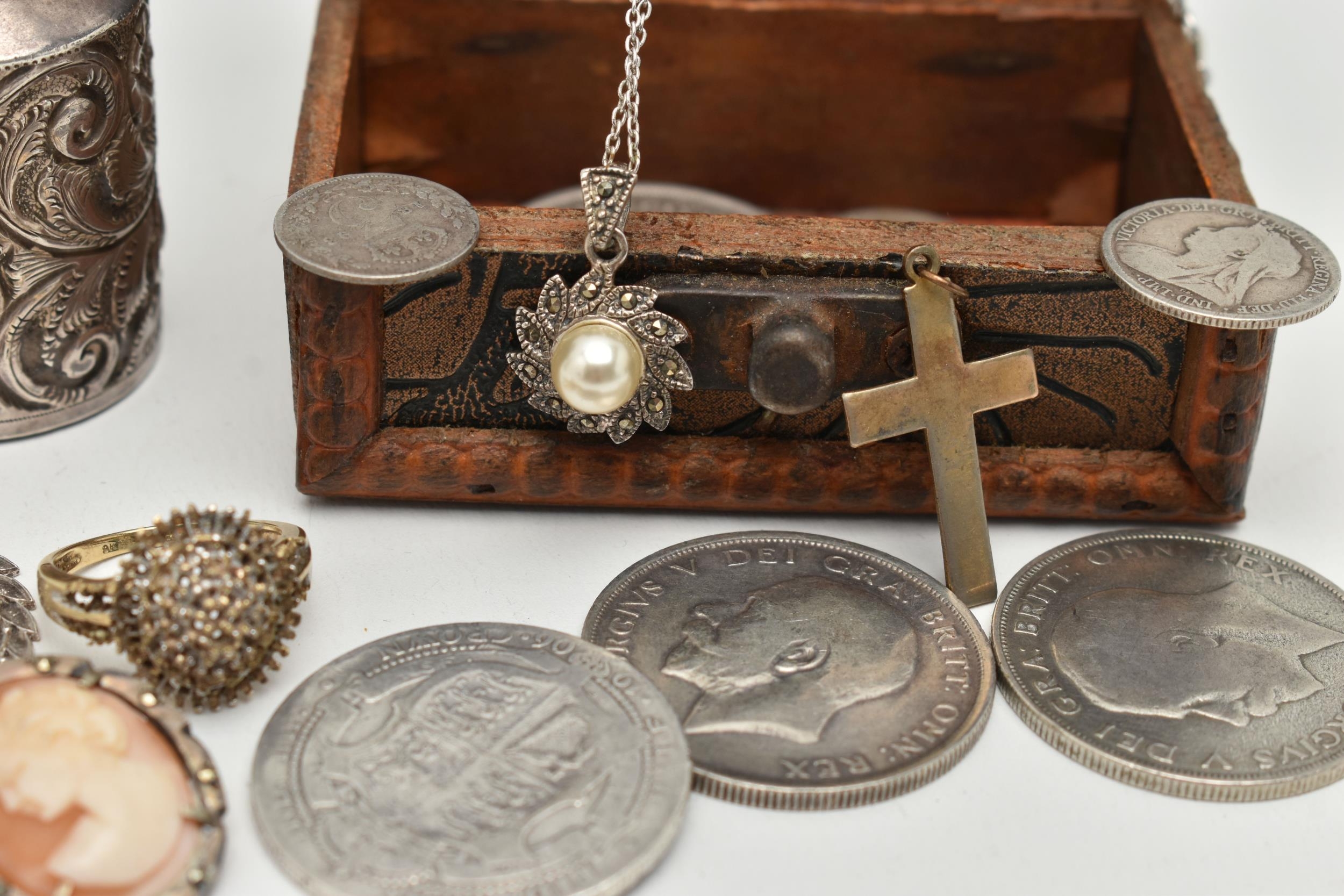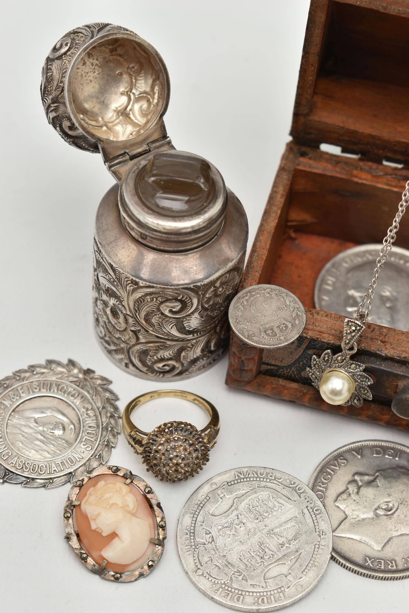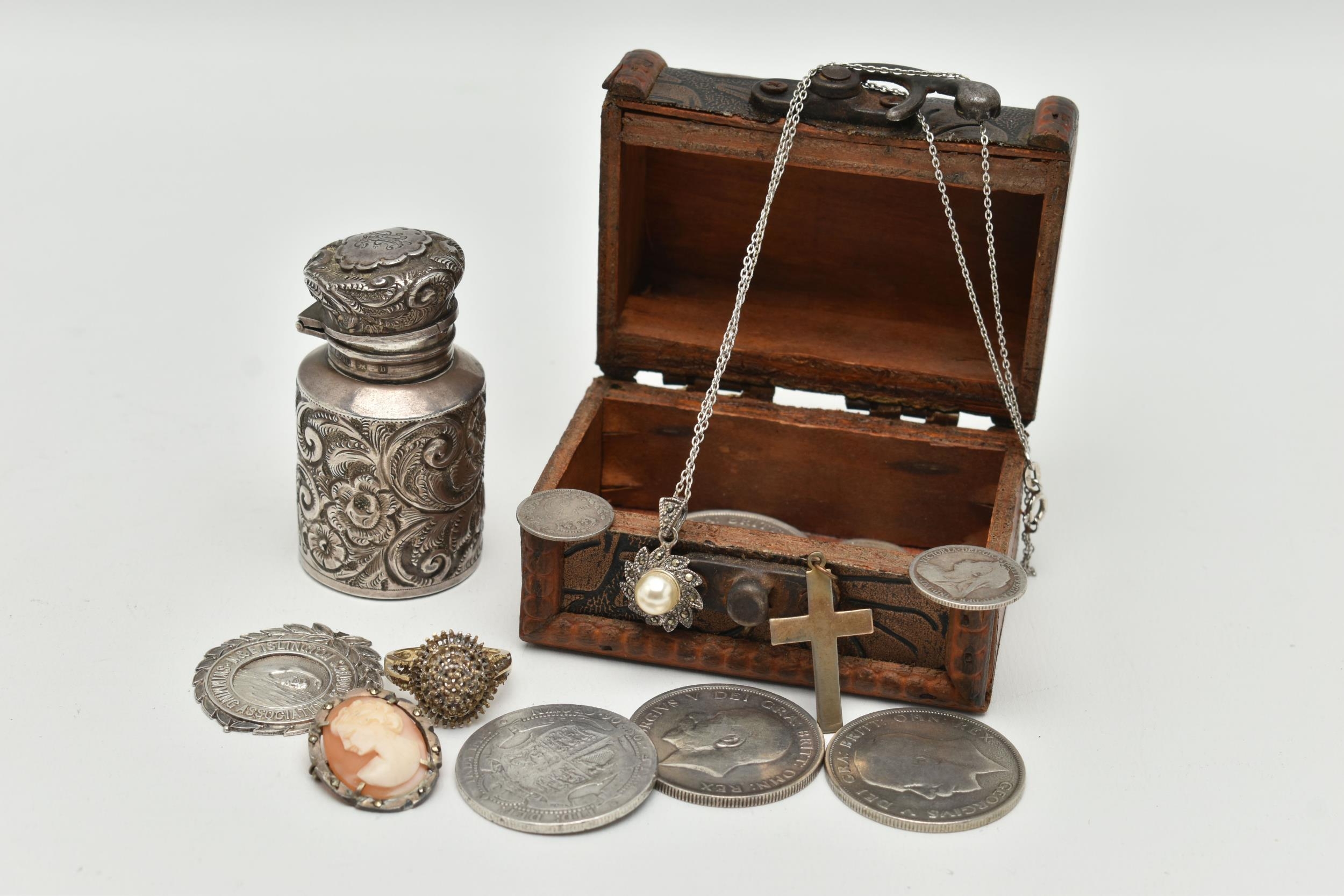 A SELECTION OF JEWELLERY, COINS AND NOVELTIES, to include a 9ct gold ring mount (gemstones deficient), hallmarked 9ct gold Birmingham, approximate ring size N 1/2, approximate gross weight 4.20 grams, together with a selection of loose stones, to include mainly diamonds, together with some white sapphire and colourless paste, a white metal marcasite and shell cameo pendant brooch, stamped 800, an imitation pearl and marcasite pendant and chain, stamped 925, a silver medallion, hallmarked Birmingham 1933, a rolled gold cross pendant, a silver scent bottle (AF), hallmarks rubbed, together with eleven coins and a small wooden case, approximate gross weight of silver and white metal jewellery and scent bottle (including scent bottle glass stopper, excluding coins) 78.68 grams (condition report: overall good to fair, scent bottle dented, unable to remove glass stopper, rolled gold pendant tarnished, many of the coins worn to surface, some of the loose stones chipped, damaged)