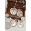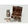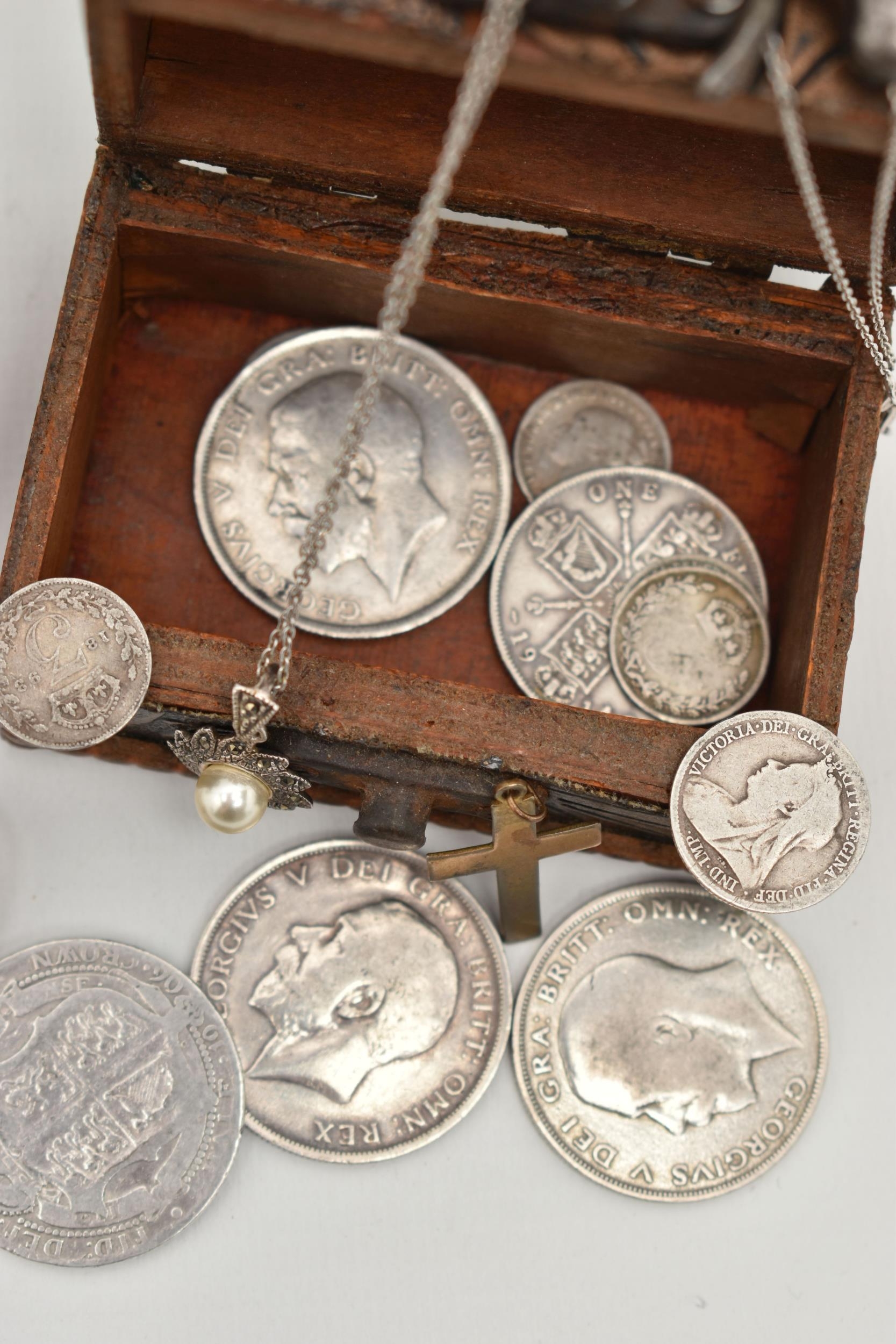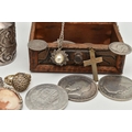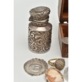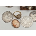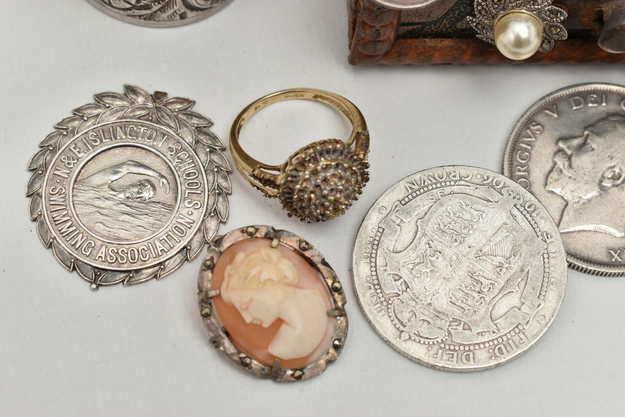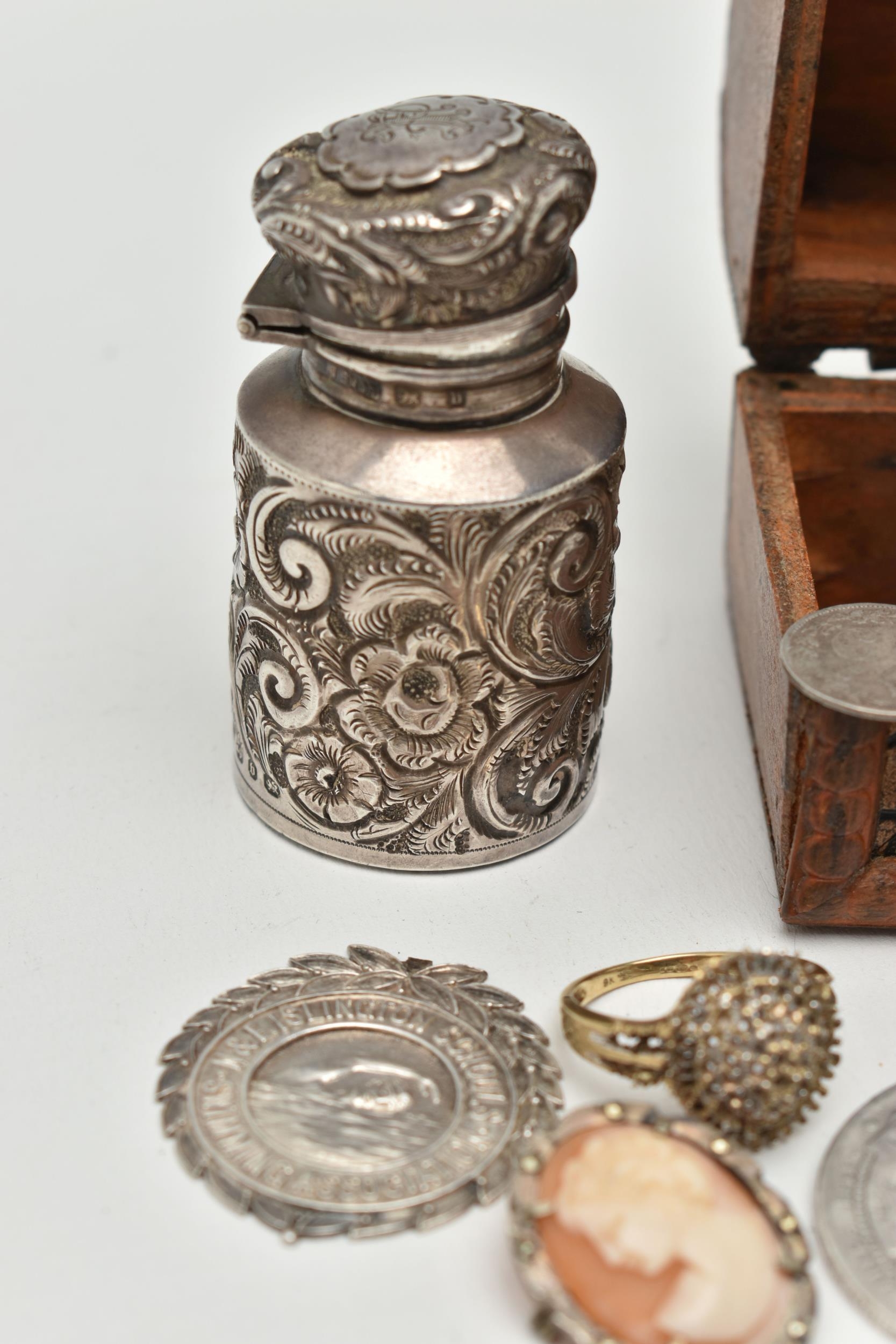 A SELECTION OF JEWELLERY, COINS AND NOVELTIES, to include a 9ct gold ring mount (gemstones deficient), hallmarked 9ct gold Birmingham, approximate ring size N 1/2, approximate gross weight 4.20 grams, together with a selection of loose stones, to include mainly diamonds, together with some white sapphire and colourless paste, a white metal marcasite and shell cameo pendant brooch, stamped 800, an imitation pearl and marcasite pendant and chain, stamped 925, a silver medallion, hallmarked Birmingham 1933, a rolled gold cross pendant, a silver scent bottle (AF), hallmarks rubbed, together with eleven coins and a small wooden case, approximate gross weight of silver and white metal jewellery and scent bottle (including scent bottle glass stopper, excluding coins) 78.68 grams (condition report: overall good to fair, scent bottle dented, unable to remove glass stopper, rolled gold pendant tarnished, many of the coins worn to surface, some of the loose stones chipped, damaged)