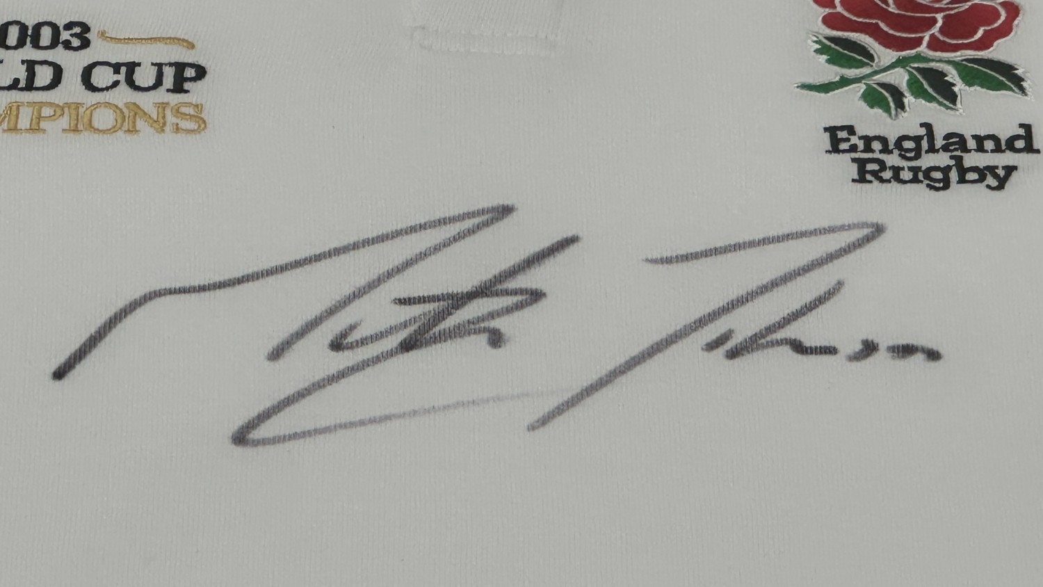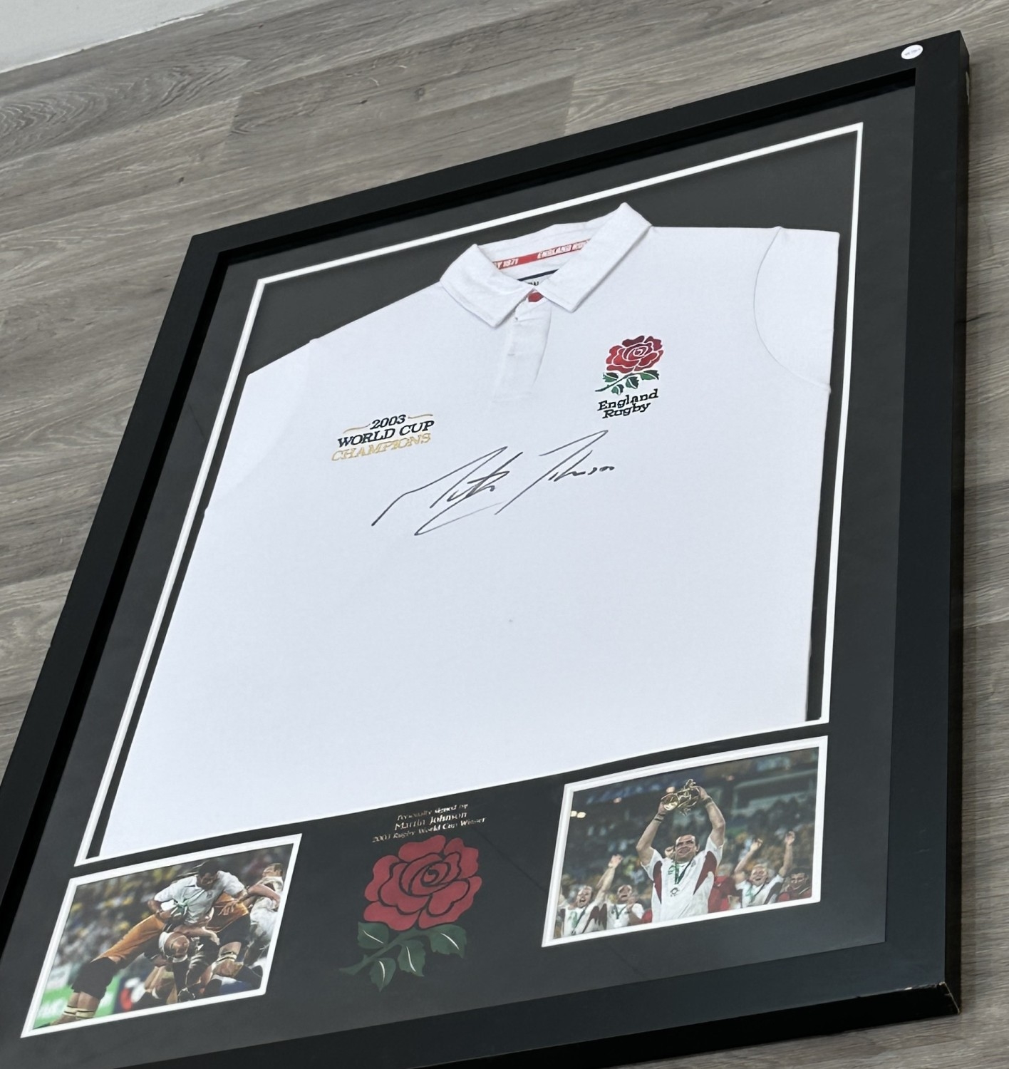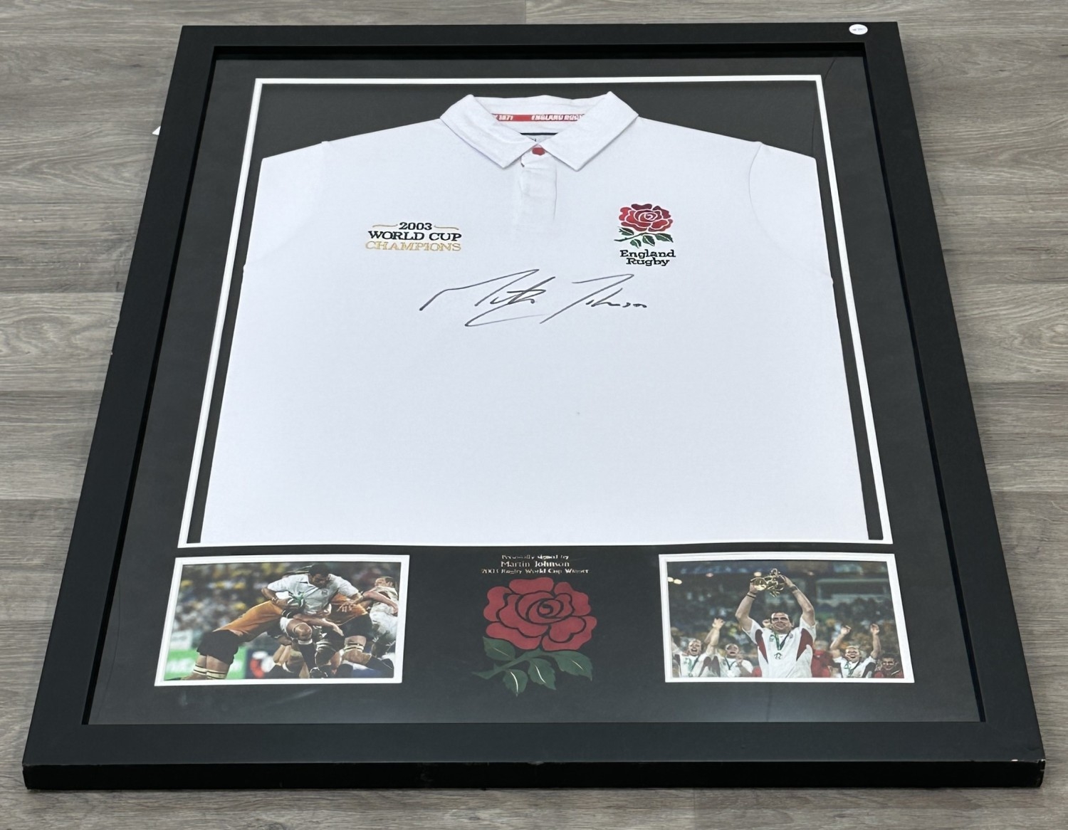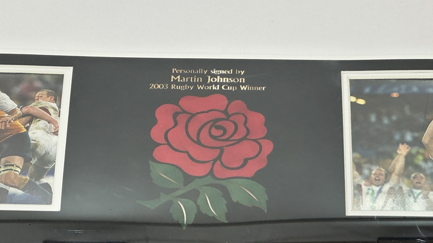 A framed England Rugby 2003 World Cup Champions shirt signed by Martin Johnson - approx. 102cm high x 77cm wide