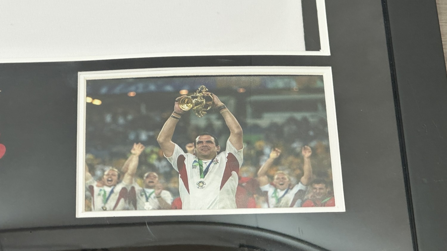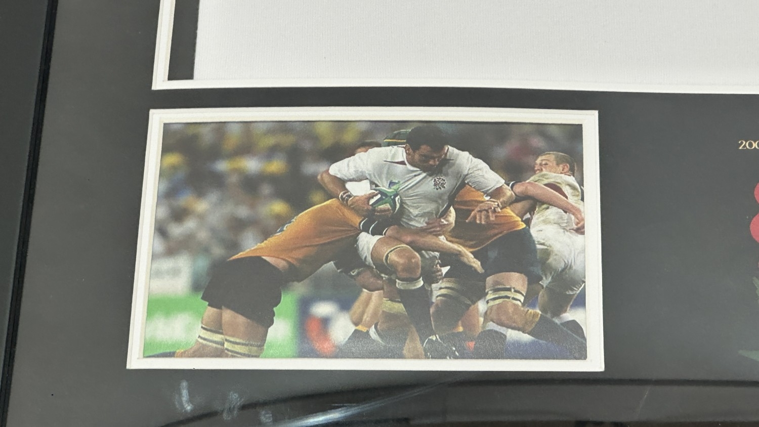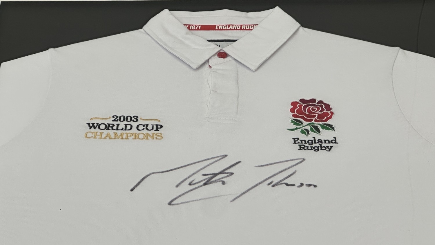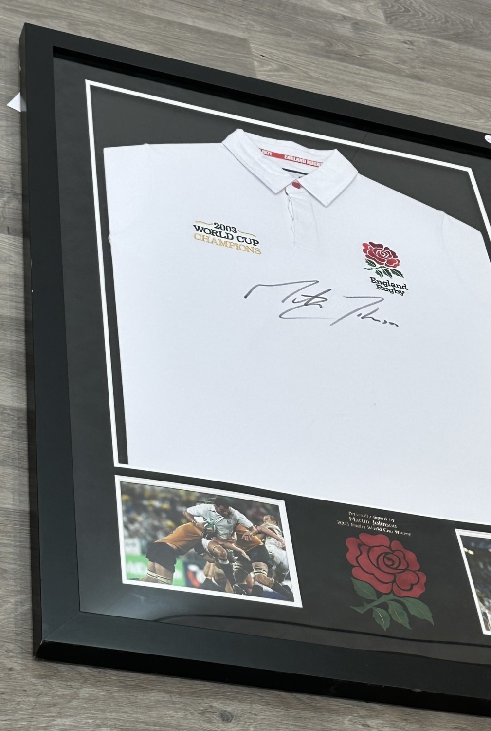 A framed England Rugby 2003 World Cup Champions shirt signed by Martin Johnson - approx. 102cm high x 77cm wide