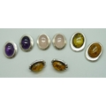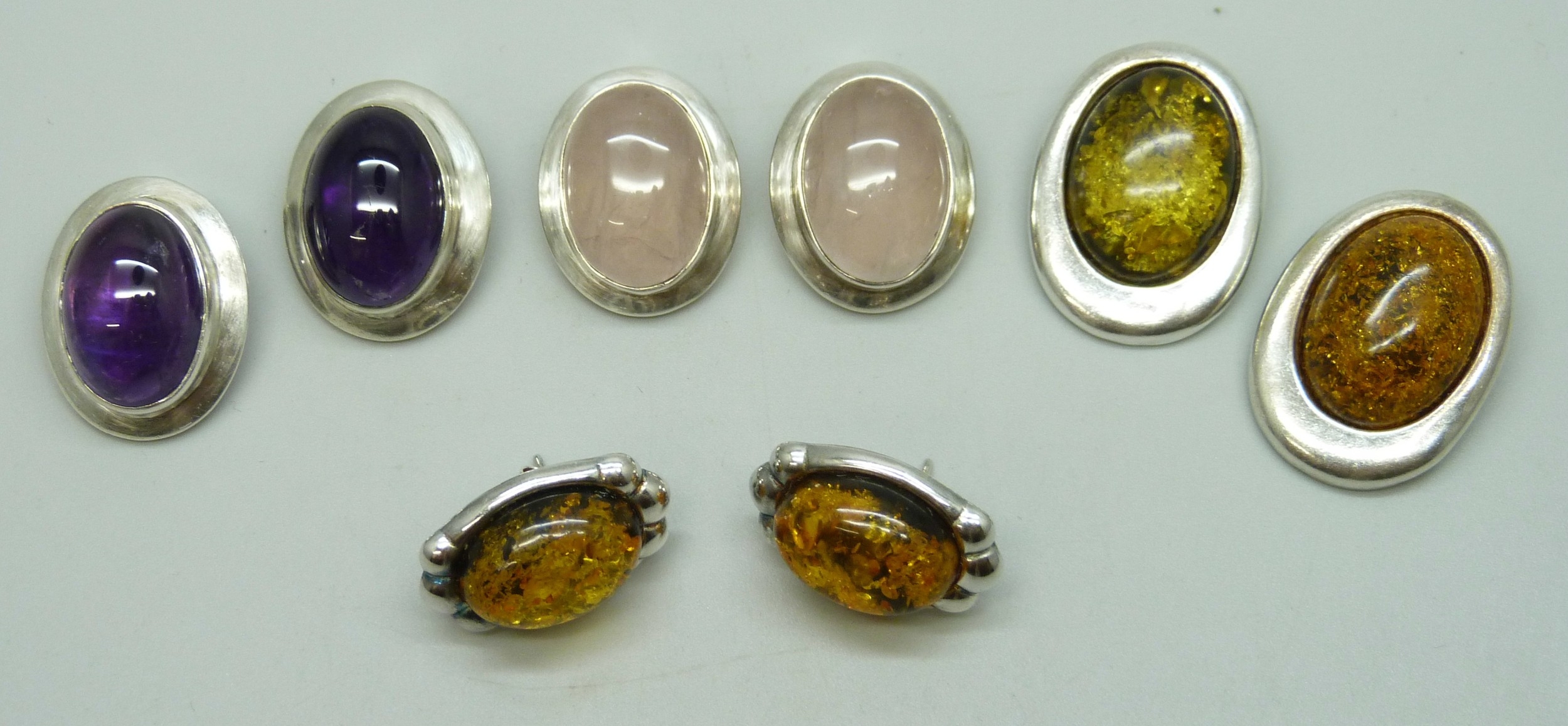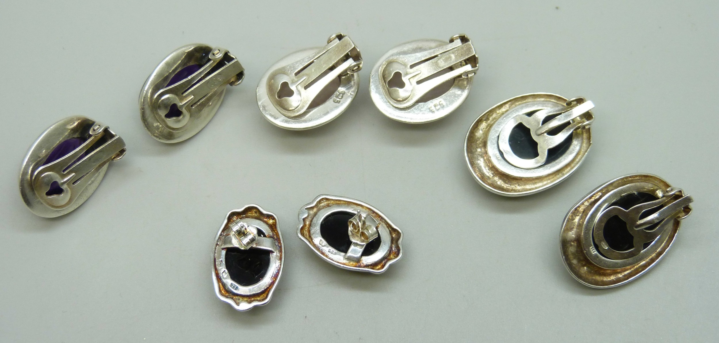 A collection of silver and gemstone stud and clip on earrings, 51g total
