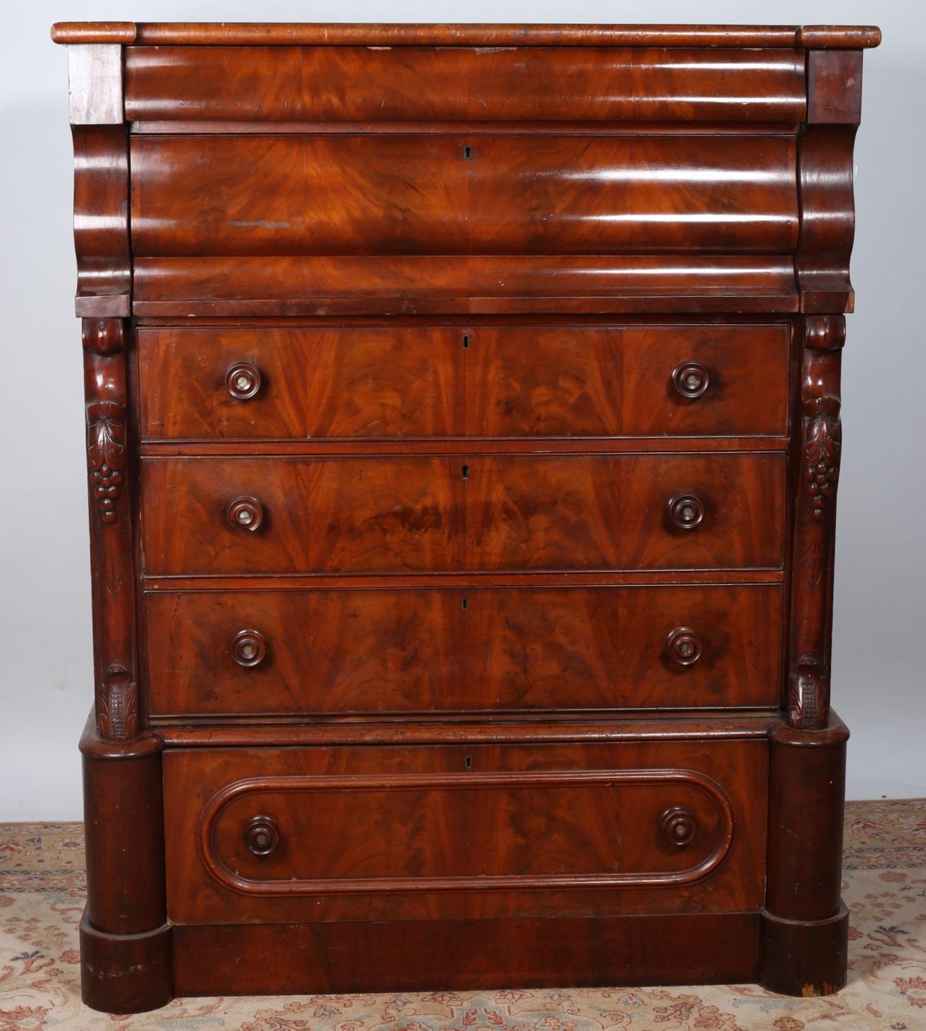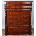A VICTORIAN MAHOGANY SCOTCH CHEST of inverted breakfront outline the shaped top above six long drawers between scroll corbels on platform base 153cm (h) x 122cm (w) x 58cm (d)