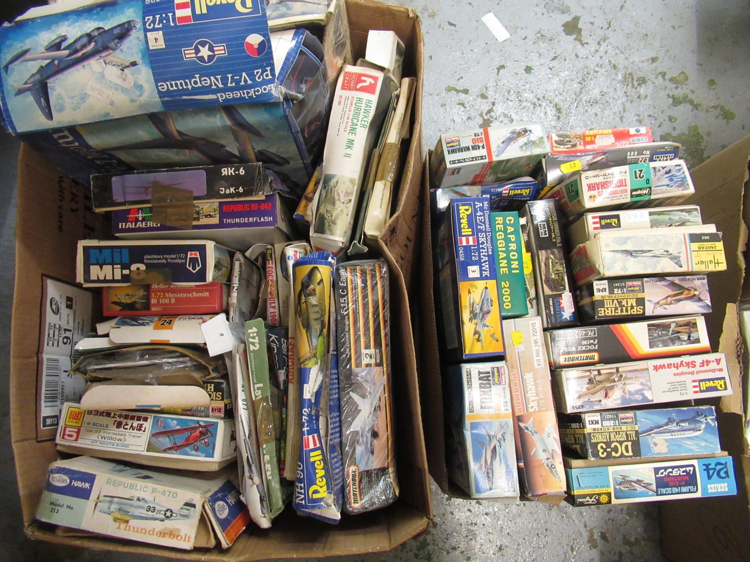 Two boxes containing forty four unmade plastic aircraft kits, including Airfix, Italari, Revel and Esci