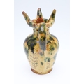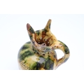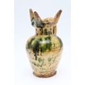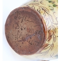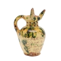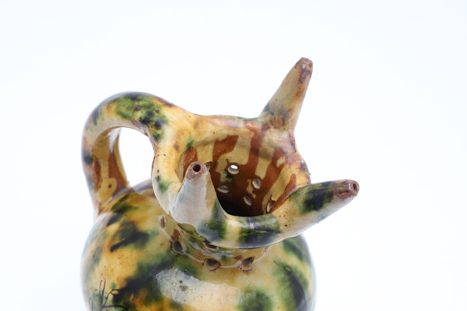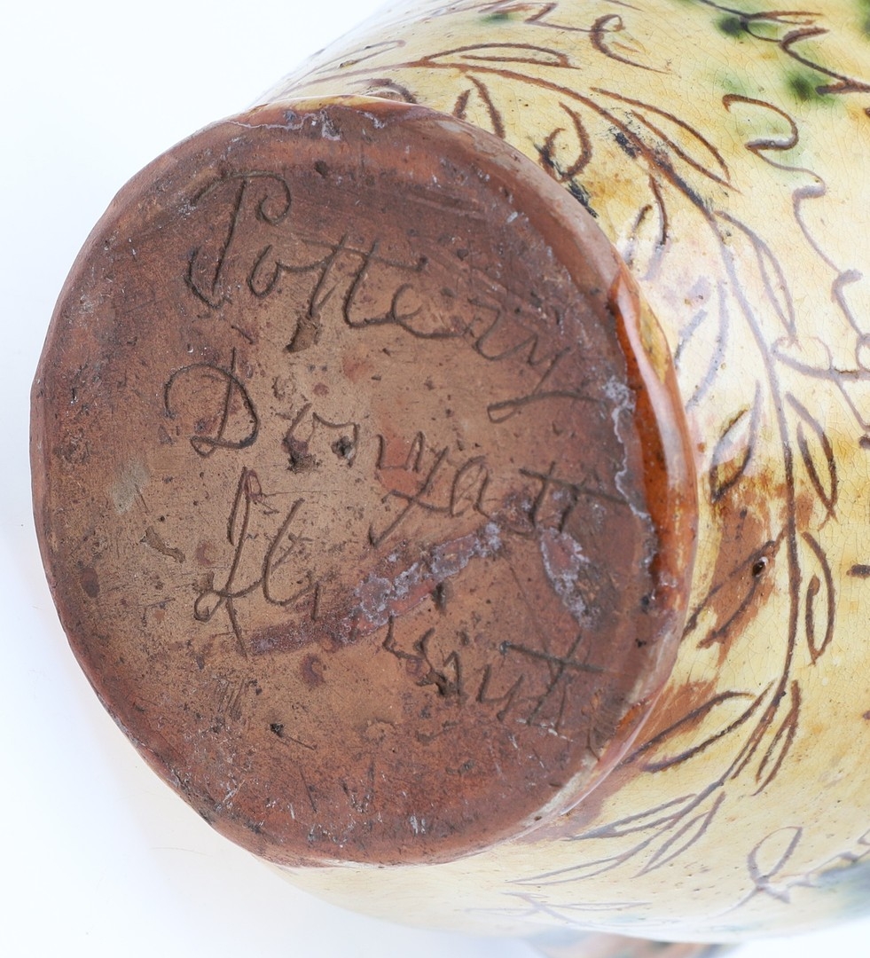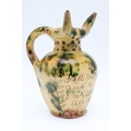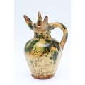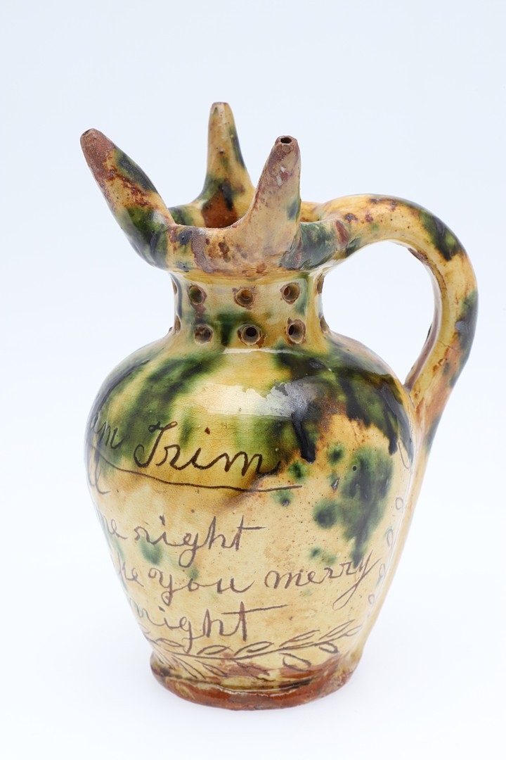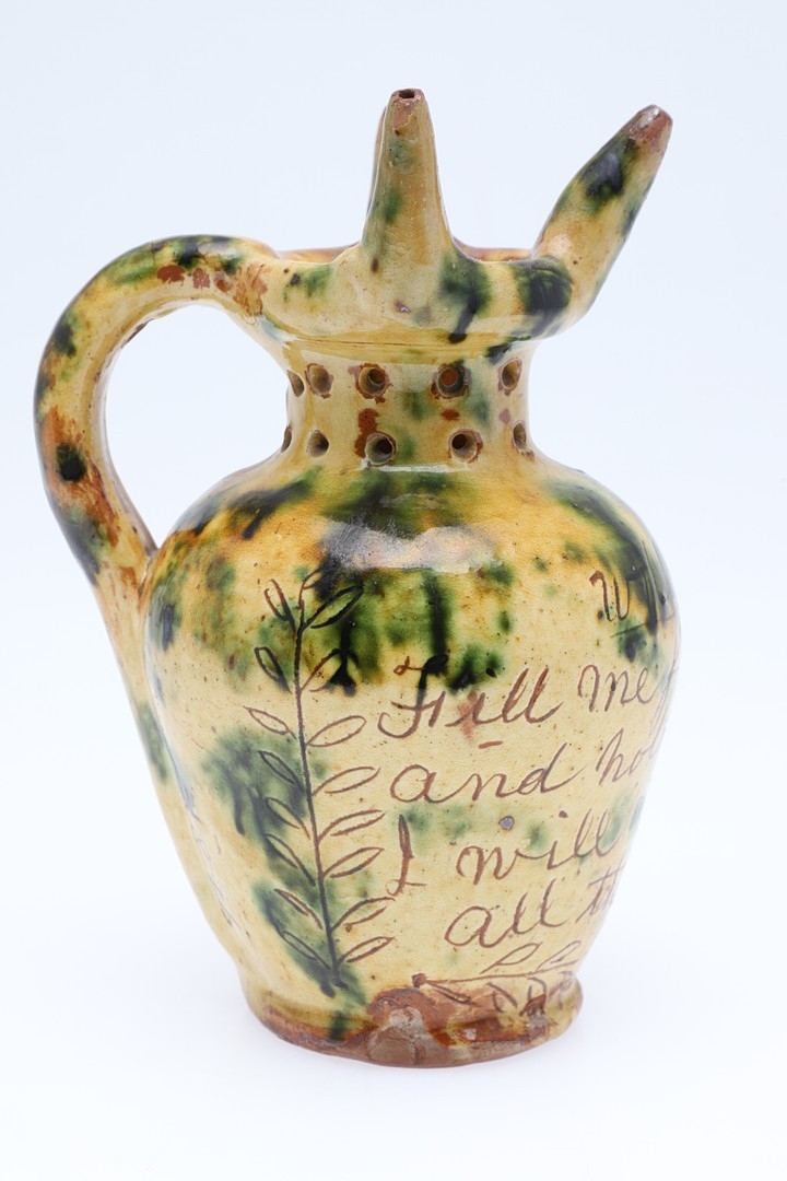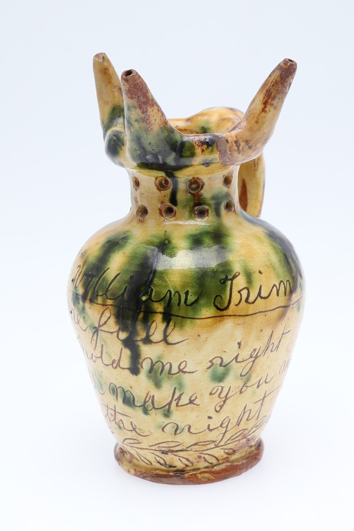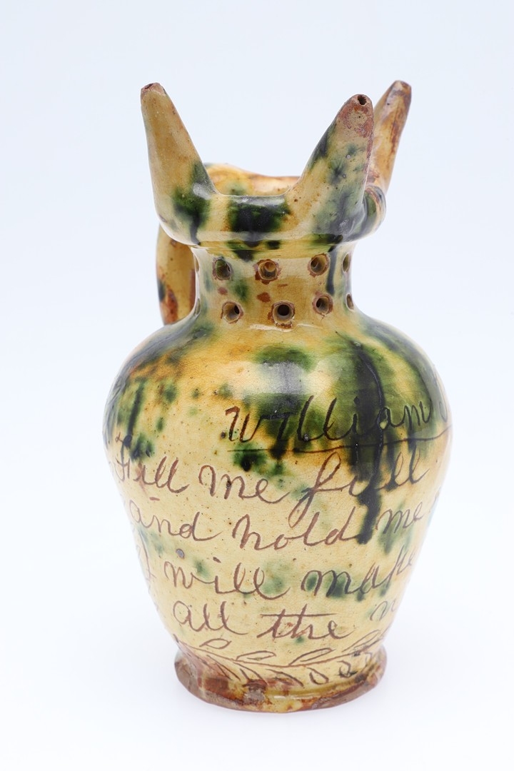 DONYATT POTTERY PUZZLE JUG - 1896. A late 19thc Donyatt Pottery slipware puzzle jug, inscribed to 'William Trim' and dated 1896, abd with a prose 'Fill me full and hold me tight, I will make you merry all the night'. Inscribed to the base and with an attached label with information. 17cms high
