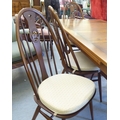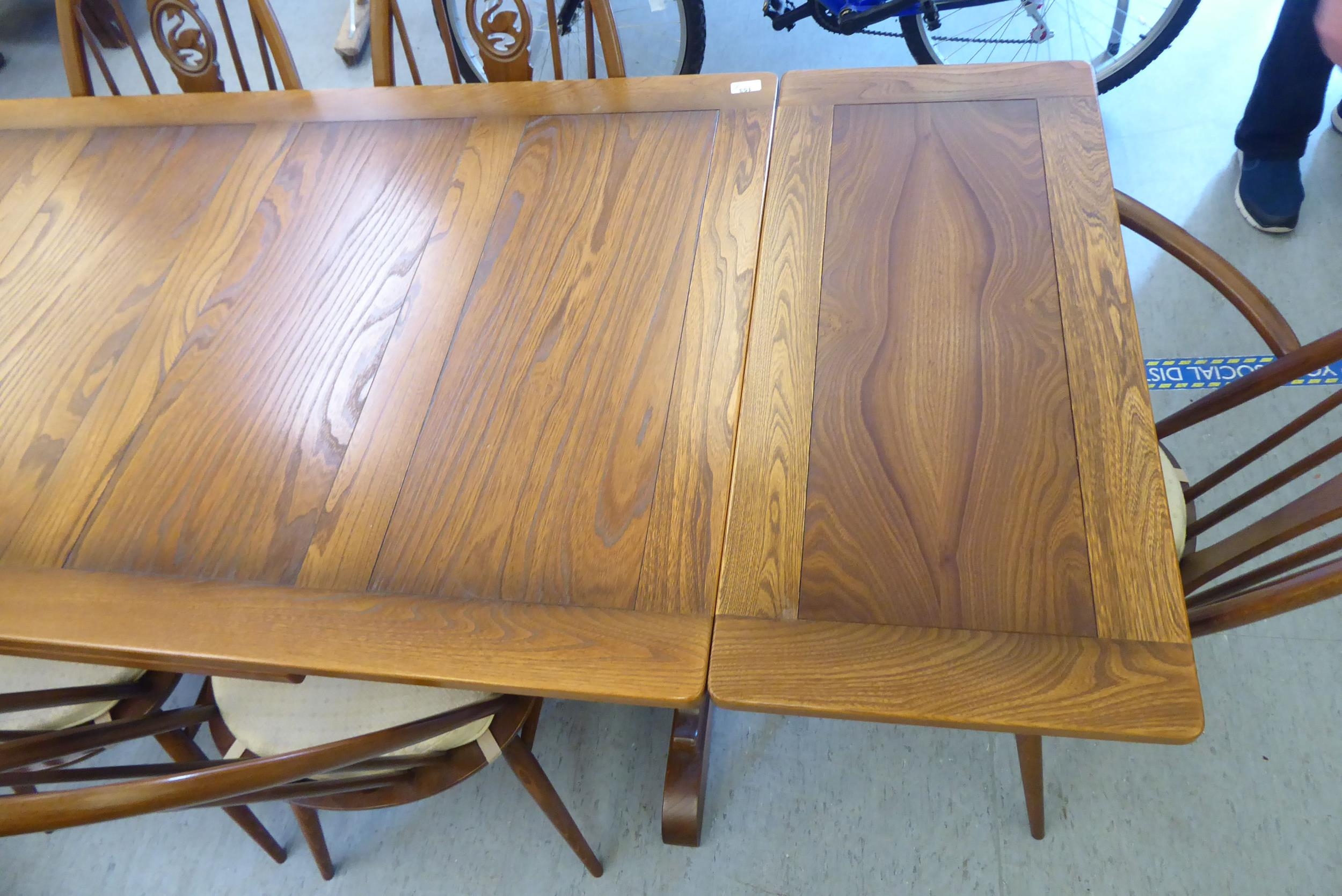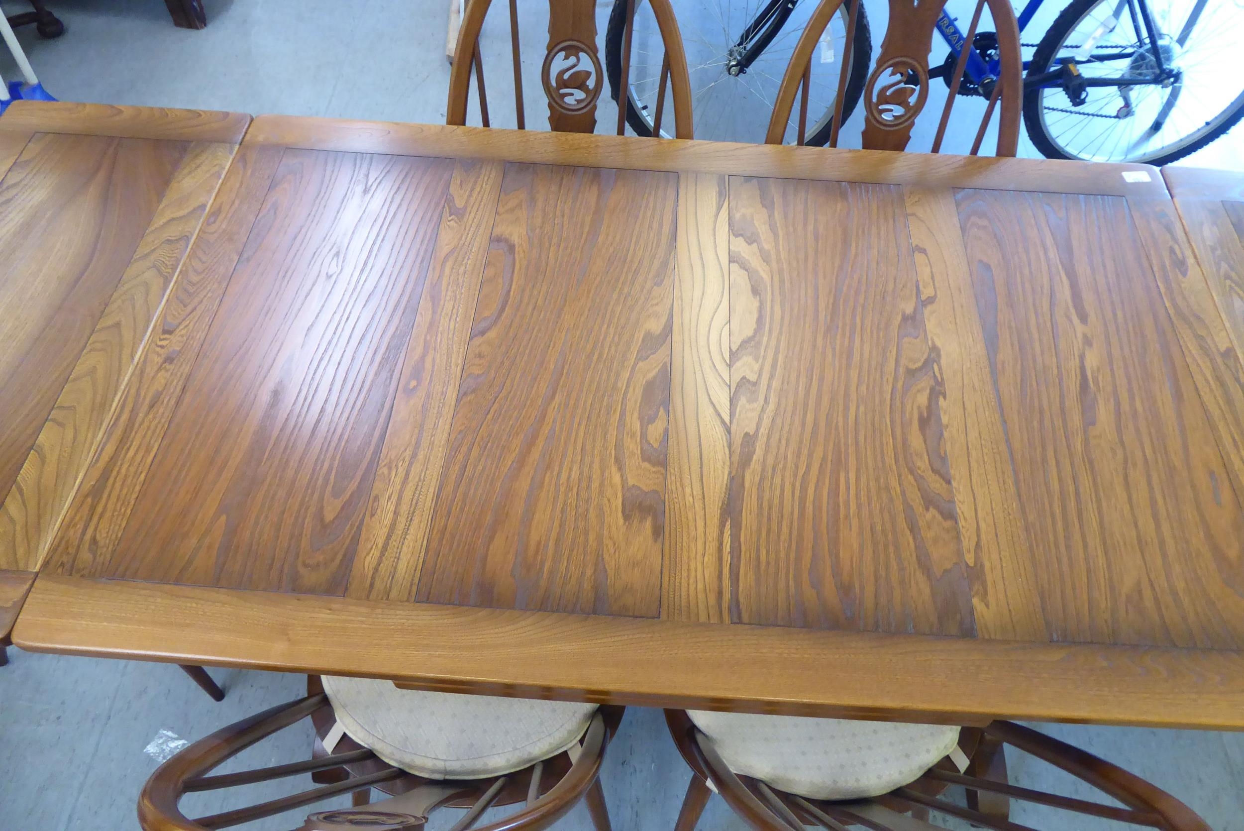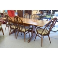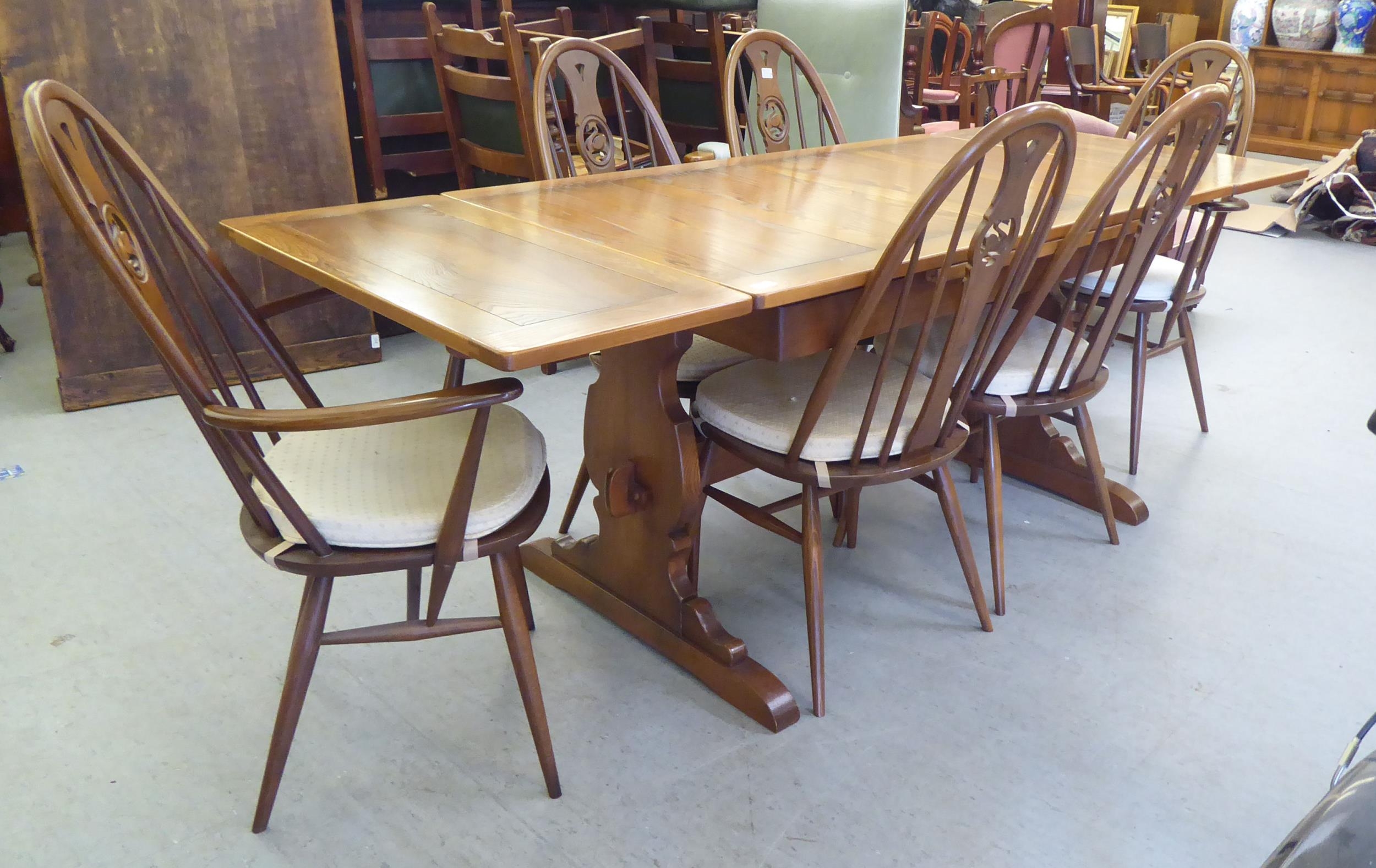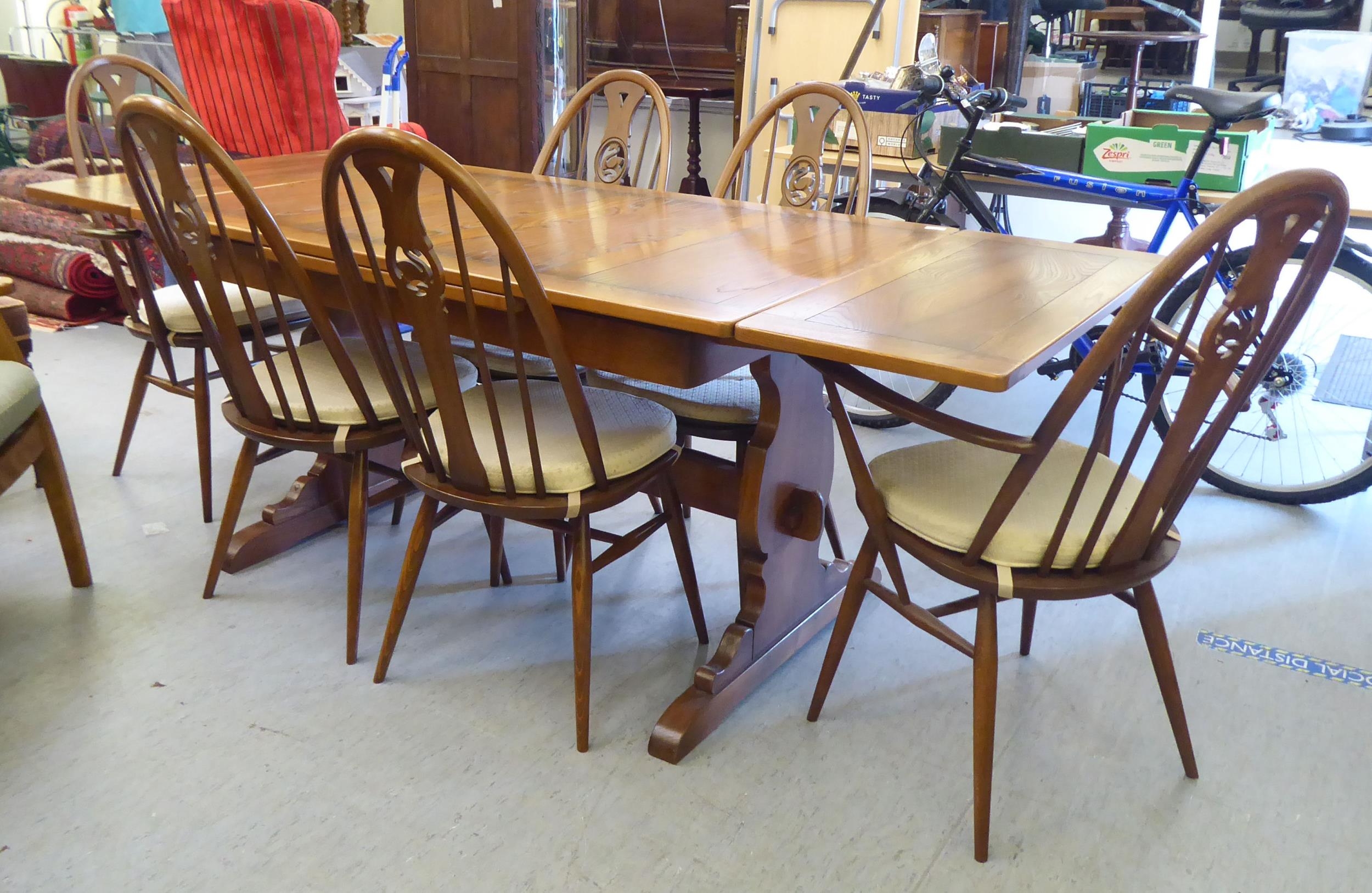 An Ercol Golden Dawn beech and elm draw leaf dining table with a panelled top, raised on shaped trestle ends and platform feet 30"h 54"L extending to 84"L; and a set of six Ercol beech and elm framed high hoop and spindled back chairs with pierced swan splats and solid seats, raised on elliptical legs and stretchers comprising four standard/two open arm