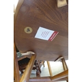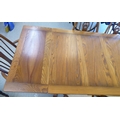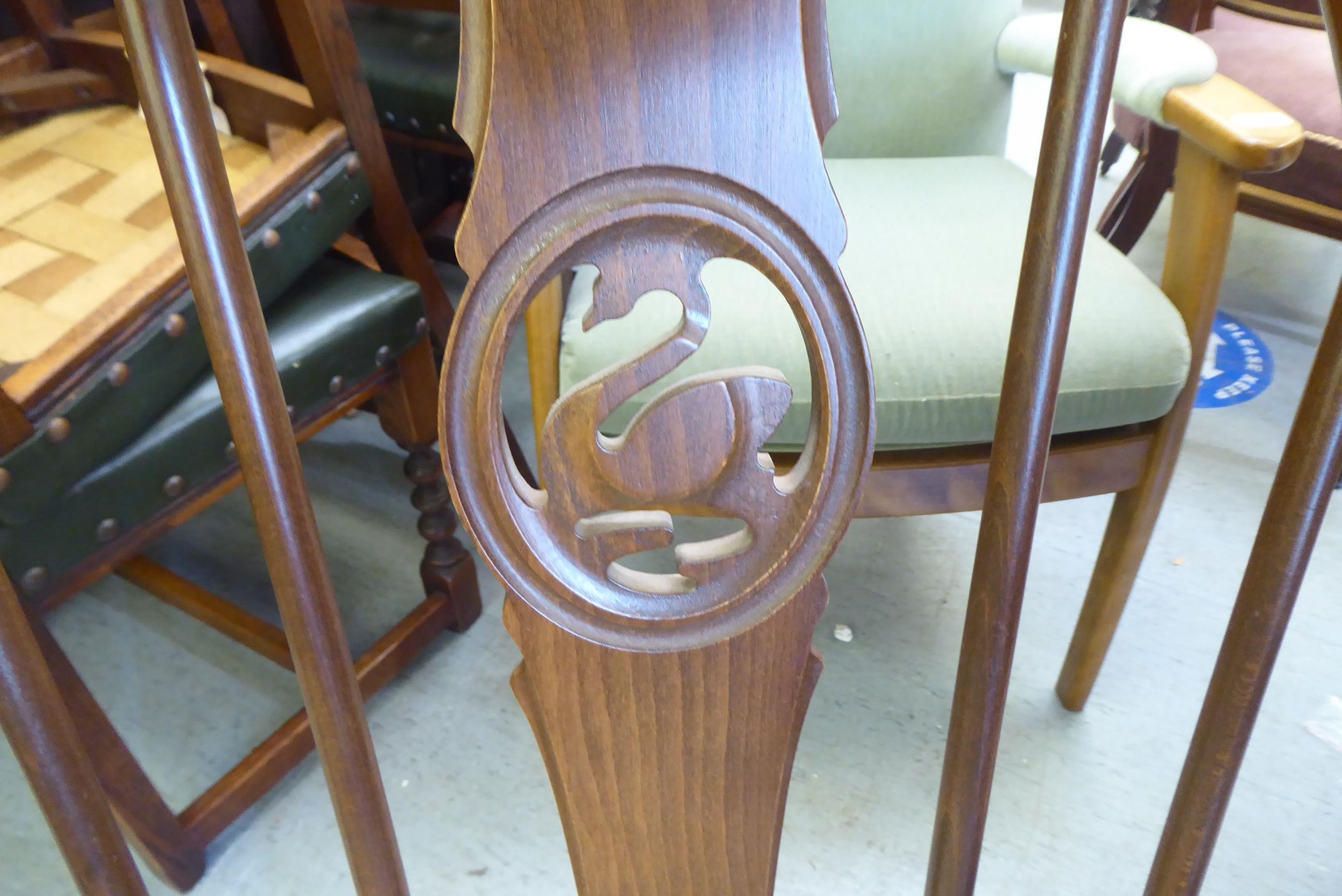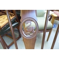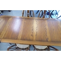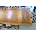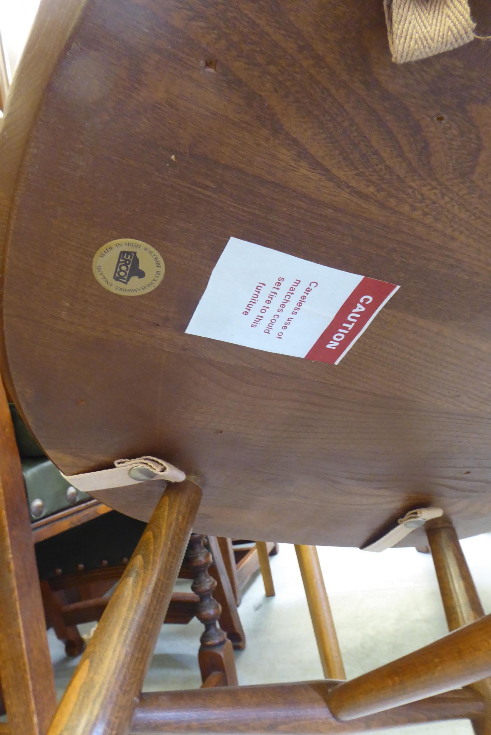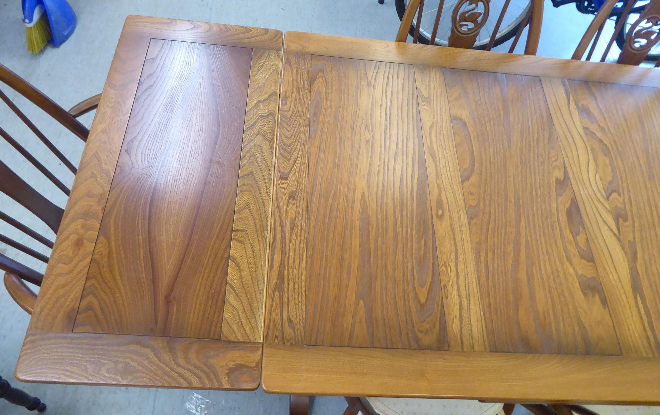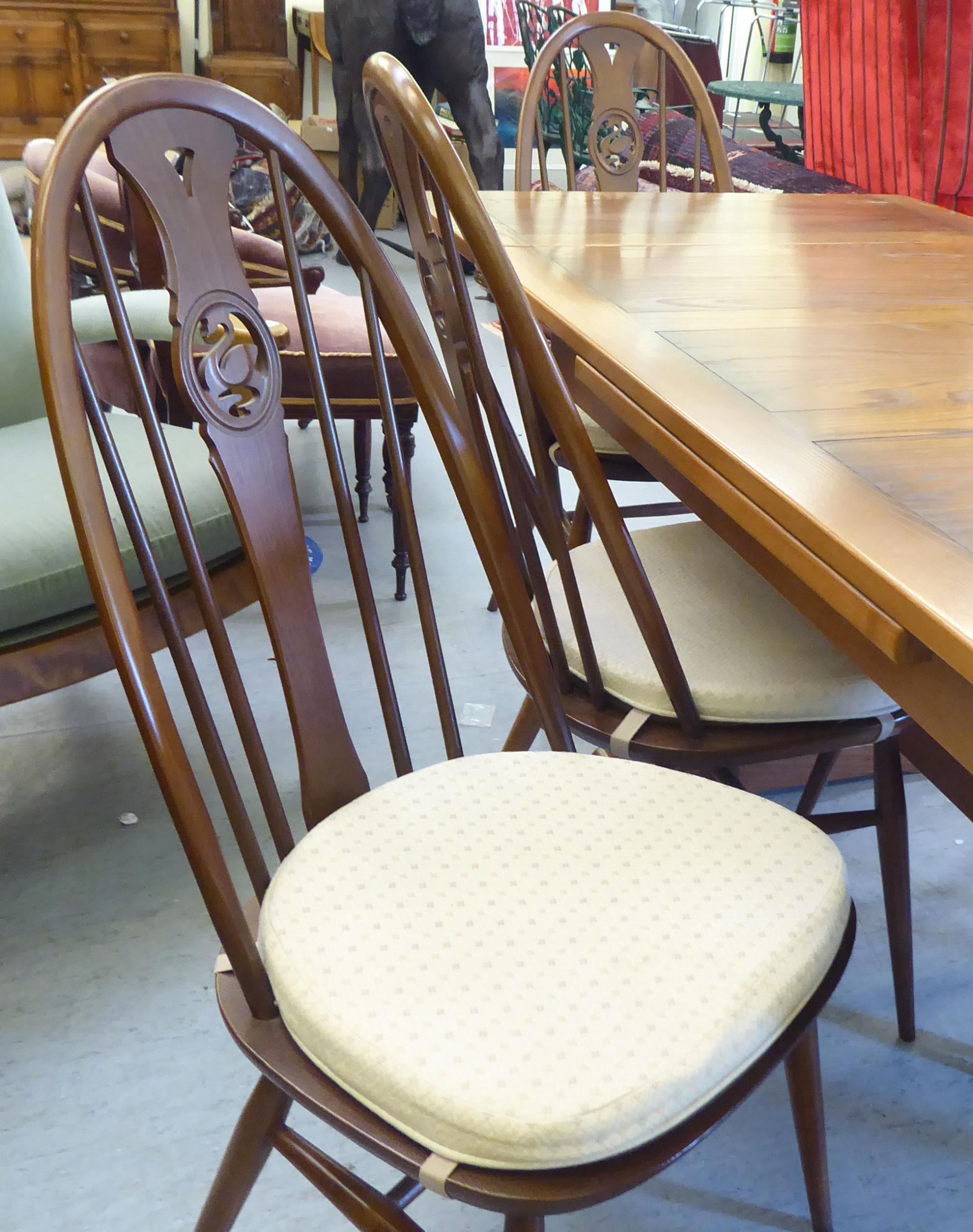 An Ercol Golden Dawn beech and elm draw leaf dining table with a panelled top, raised on shaped trestle ends and platform feet 30"h 54"L extending to 84"L; and a set of six Ercol beech and elm framed high hoop and spindled back chairs with pierced swan splats and solid seats, raised on elliptical legs and stretchers comprising four standard/two open arm