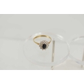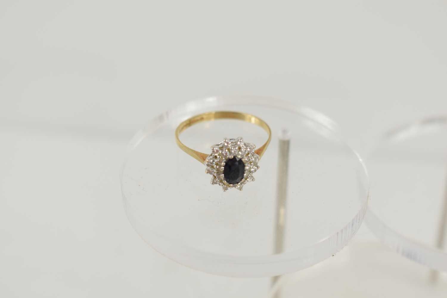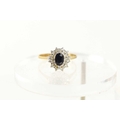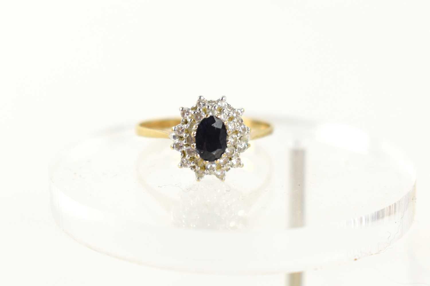 A 9ct gold, sapphire and diamond cluster ring, the central oval sapphire of approximately 6.1 by 4.2mm, surrounded by two rows of diamond brilliants, size Q, 2.0g.