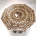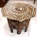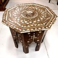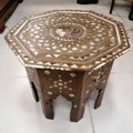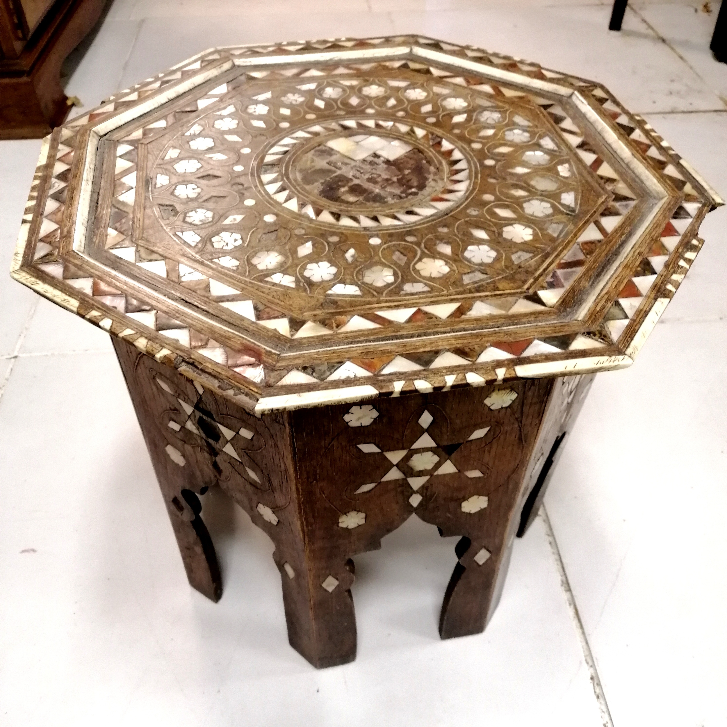 Antique mother of pearl inlaid folding hexagonal topped table - some losses - 46cm diameter x 39cm high