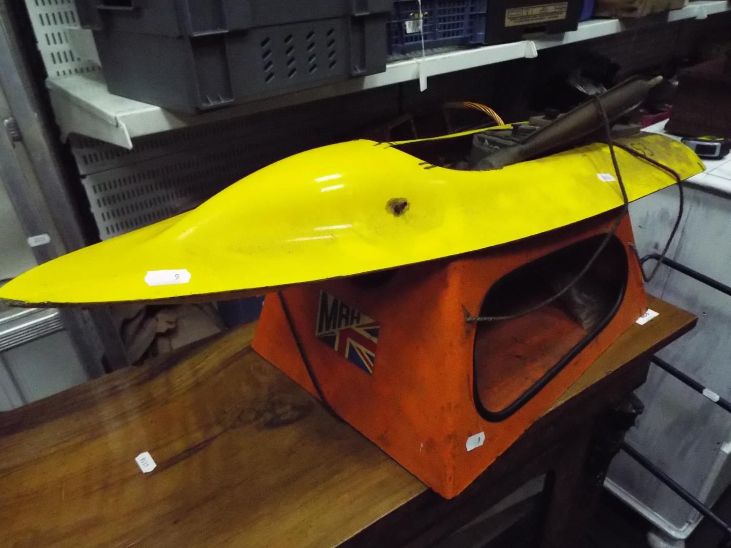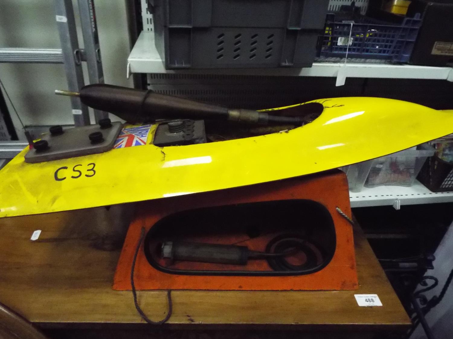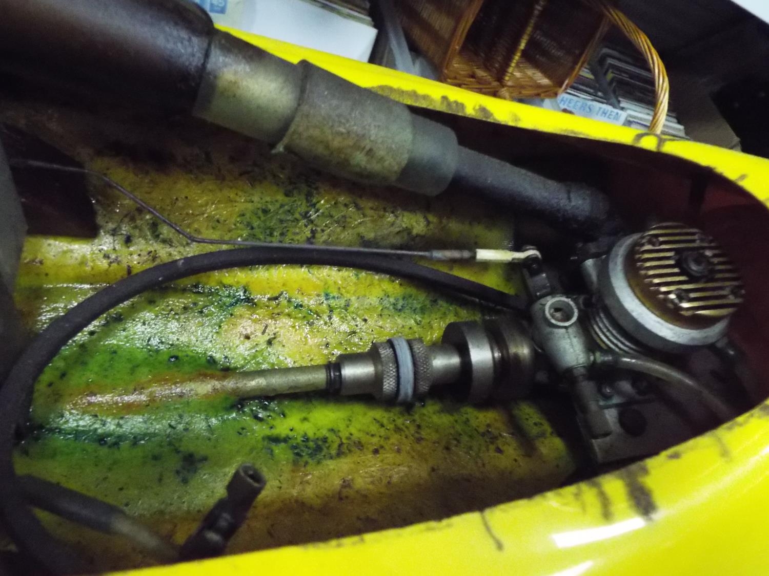 model fuel Engine powerboat 32 inches long with carry cradle. Working condition unknown.