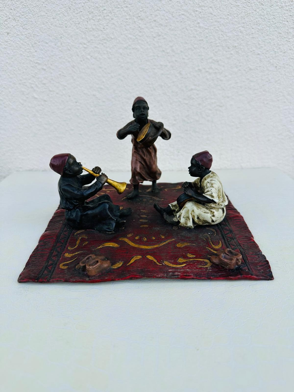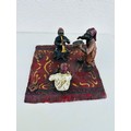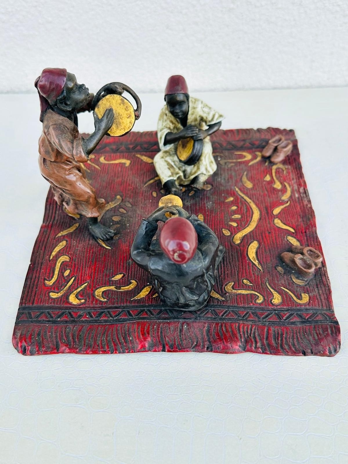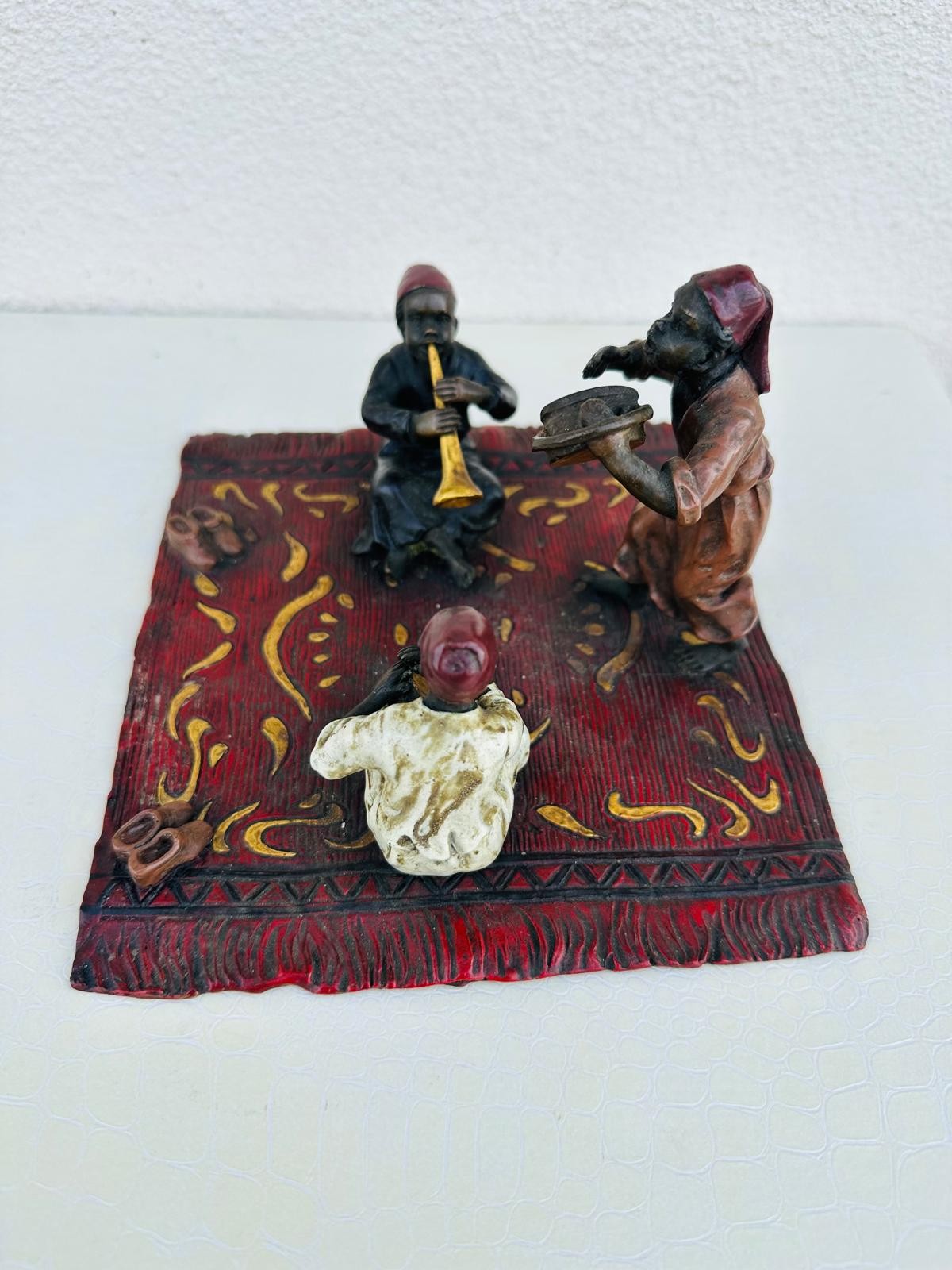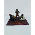 Franz Bergman 1861- 1936 Austrian cold painted bronze, stamped with Bergman monogram, 3 musicians playing on a carpet, 10cm h x 17cm x 16cm