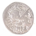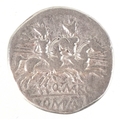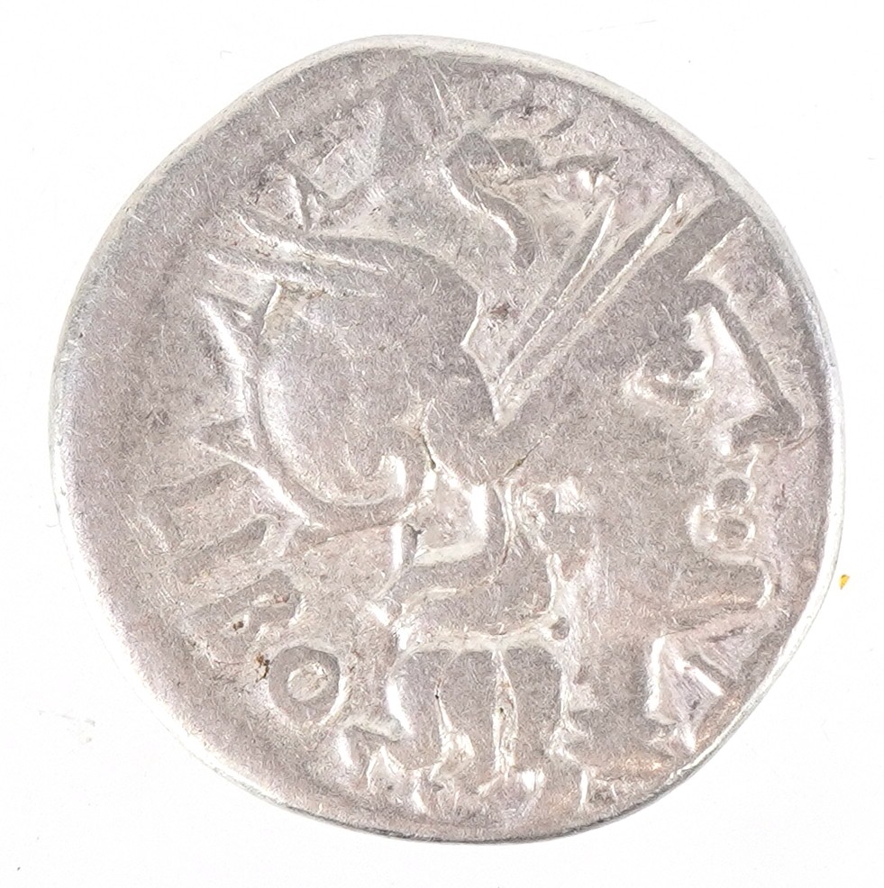 A Roman Republic circa 148BC Quintus Marcius Libo silver denarius, helmeted head of Roma facing right to the obverse, the reverse having Castor and Pollux on horseback facing right holding spears, 18.9mm in diameter, 3.1g.
