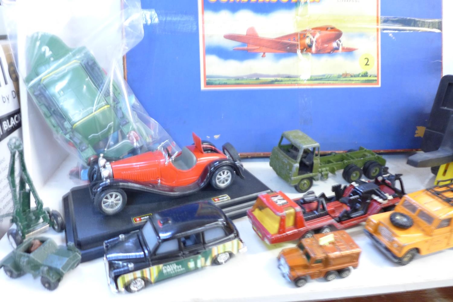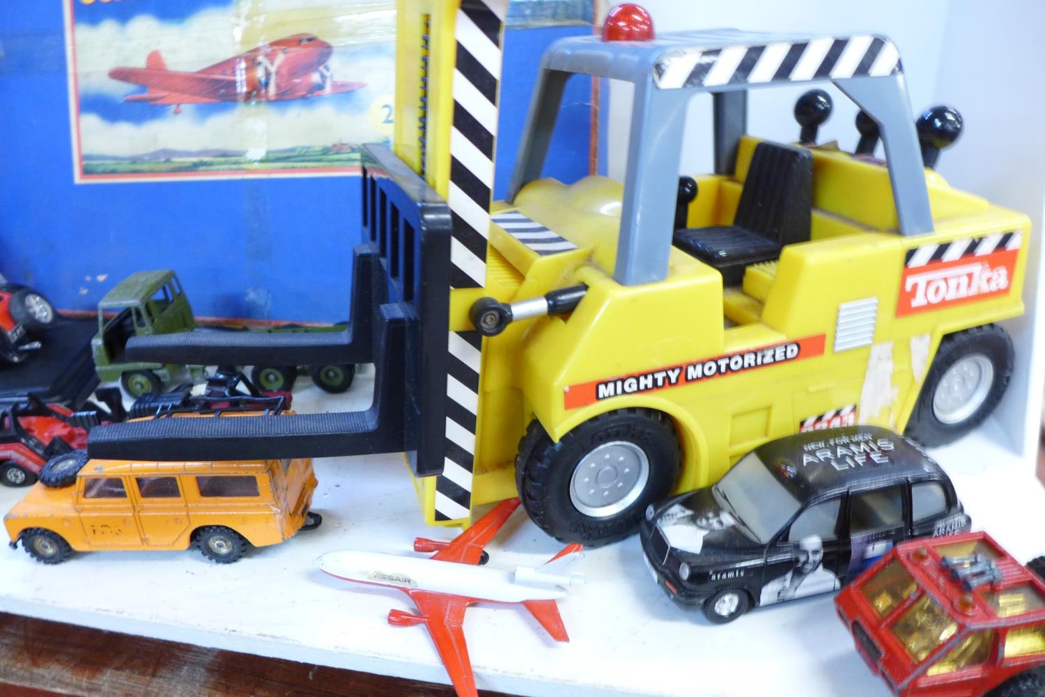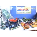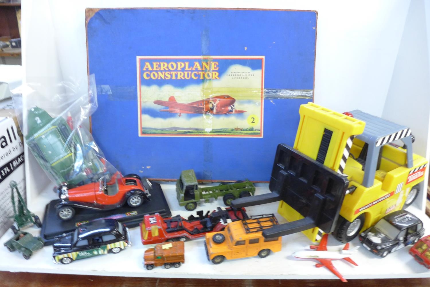 A Meccano Aeroplane Constructor (boxed, contents unchecked) and a box of toy vehicles including Dinky
