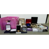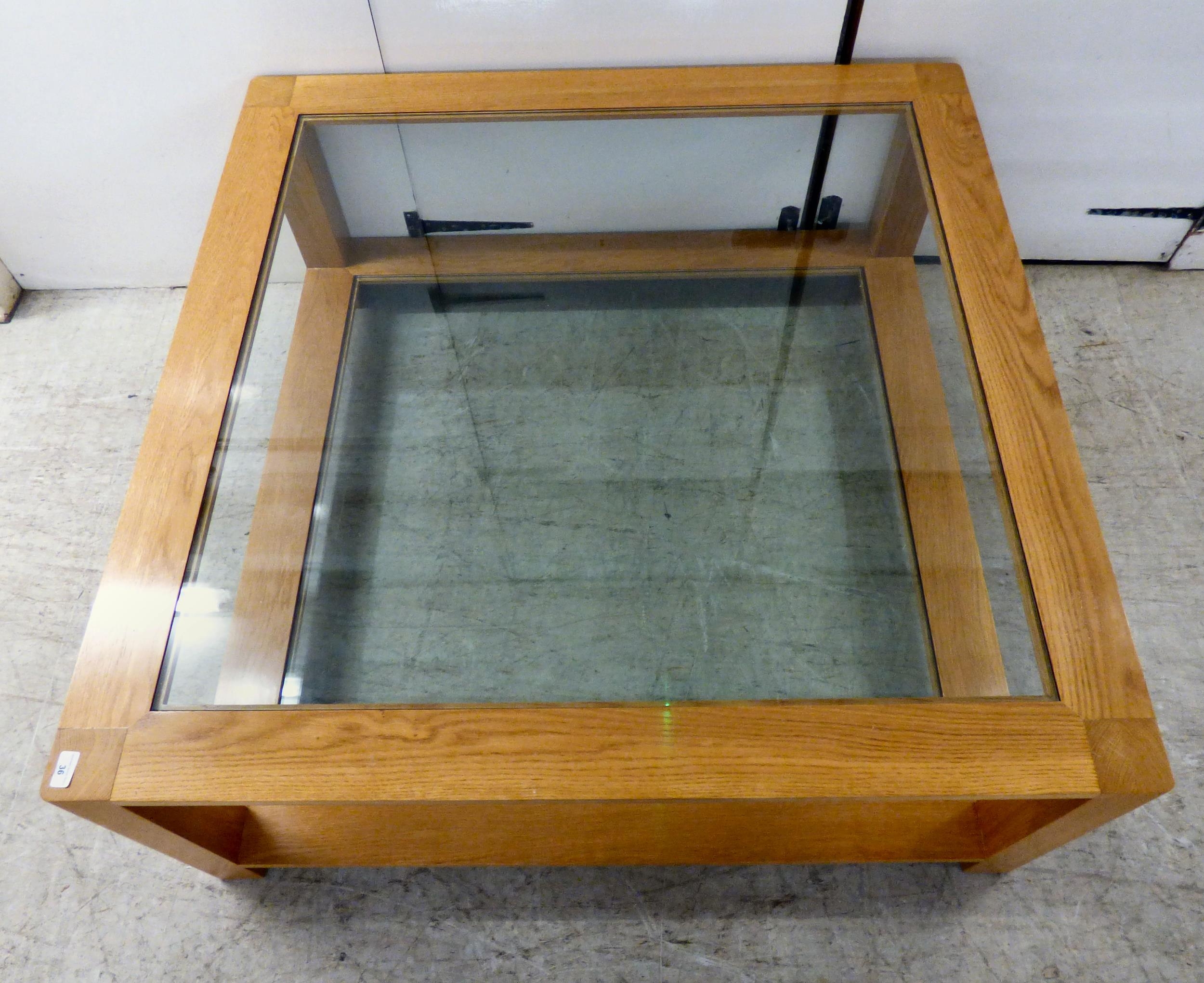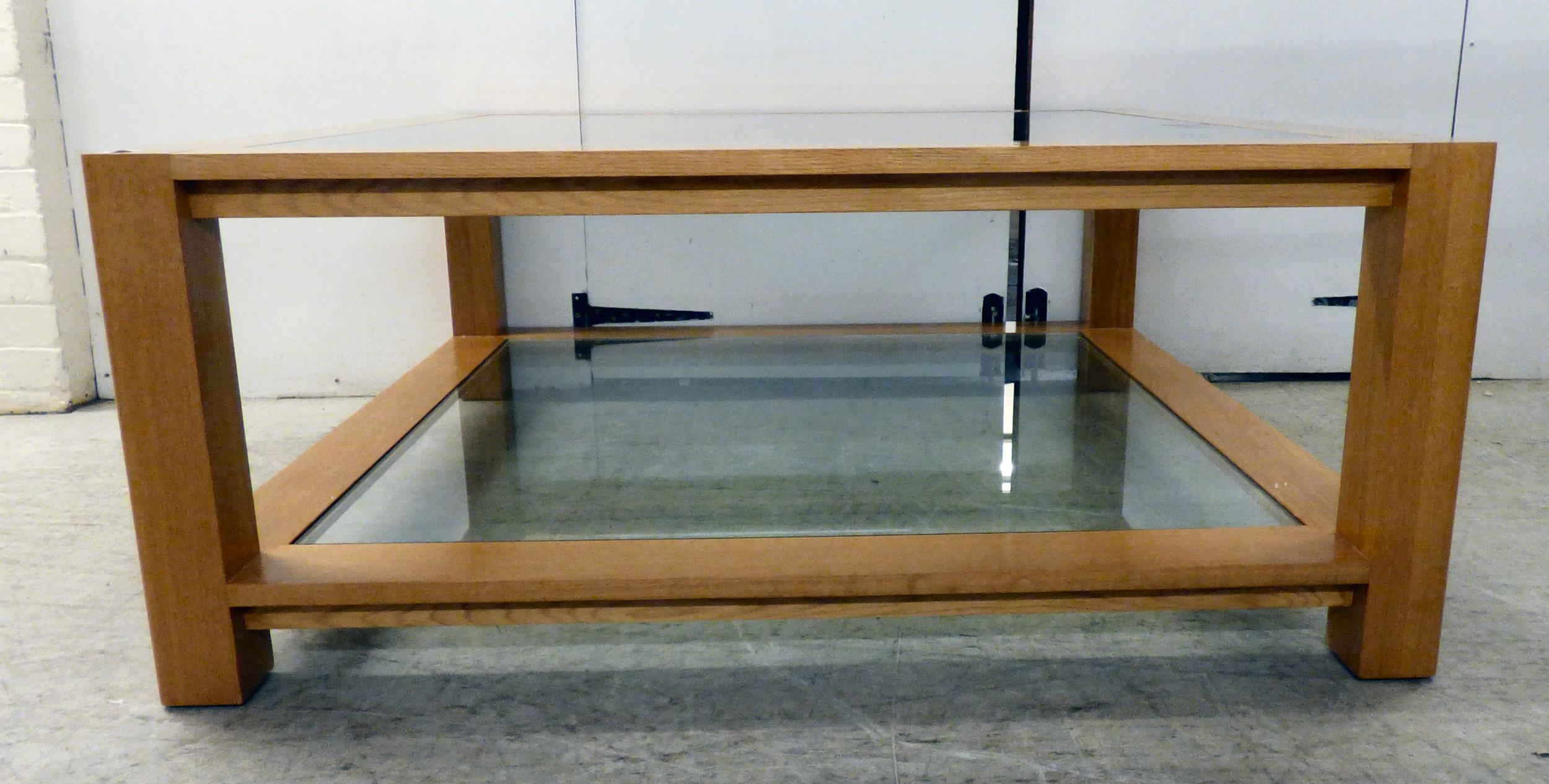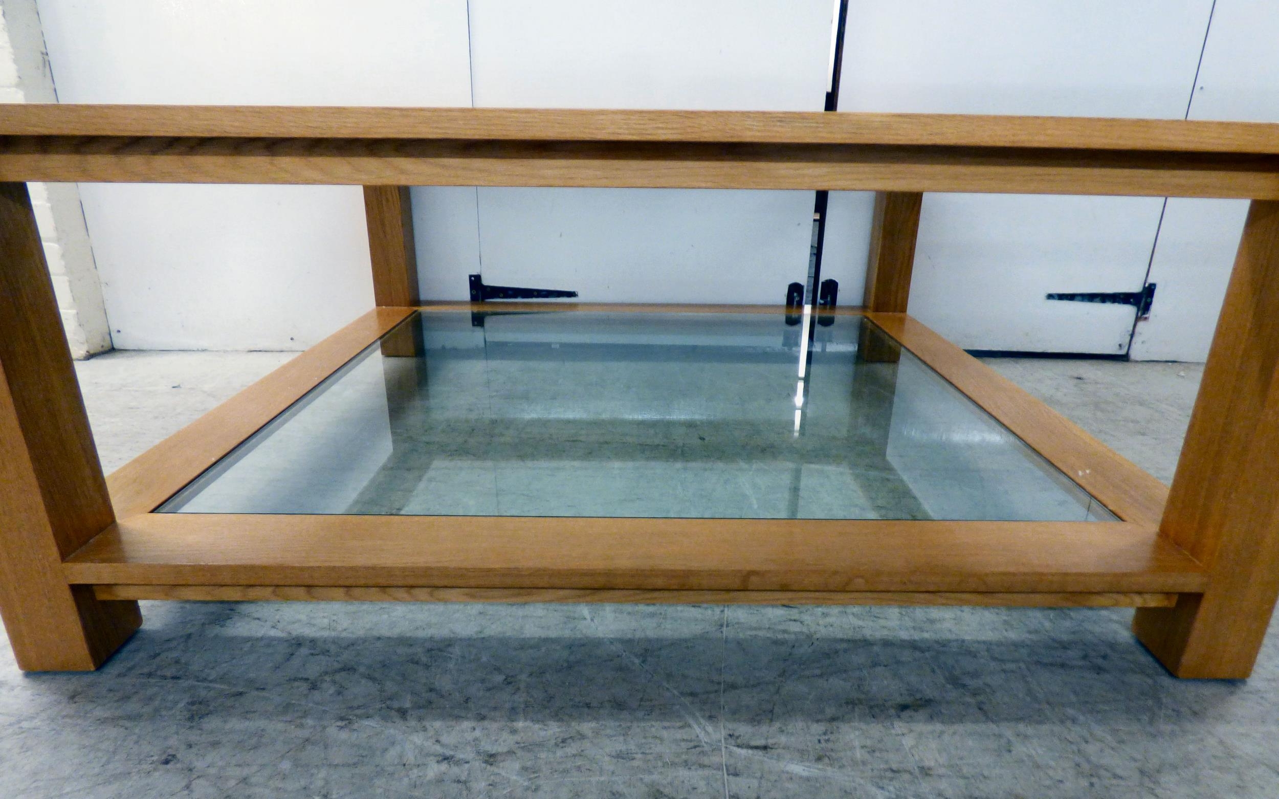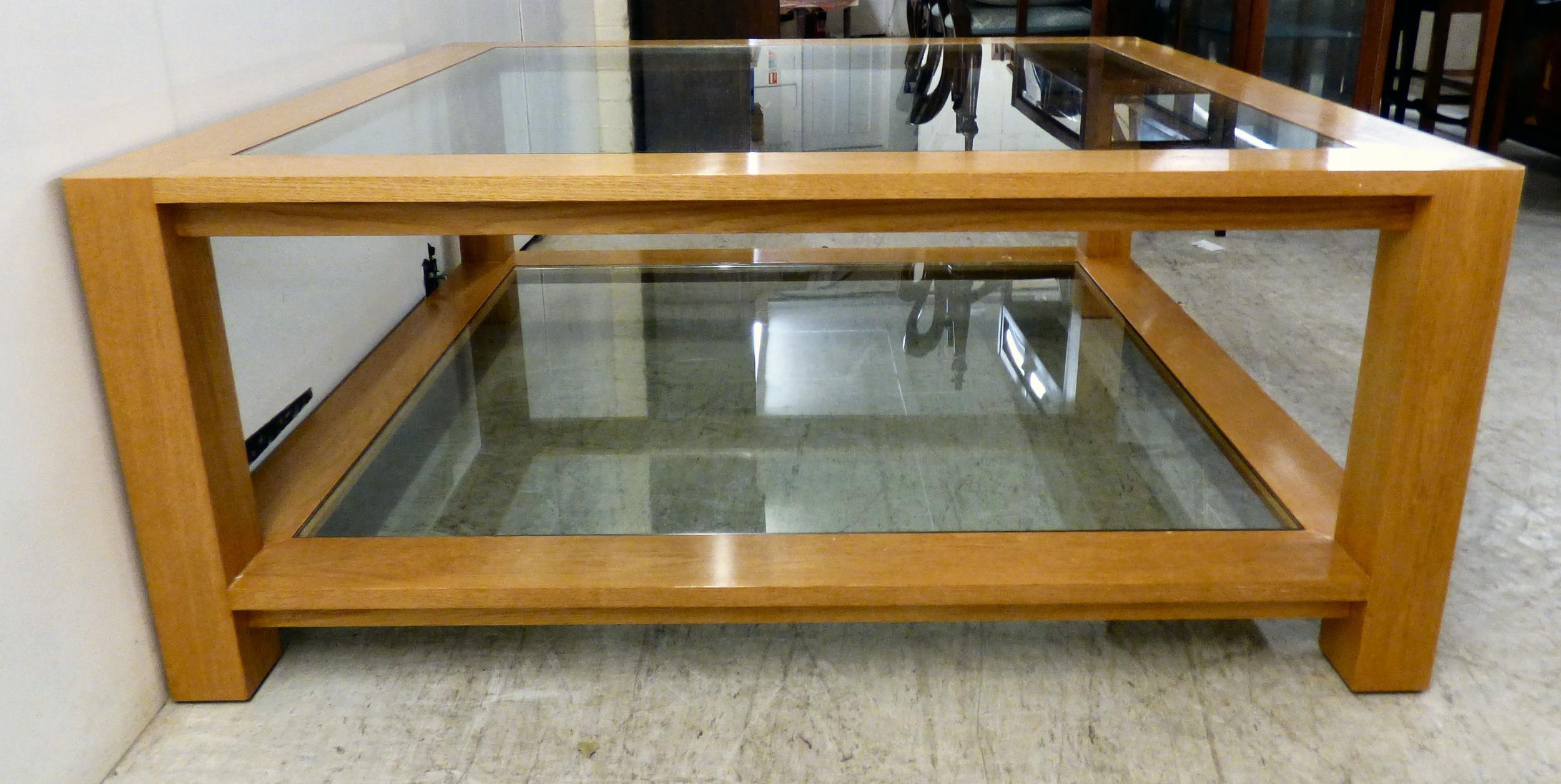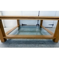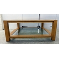 A modern light oak coffee table with two inset glass panels, raised on block feet 20"h 47"w