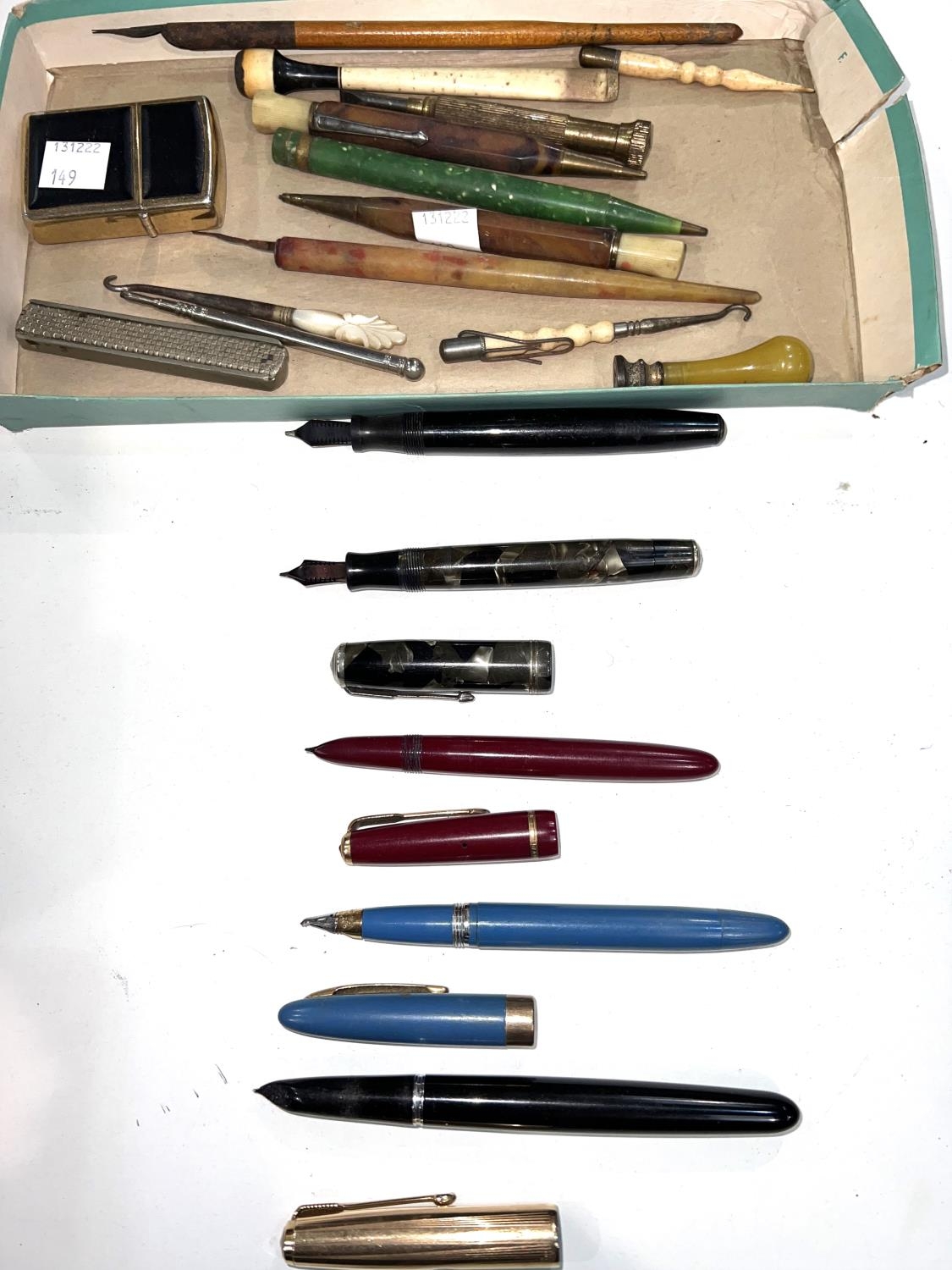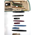 Three Parker vintage fountain pens; other pens; pencils; etc.