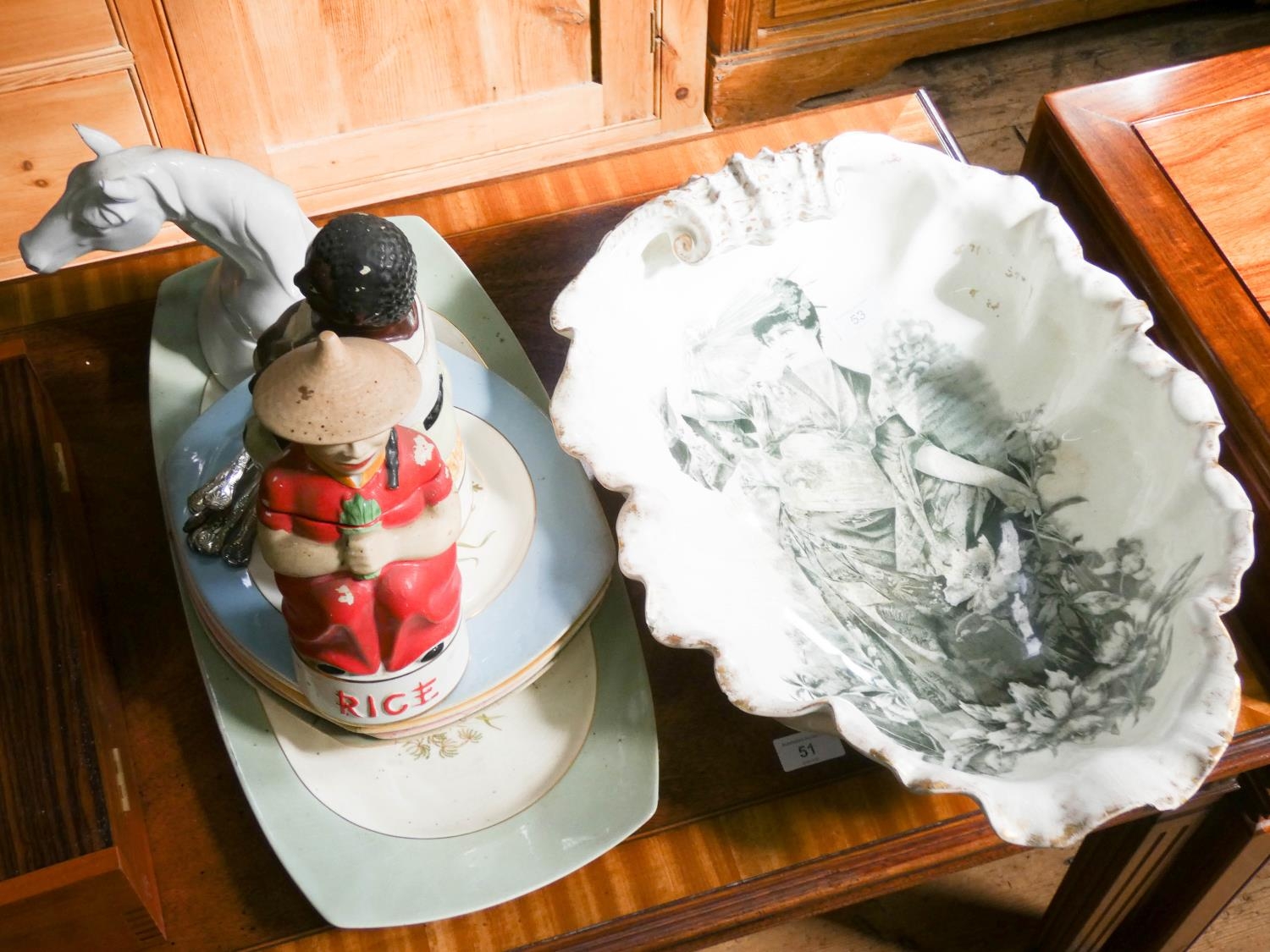 A large shell shaped figure decorated toilet bowl, plates, figure ornaments, cake forks etc