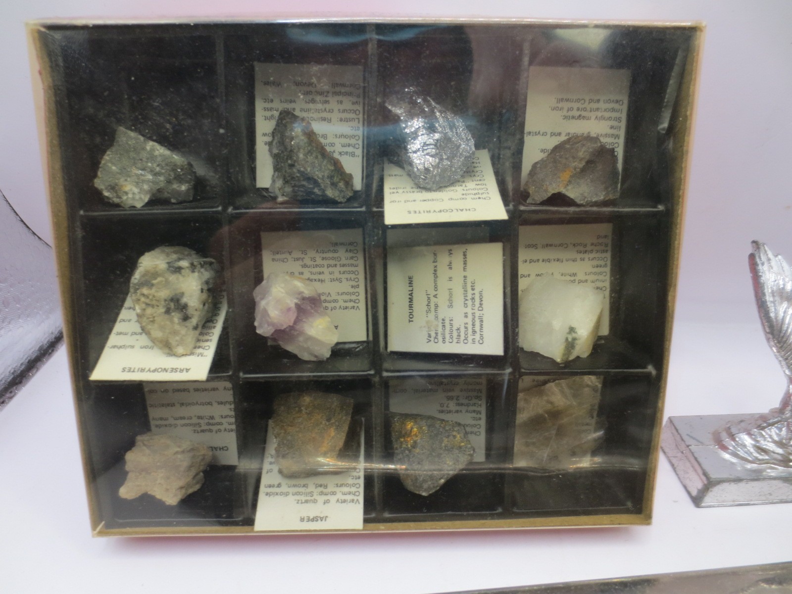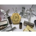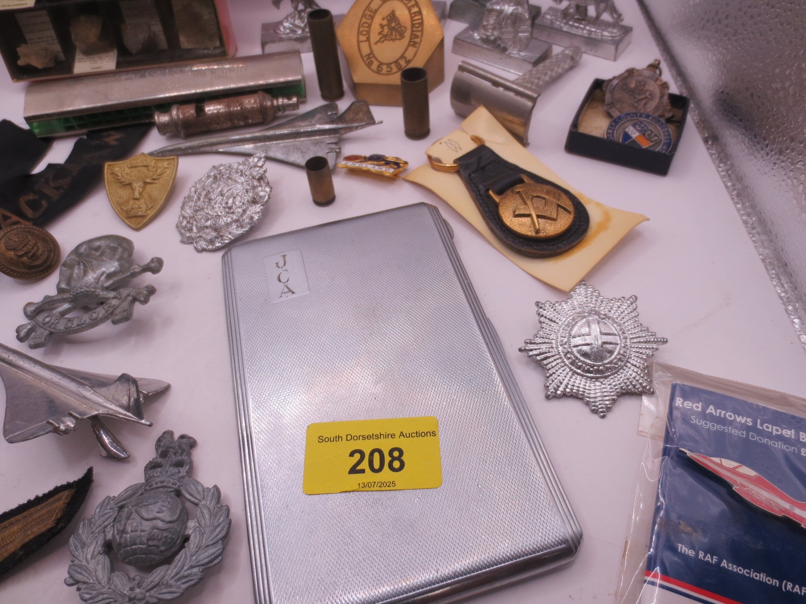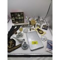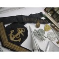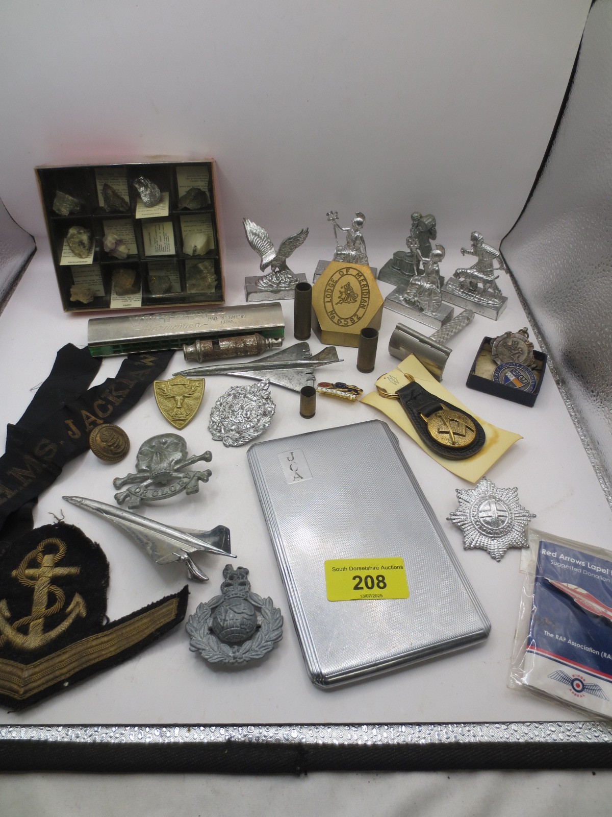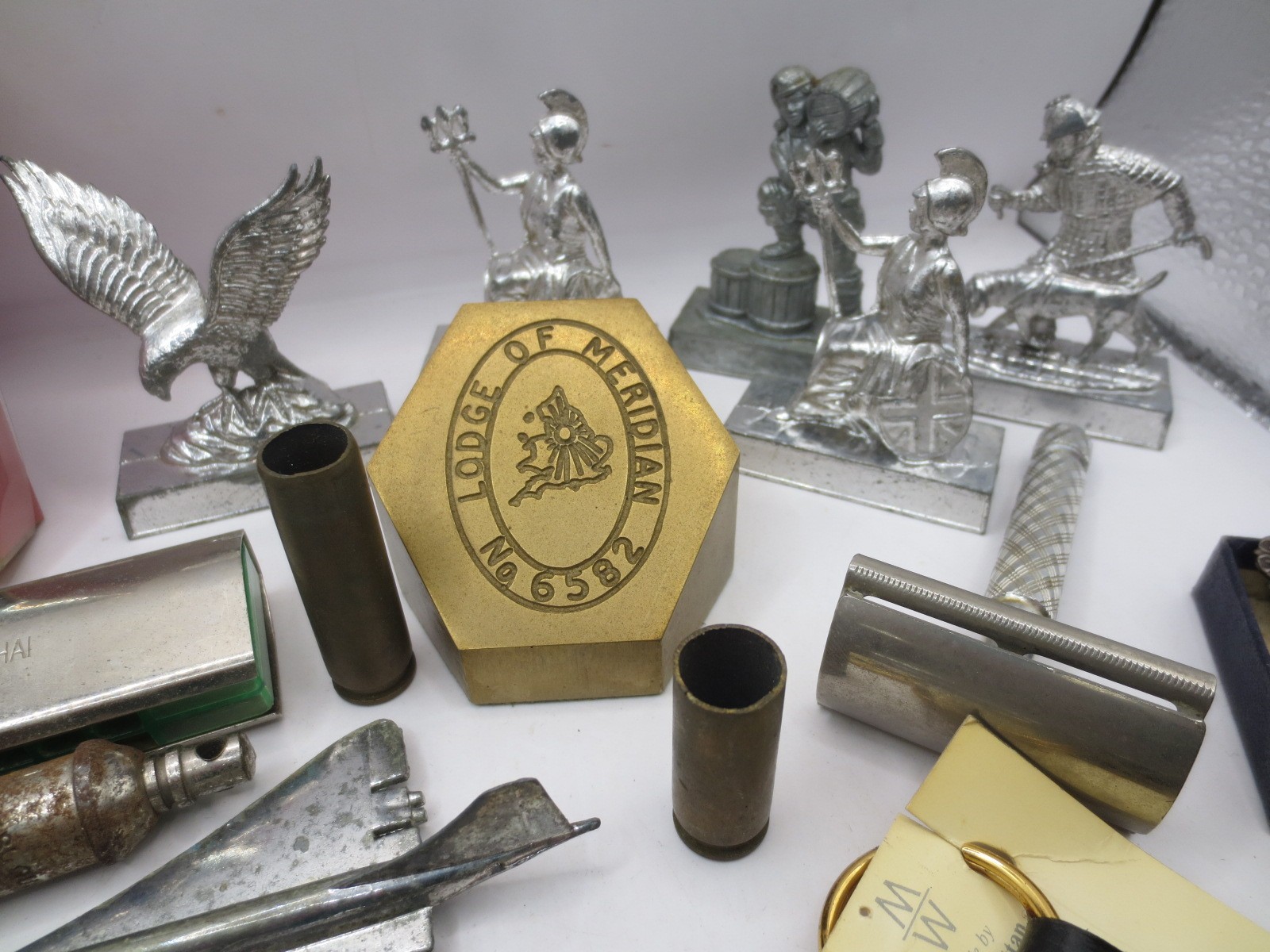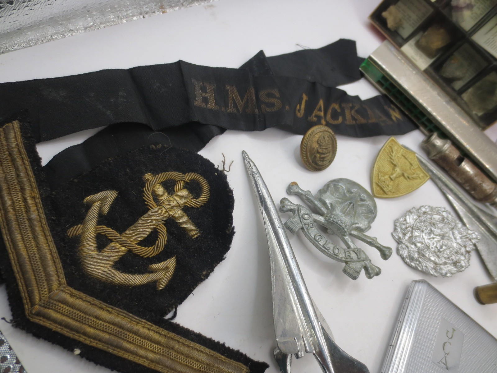 An assortment of militaria and other items including RN chevron in bullion braid, a cap tally for HMS Jackdaw, a Masonic paperweight in brass, various white metal figures of Britannia, eagles etc, cap badges etc