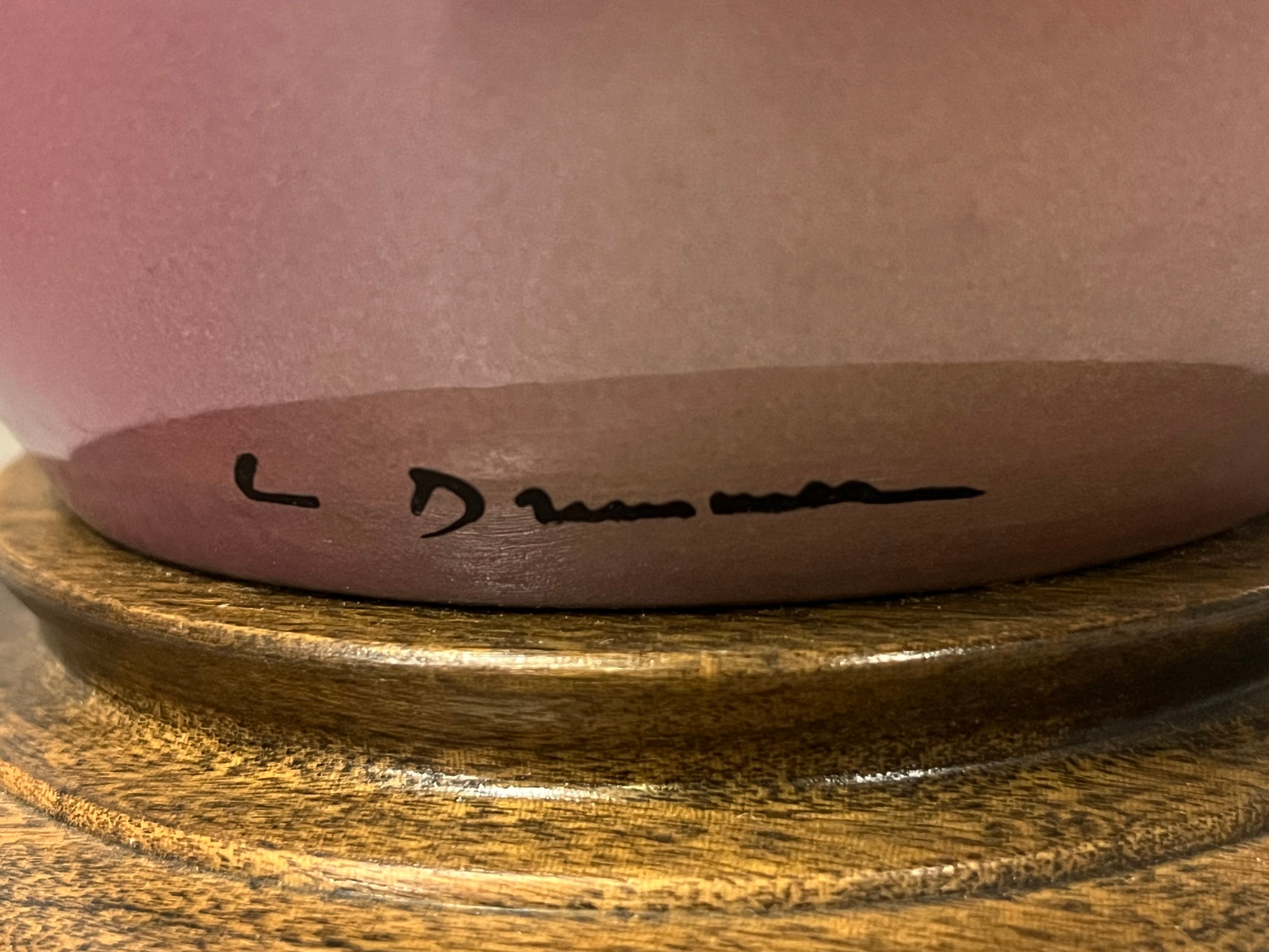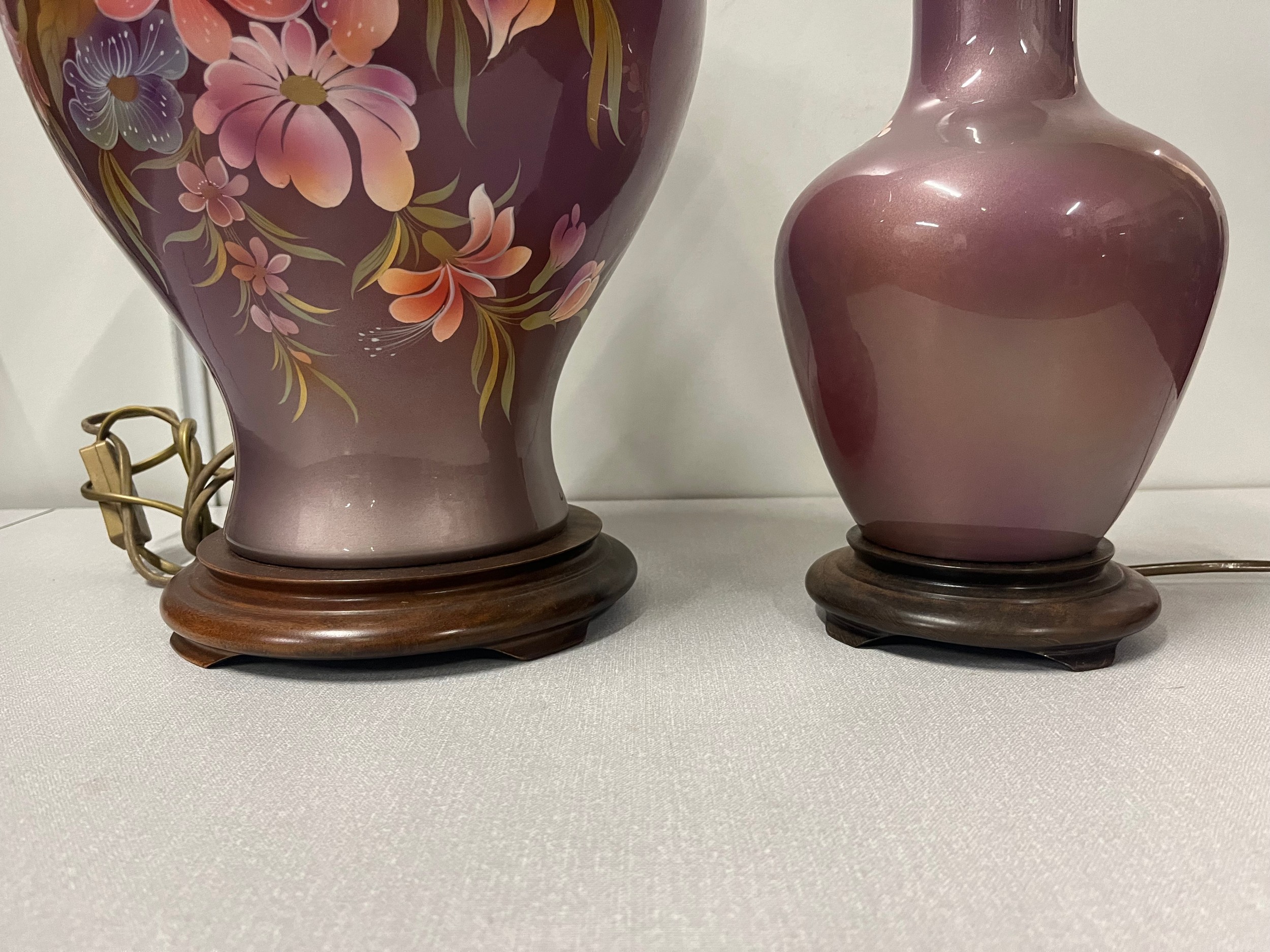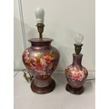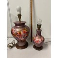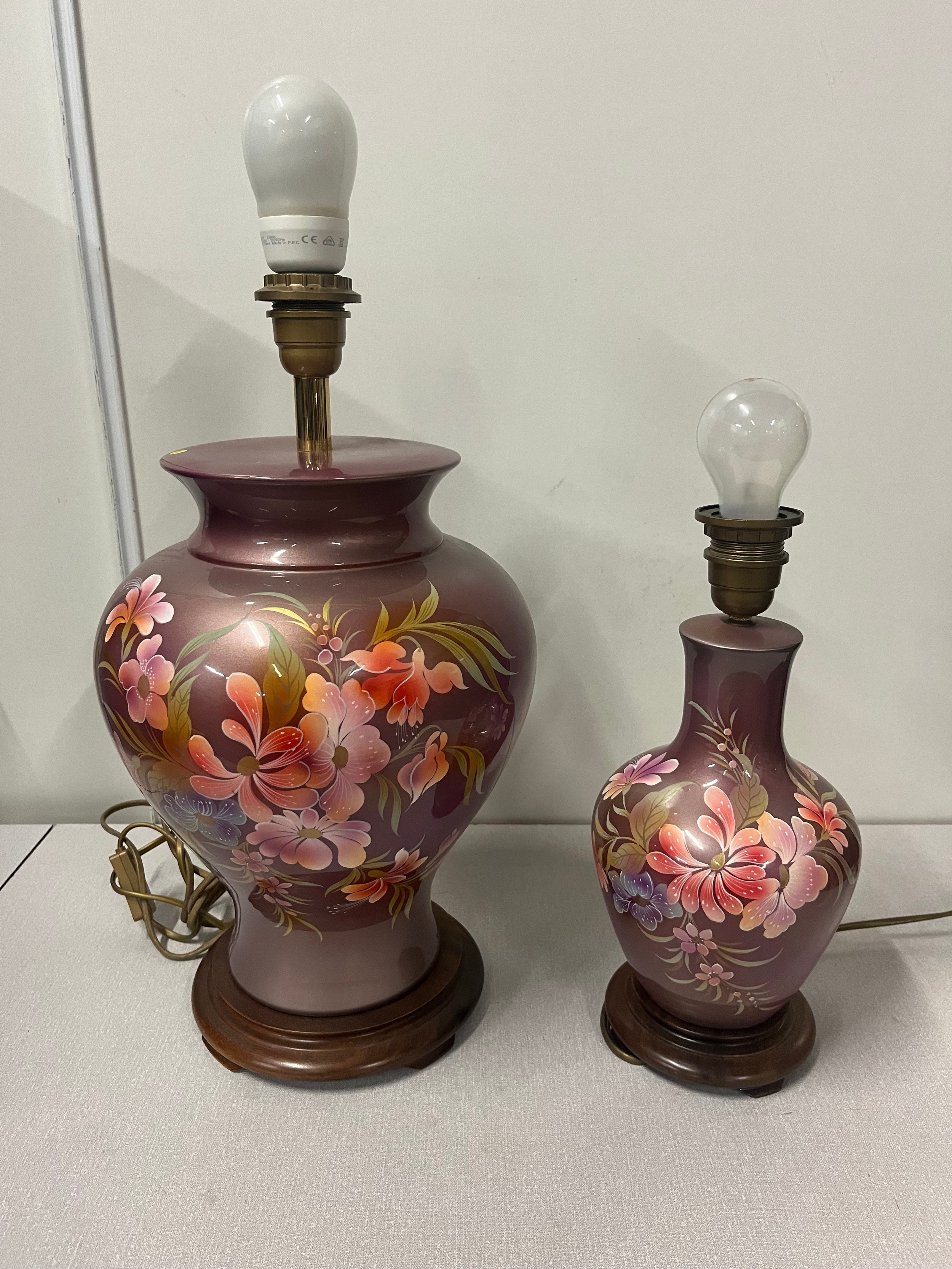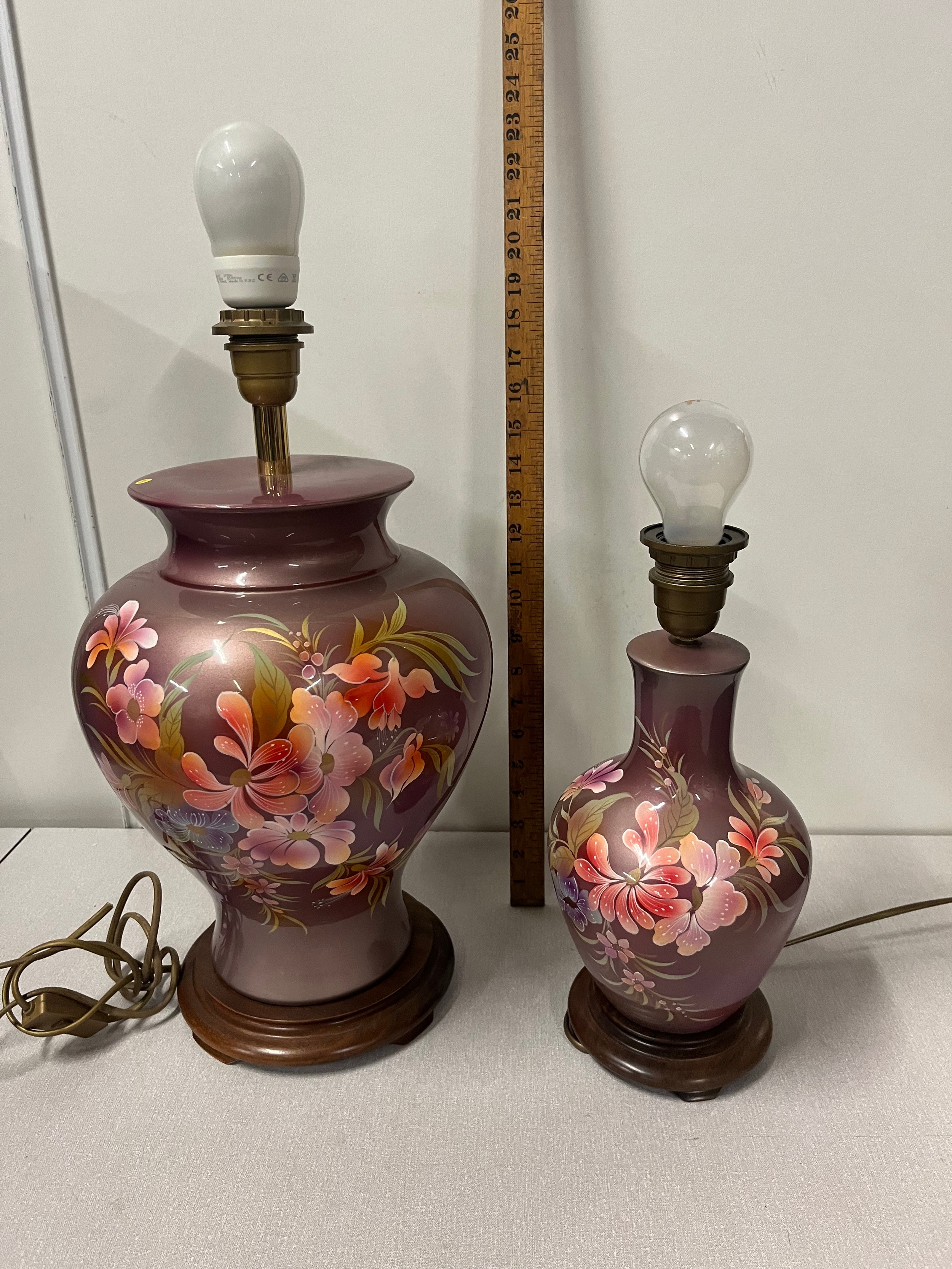 A pair of wood & ceramic floral table lamps signed by L. Drummond made in France. Tallest 18"