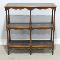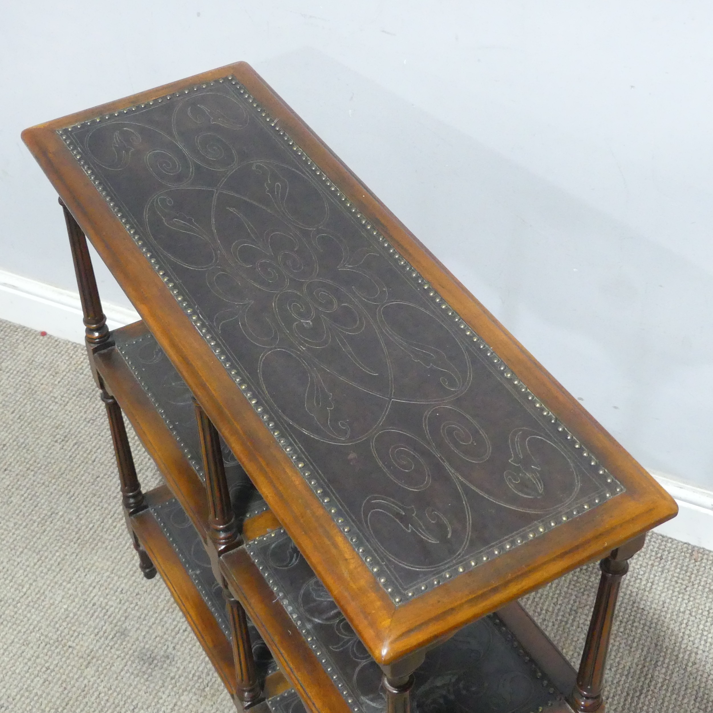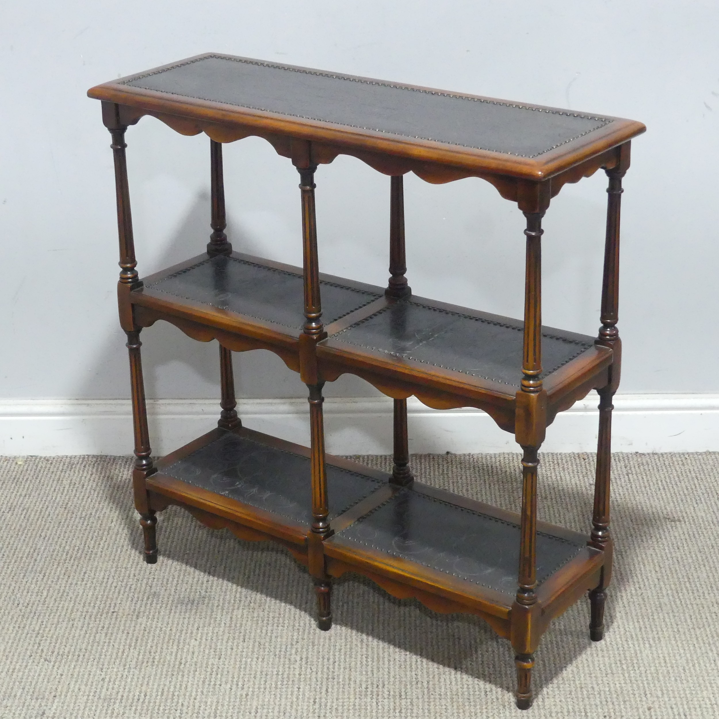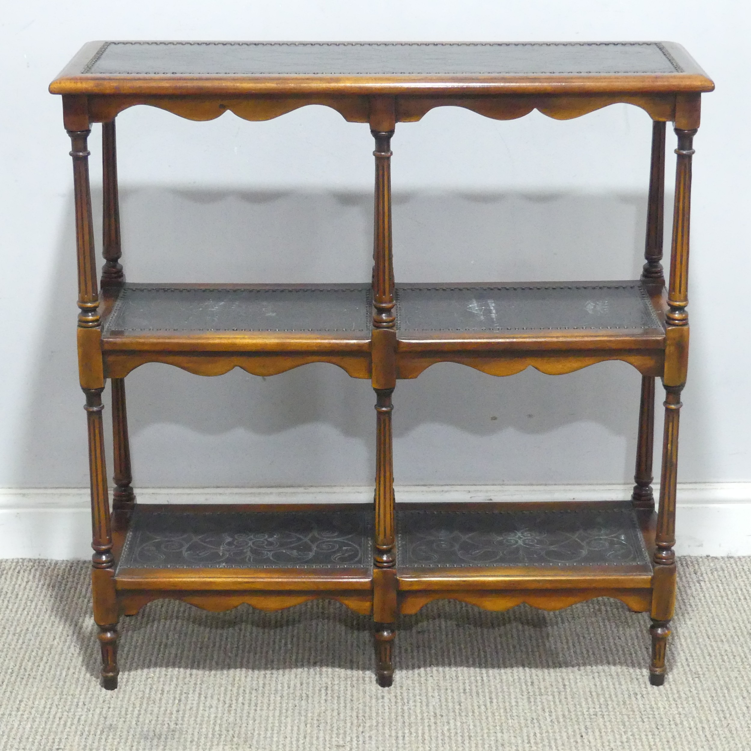 A Theodore Alexander Edwardian-style walnut open bookcase, with foliate-embossed studded black leather, complete with reeded supports and shaped aprons, W 75 cm x H 80 cm x D 27 cm.