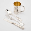 the mug, fork and spoon by Charles Boyton, London 1883; the knife by George Unite, Birmingham 1882; cased. Mug 8cm high, 4.6 troy ounces gross excl. knife