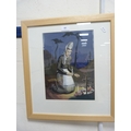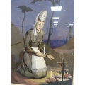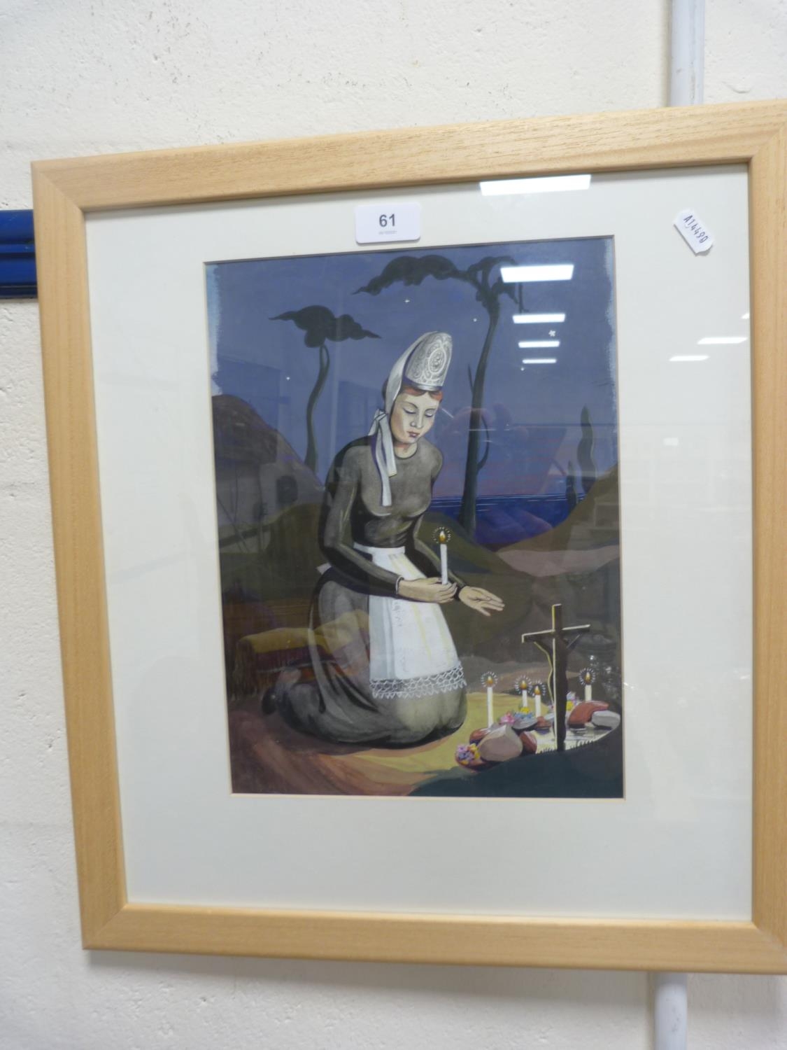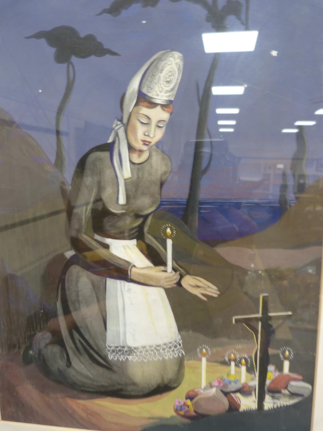 Woman lighting candles at a graveside, signed indistinctly lower left.
