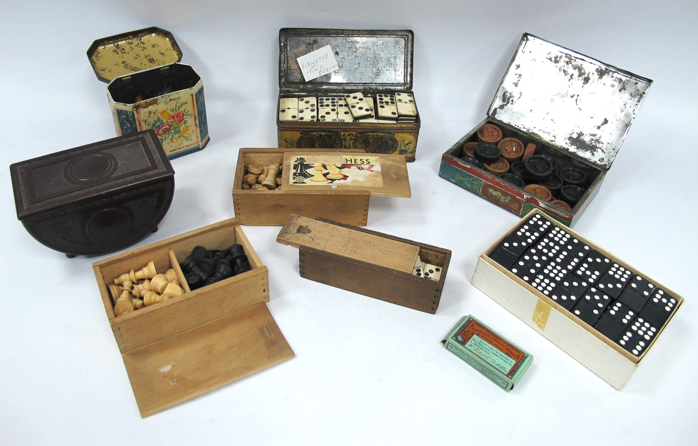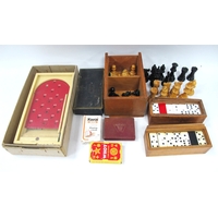 Chess, draughts, dominoes, Teofani cigarettes, bakelite box, etc:- One Tray.