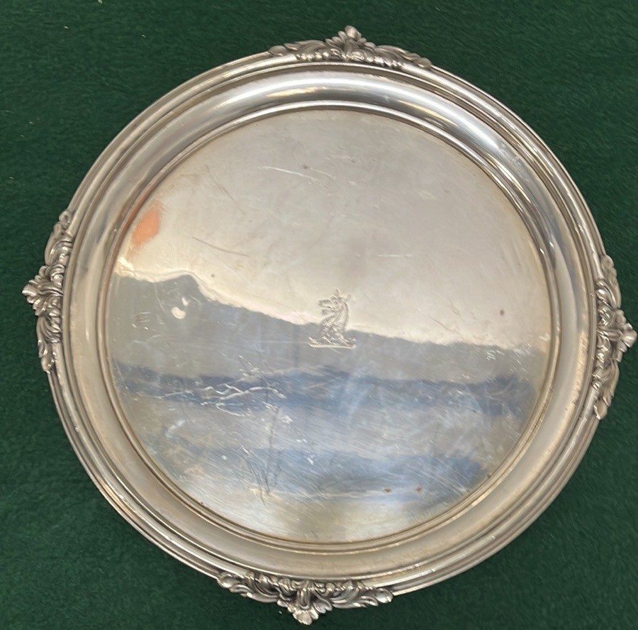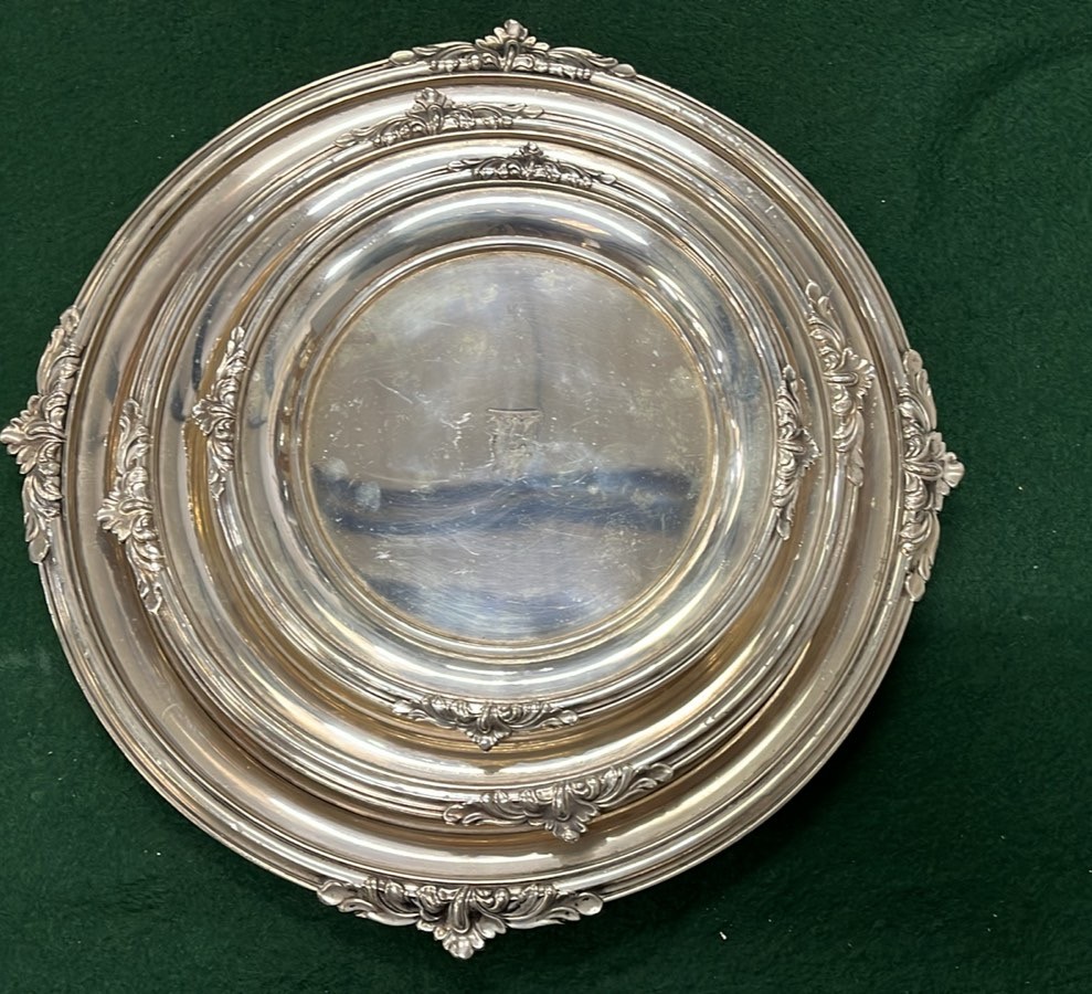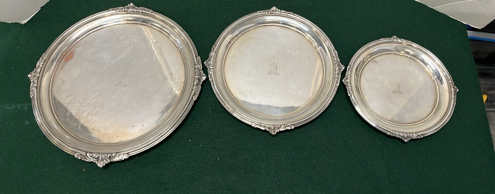 THREE HEAVEY SILVER PLATED SERVING TRAYS WITH HORSE HEAD MOTIF