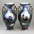 A pair of large two-handled vases baluster shape decorated in shades of lilac and blue with woodland scenes of figures amongst ruins, height 44cm