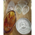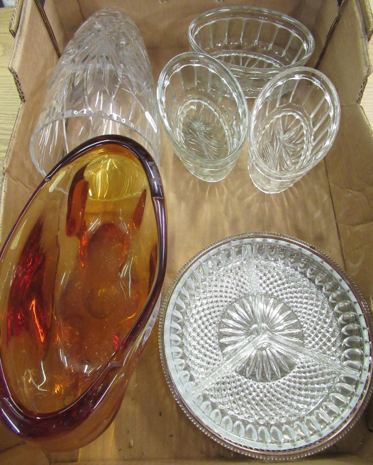 1970's amber tinted lead crystal vase H15.5cm, three moulded glass jelly moulds, lead crystal trumpet vase H26cm and a three division hors-d'oeuvres dish on silver plated stand