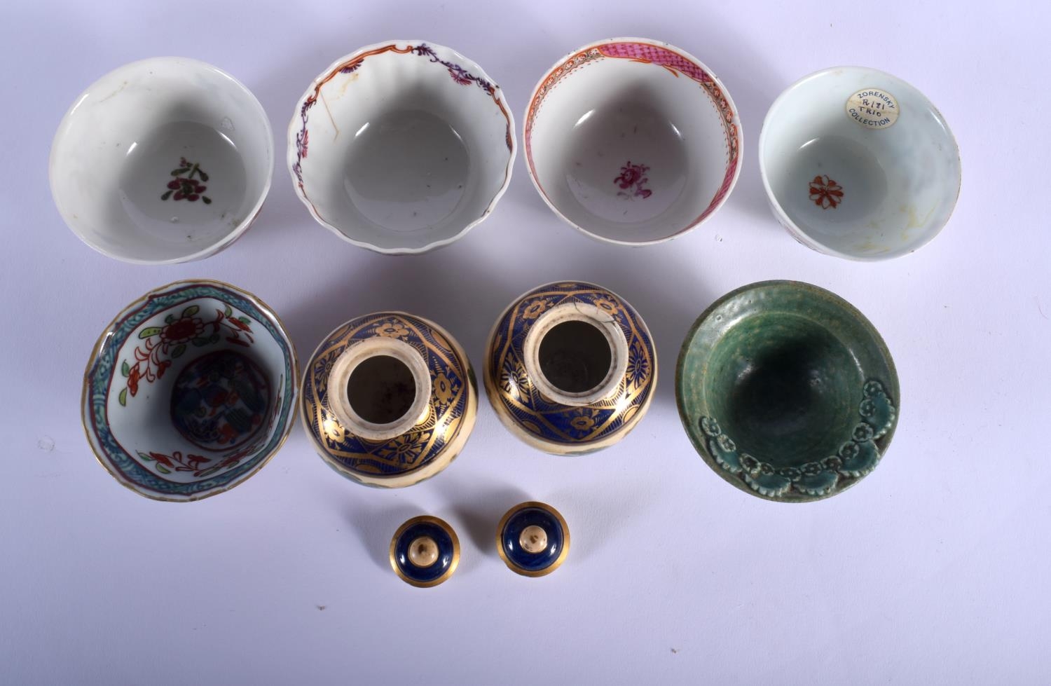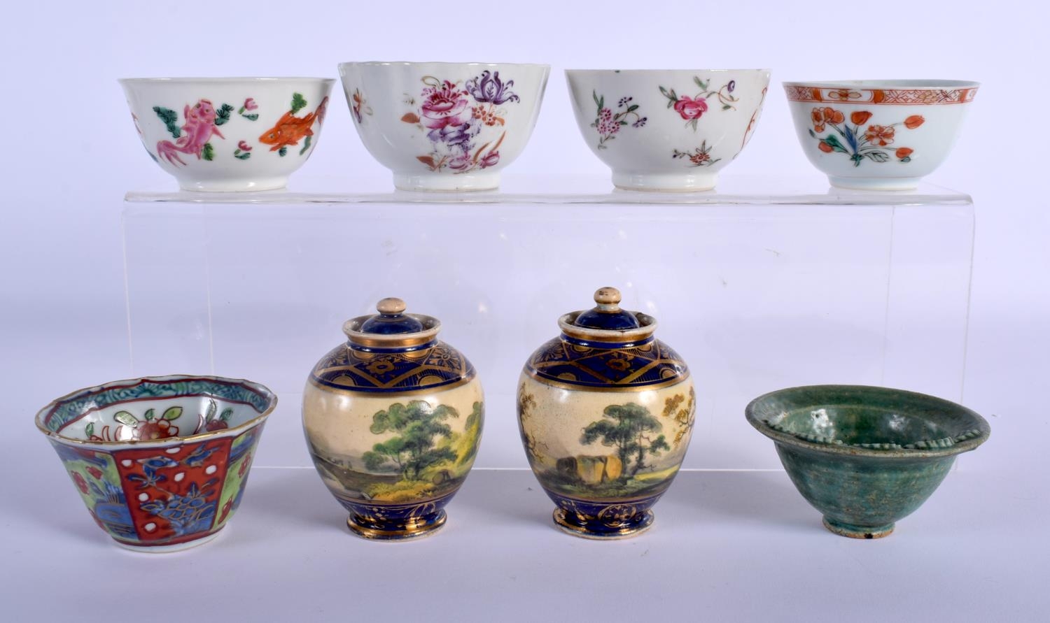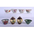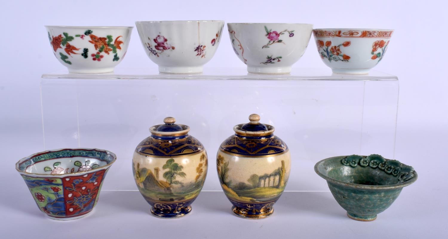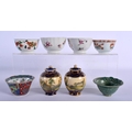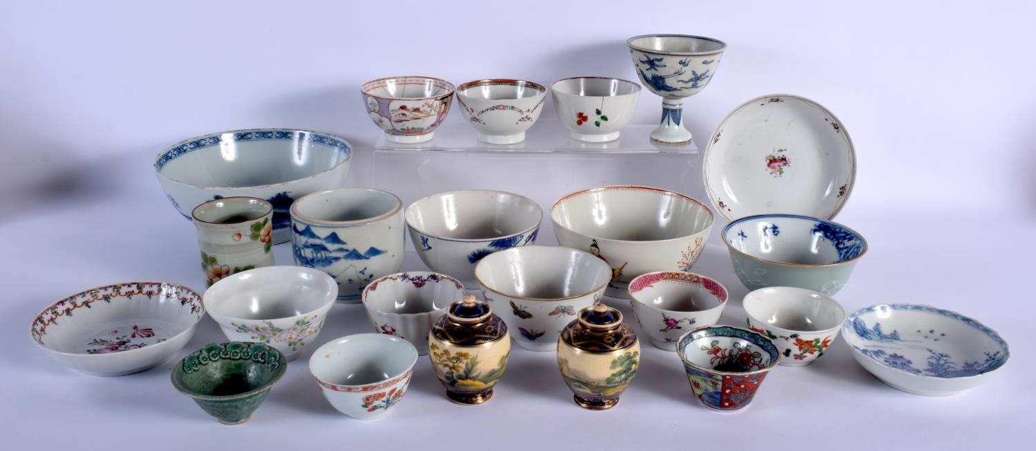 COLLECTION OF CHINESE: A STEM CUP, 6 BOWLS, 3 SAUCERS, 8 TEABOWLS, A BEAKER, A JAR BASE AND A SMALL MOULDED GREEN BASIN, TOGETHER WITH A PAIR OF SATSUMA STYLE VASES. Stem Cup 9cm high, Beaker 8cm high (23)