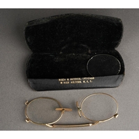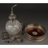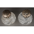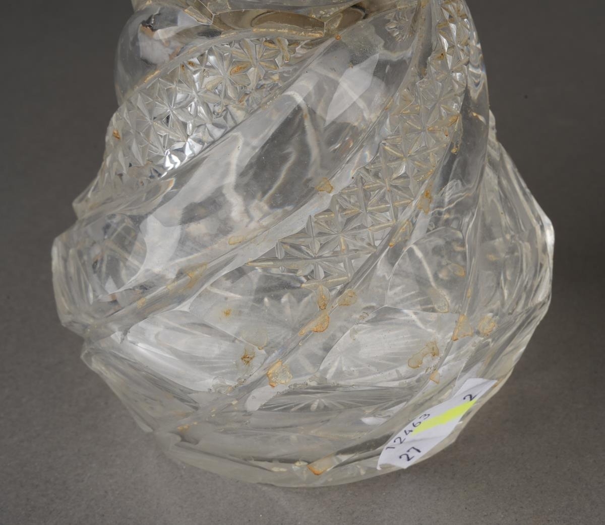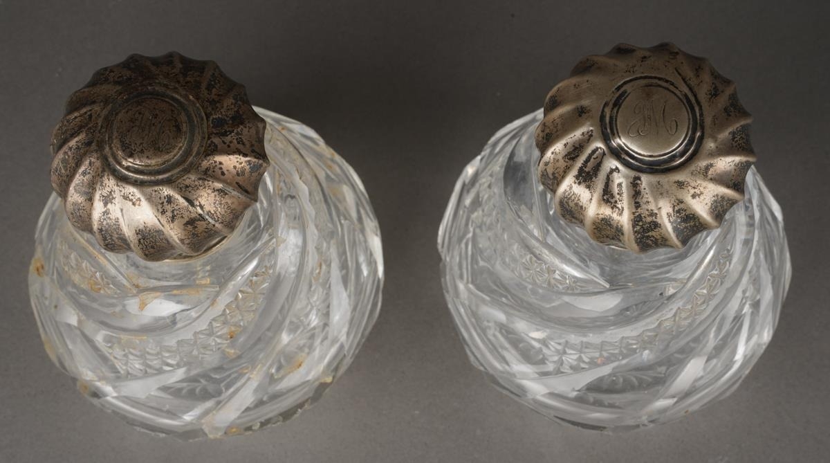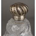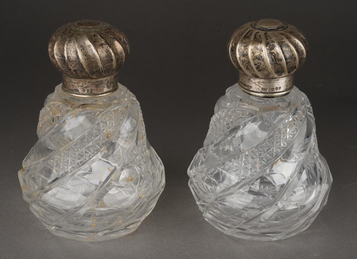 A pair of Victorian trapezoid shaped hobnail cut glass silver mounted scent bottles, with wyvern fluted decoration, one stopper lacking, the silver covers engraved with initials, hallmarked by J.B., London, 1890 [2]