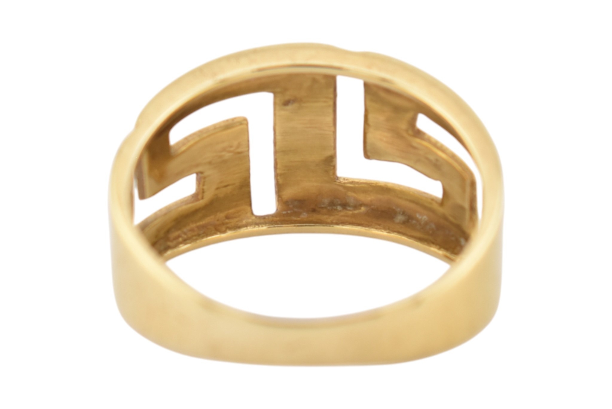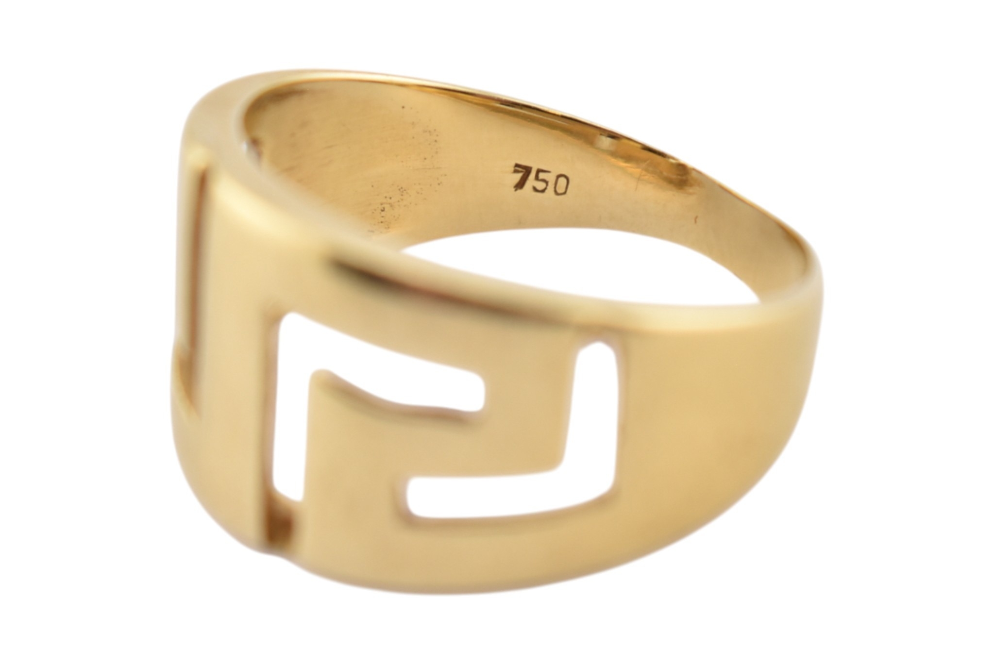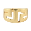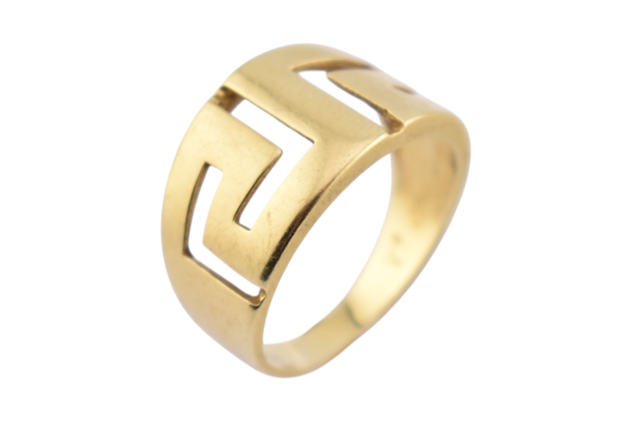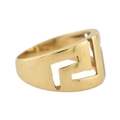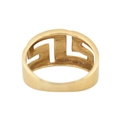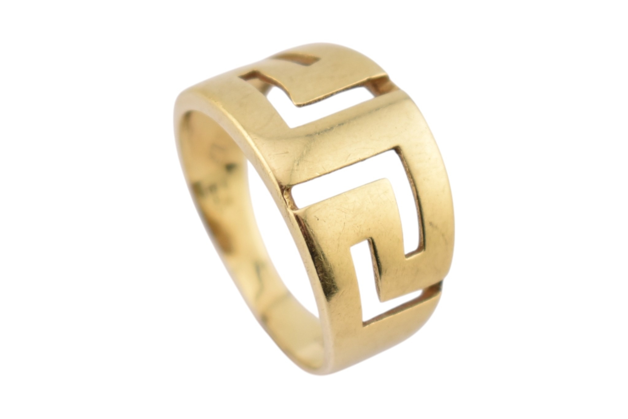 An 18ct gold band ring. The ring with pierced Greek key decoration. Stamped 750. Weight 5.9g. Size R