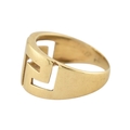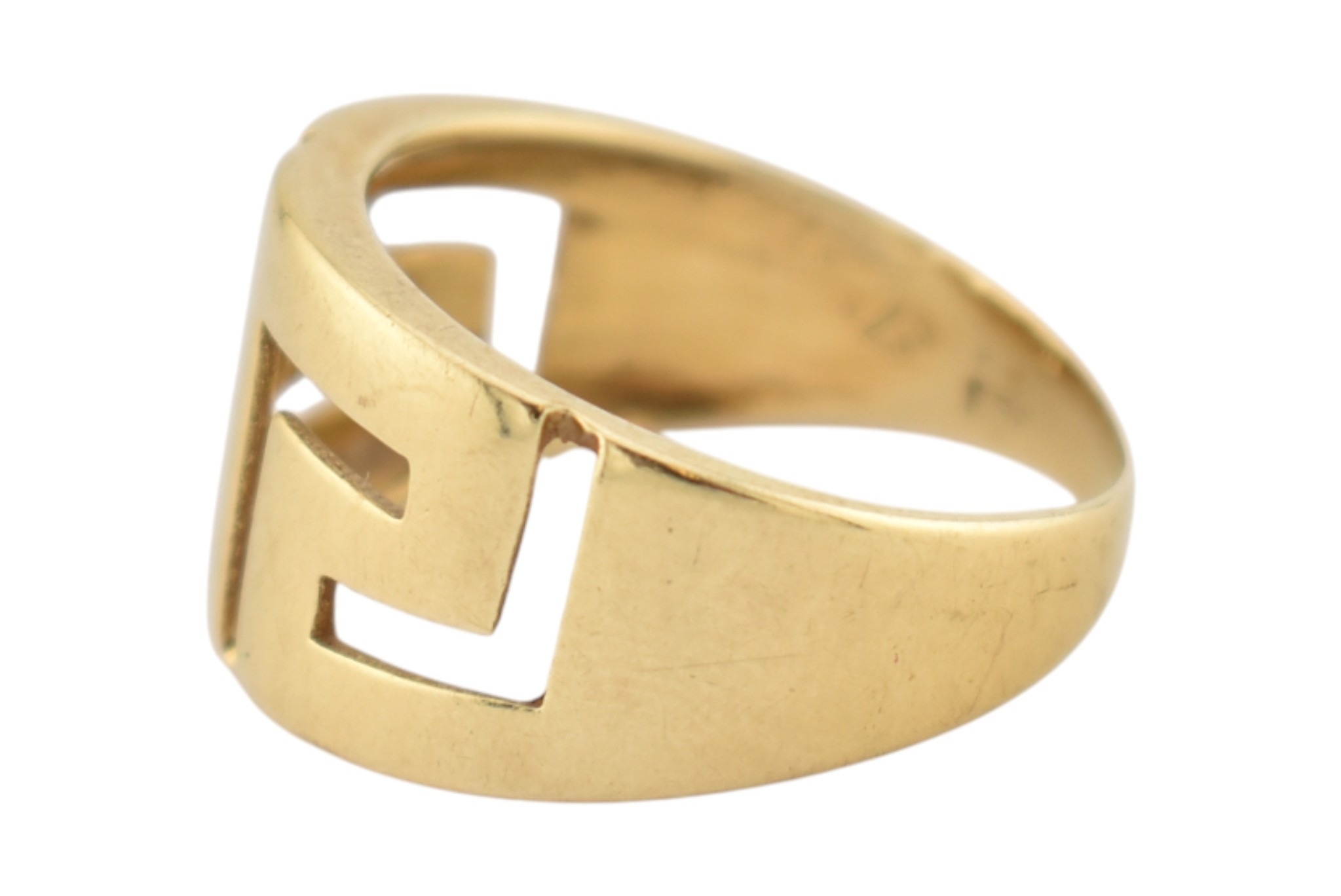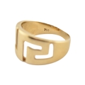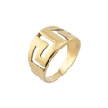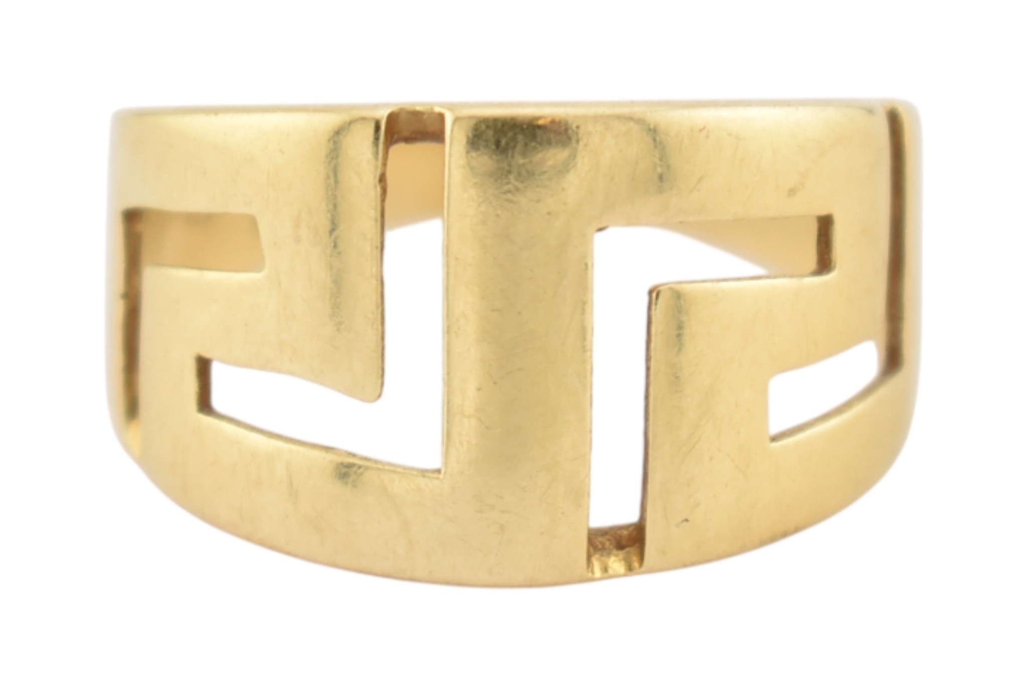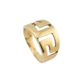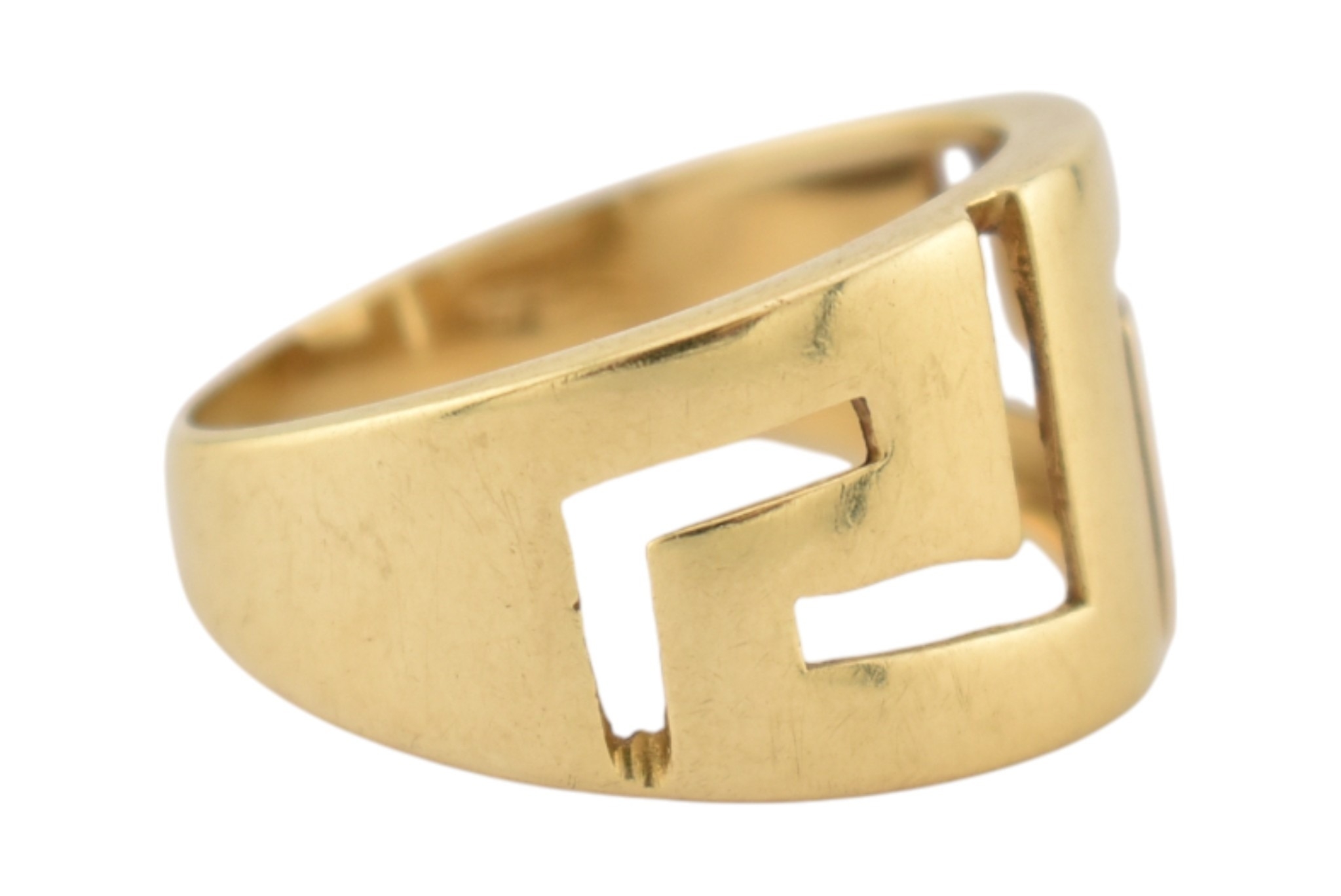 An 18ct gold band ring. The ring with pierced Greek key decoration. Stamped 750. Weight 5.9g. Size R