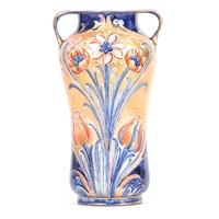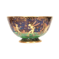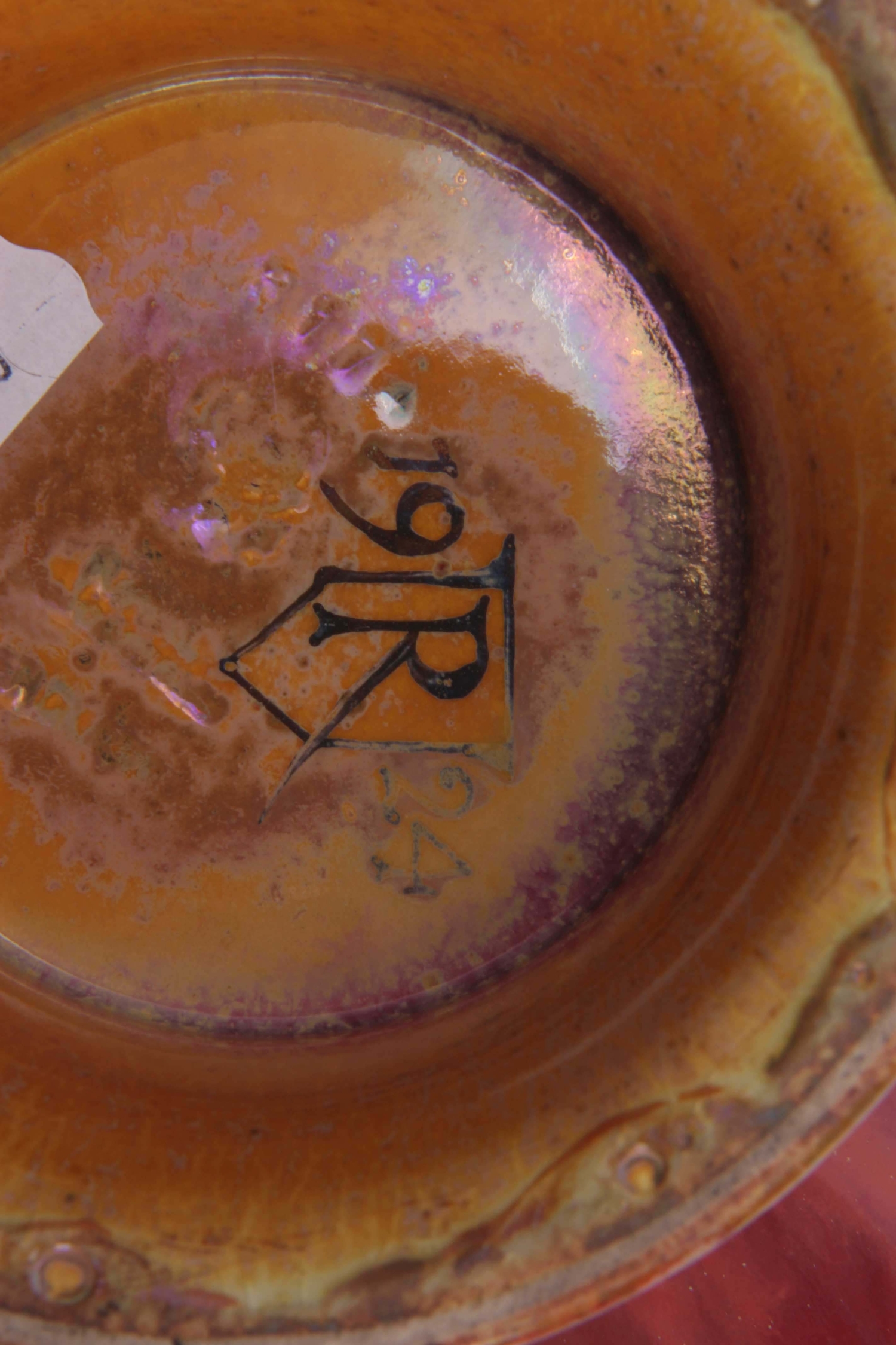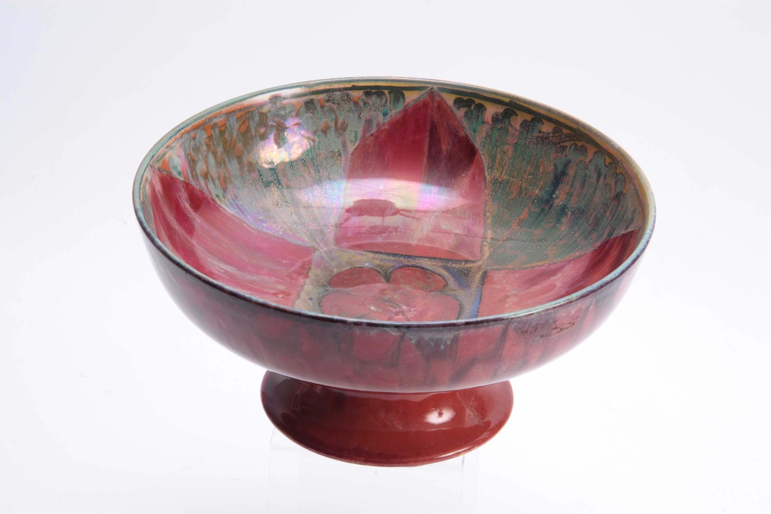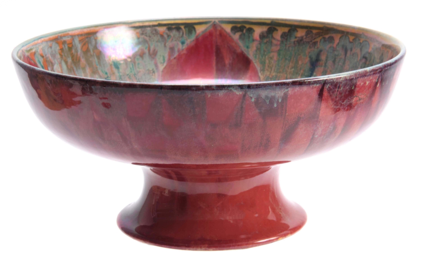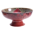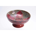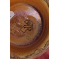 A PILKINGTON'S ROYAL LANCASTRIAN FOOTED BOWL BY GLADYS ROGERS having a red and green glaze with a yellow underside, maker's mark 'R" 1924. 26cm diameter