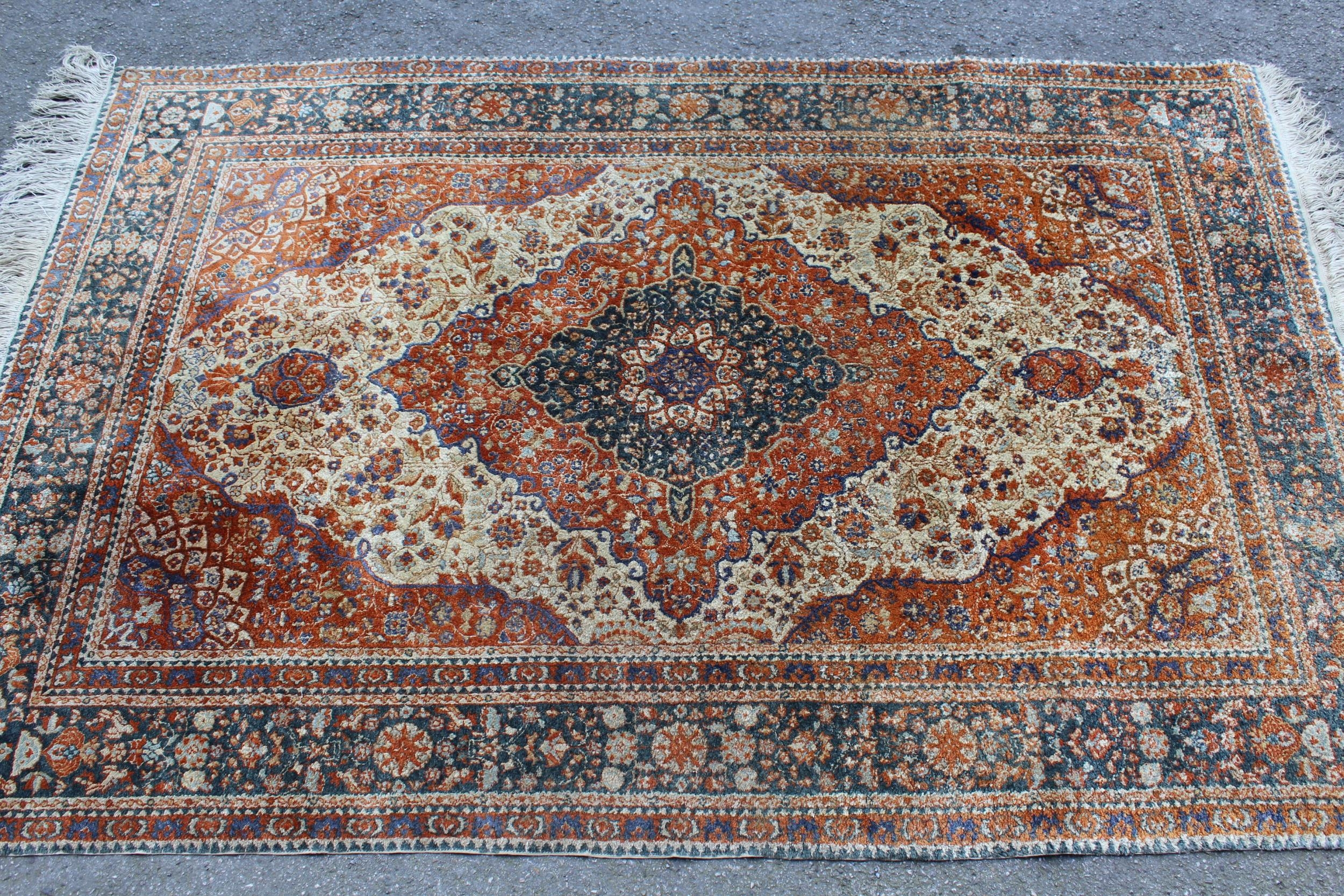 Cotton silk style rug with a medallion and all-over floral design on a cream and rust ground with borders, 6ft x 4ft approximately