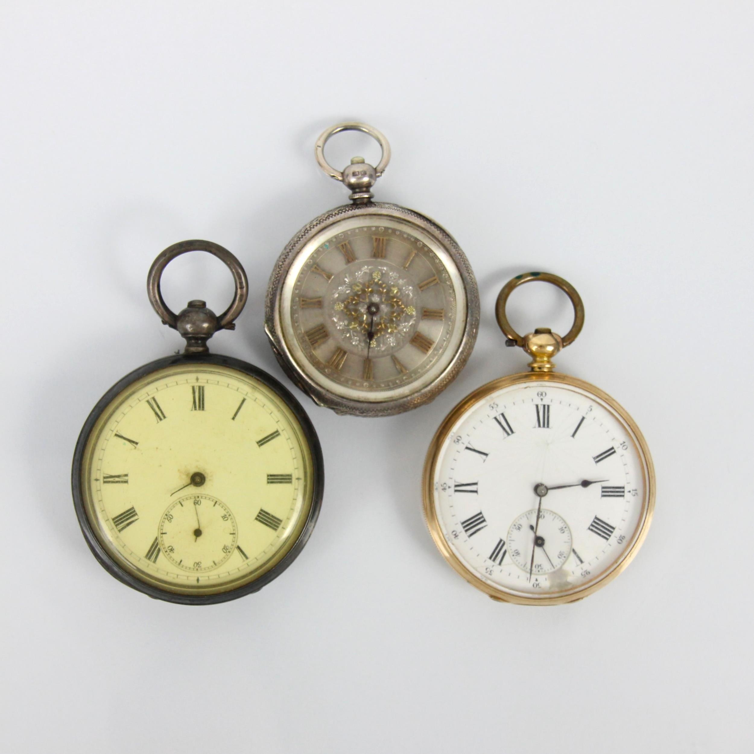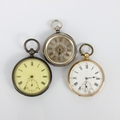 A group of three pocket watches, including a gold coloured open faced example, the circular white dial with Roman numerals, indistinctly stamped to interior, 4.5cm wide, a 19th century silver example, with engraved centre detail, 4.2cm wide, and a further continental white metal example (3)