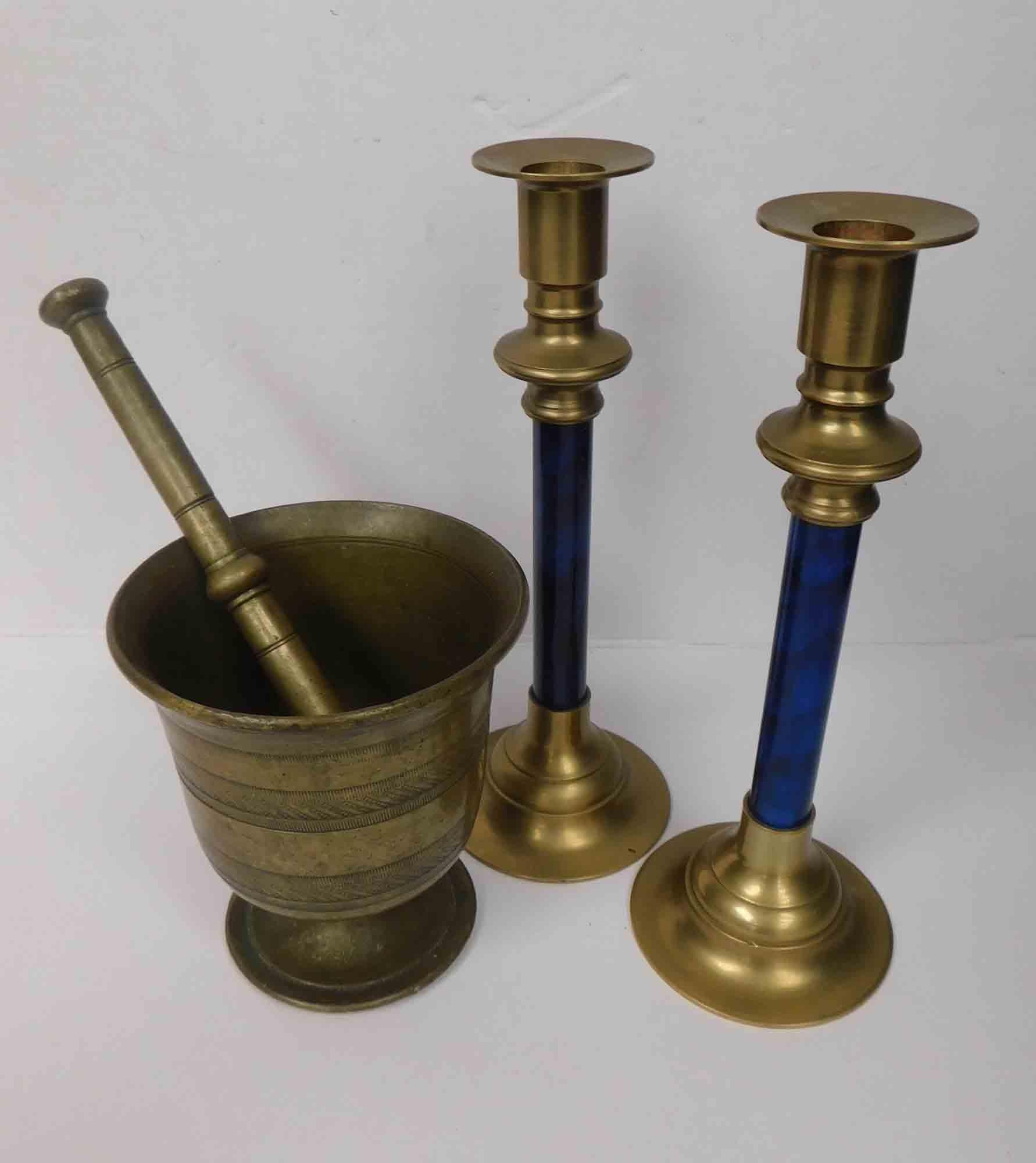 Brass pestle & mortar - & candlesticks