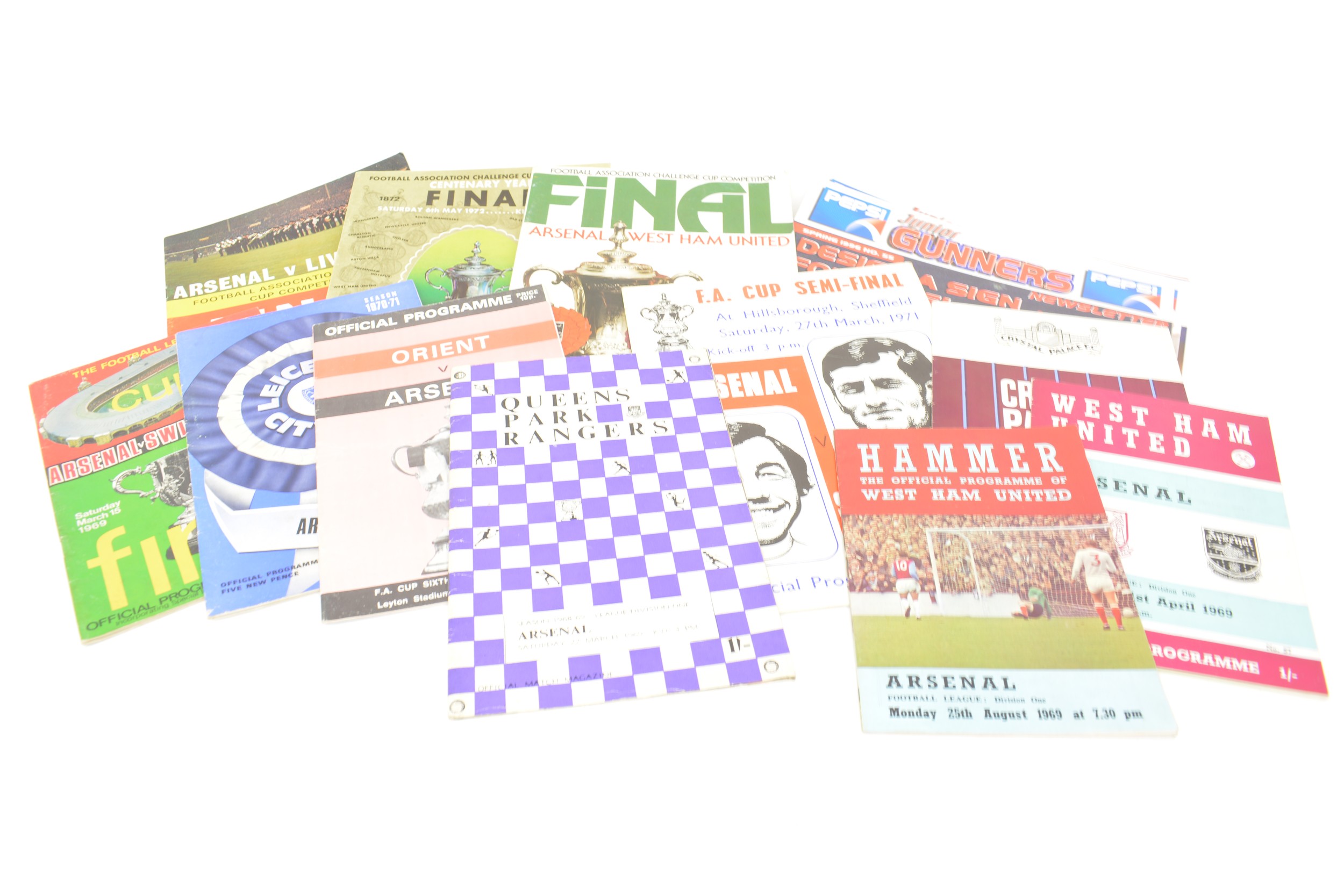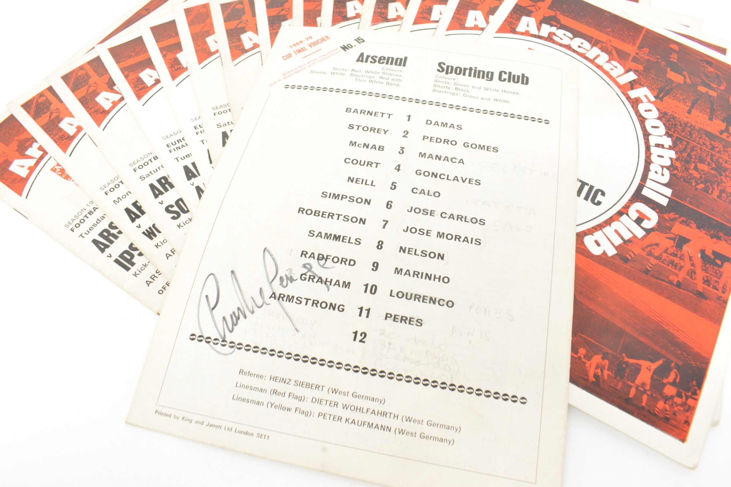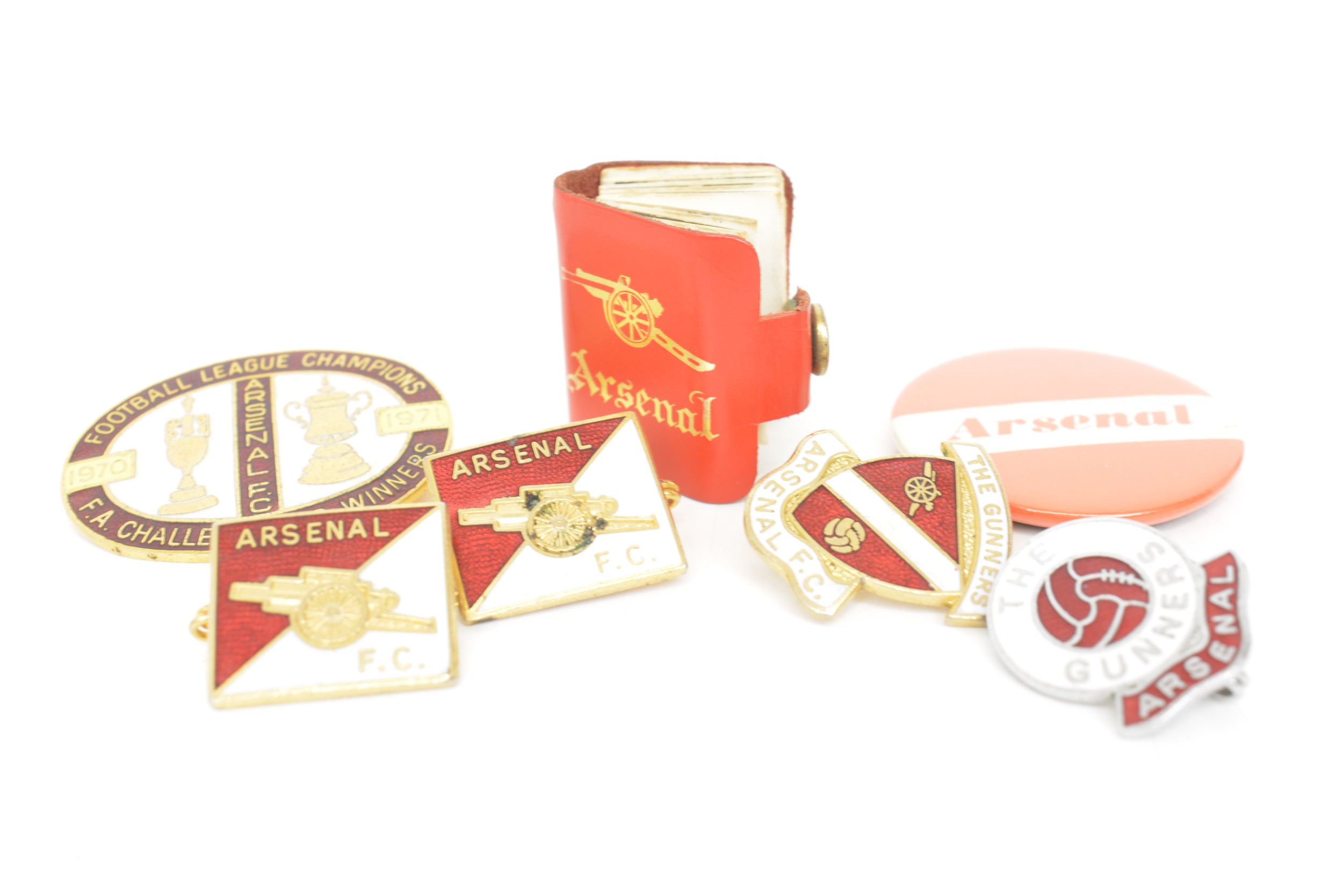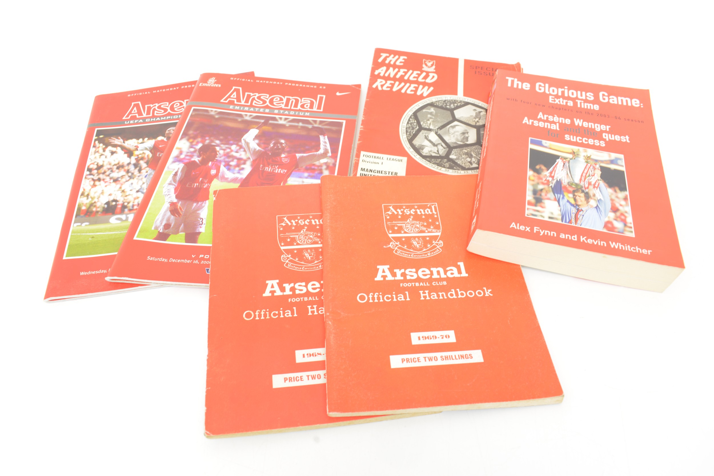 Arsenal Football memorabilia items, including pin badges, programs, handbooks some of which are signed, plus other programs.