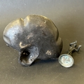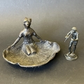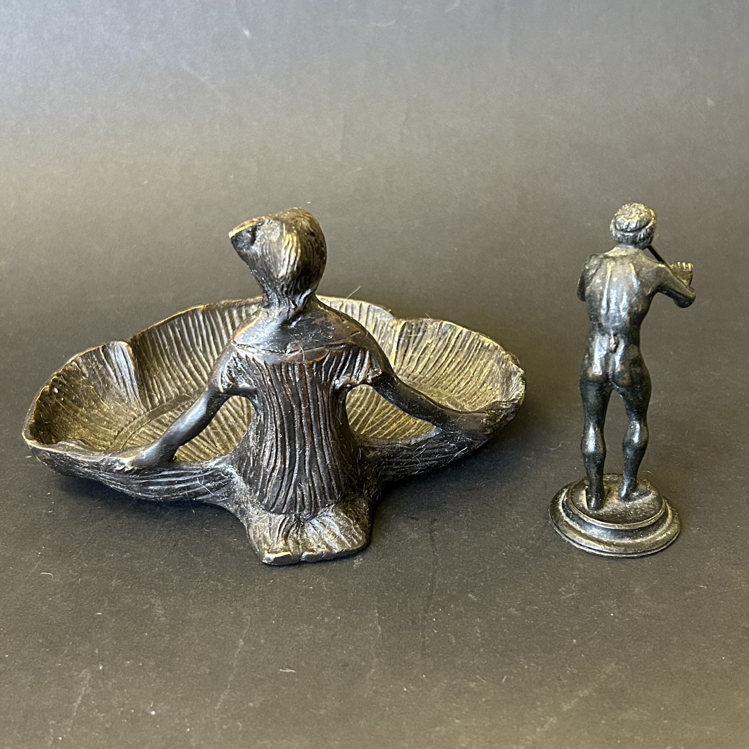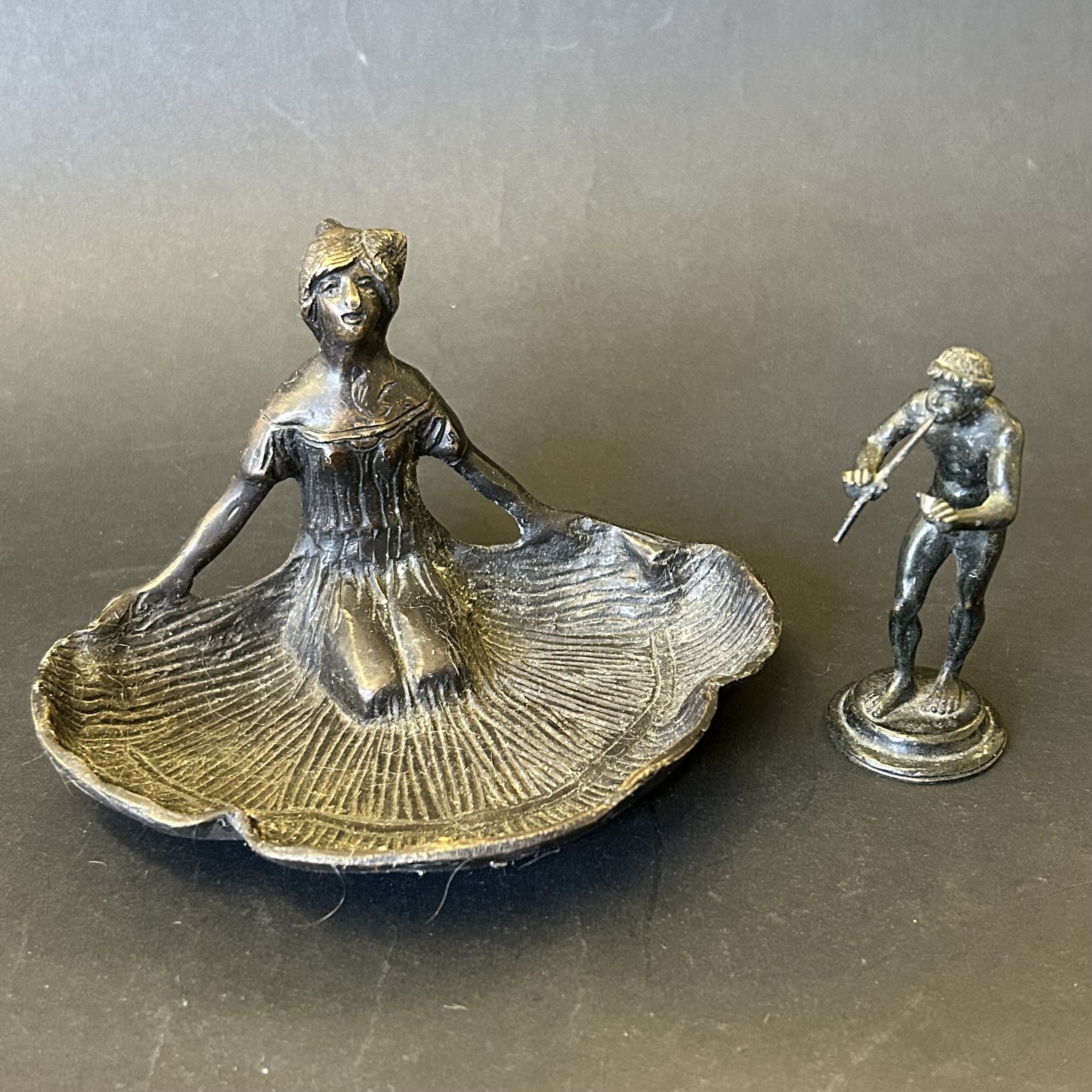 An Art Nouveau style bronze female figure, approx. 6" wide plus a 19th Century small bronze classical figure, possibly of Pan, approx. 3 1/2" tall