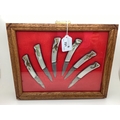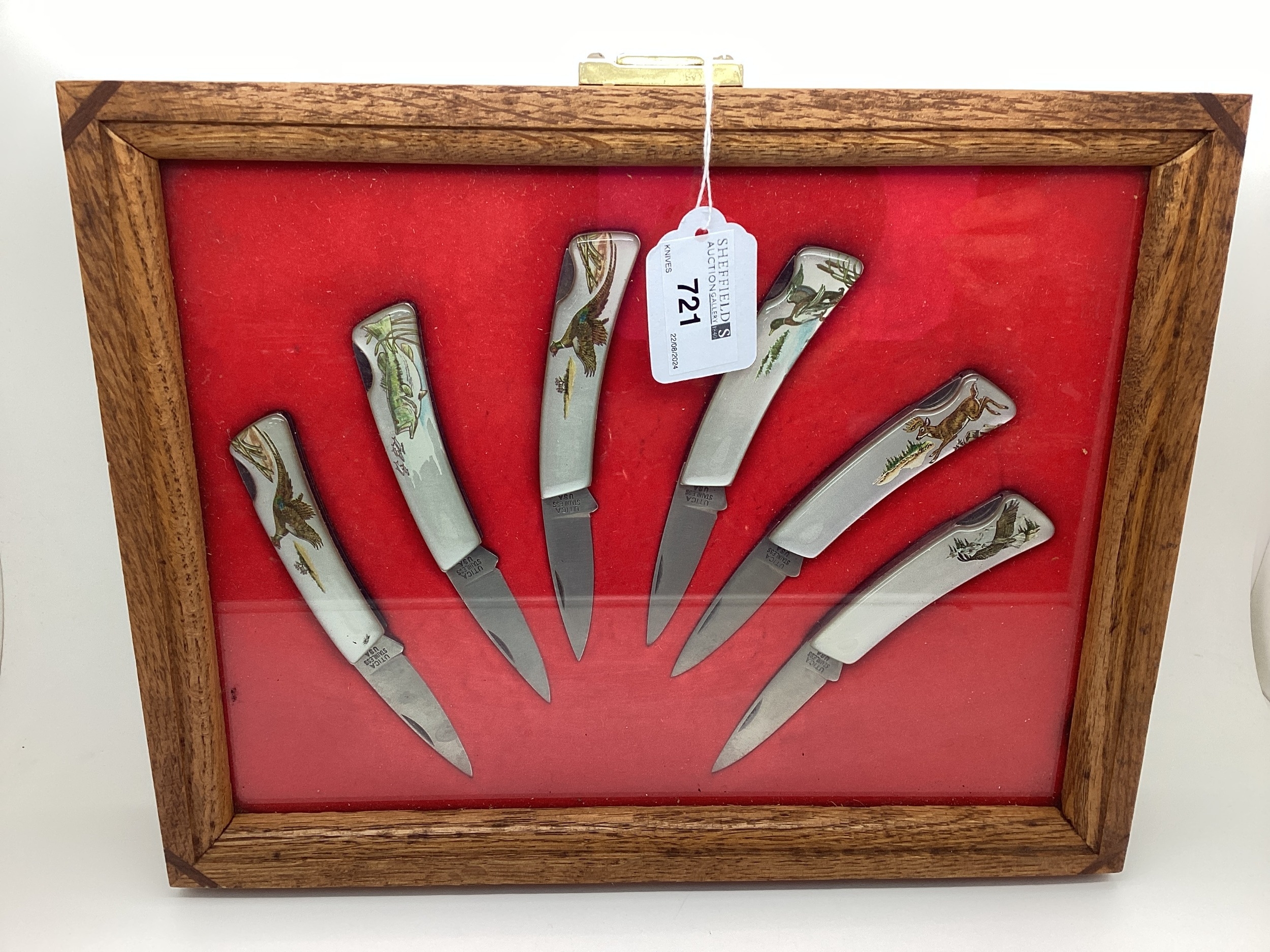 Six Utica USA Folding Pocket Knives, in plush display case (case 30.2cm wide).