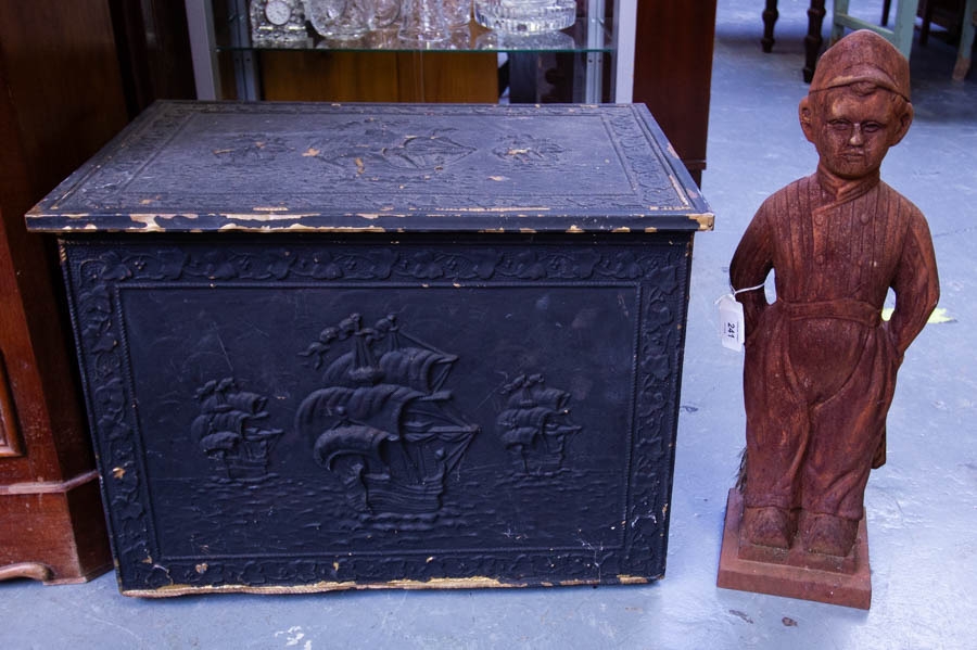CAST IRON RUSTY FIGURE OF BOY FIRE TIDY 50H CM + BLACK COAL BOX